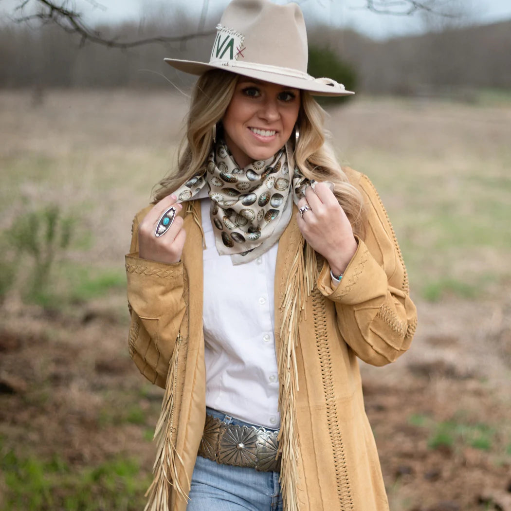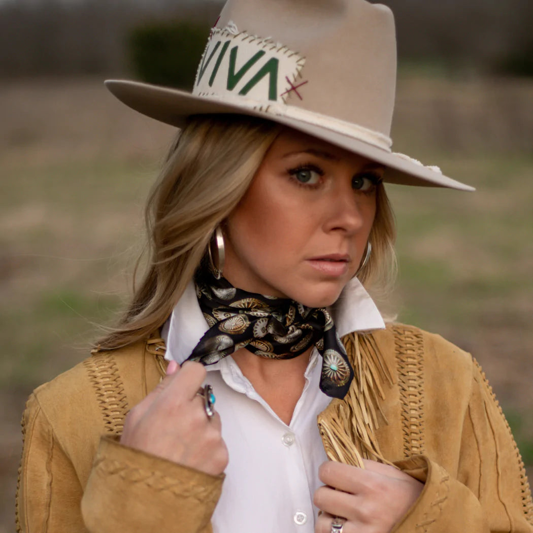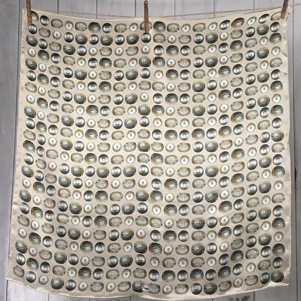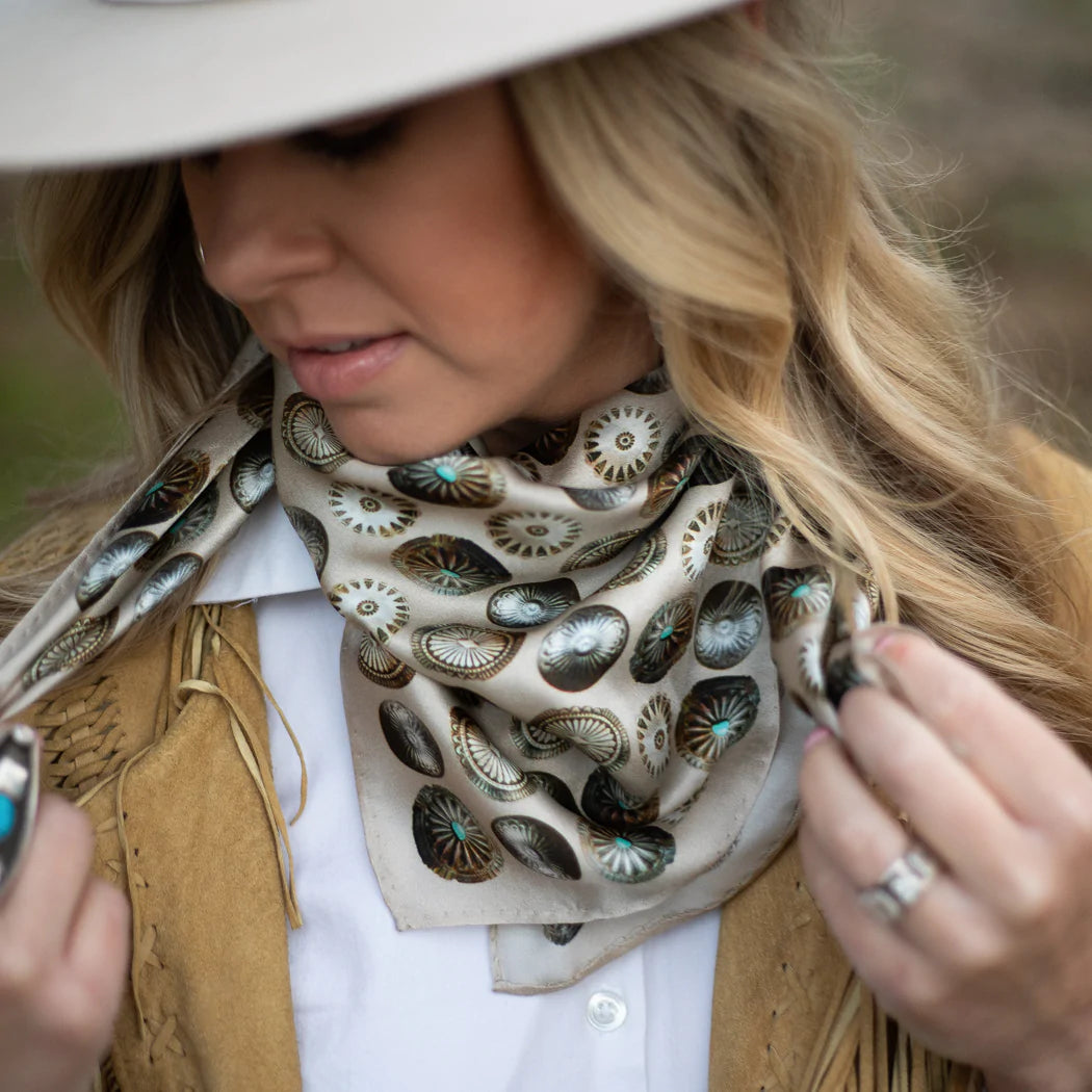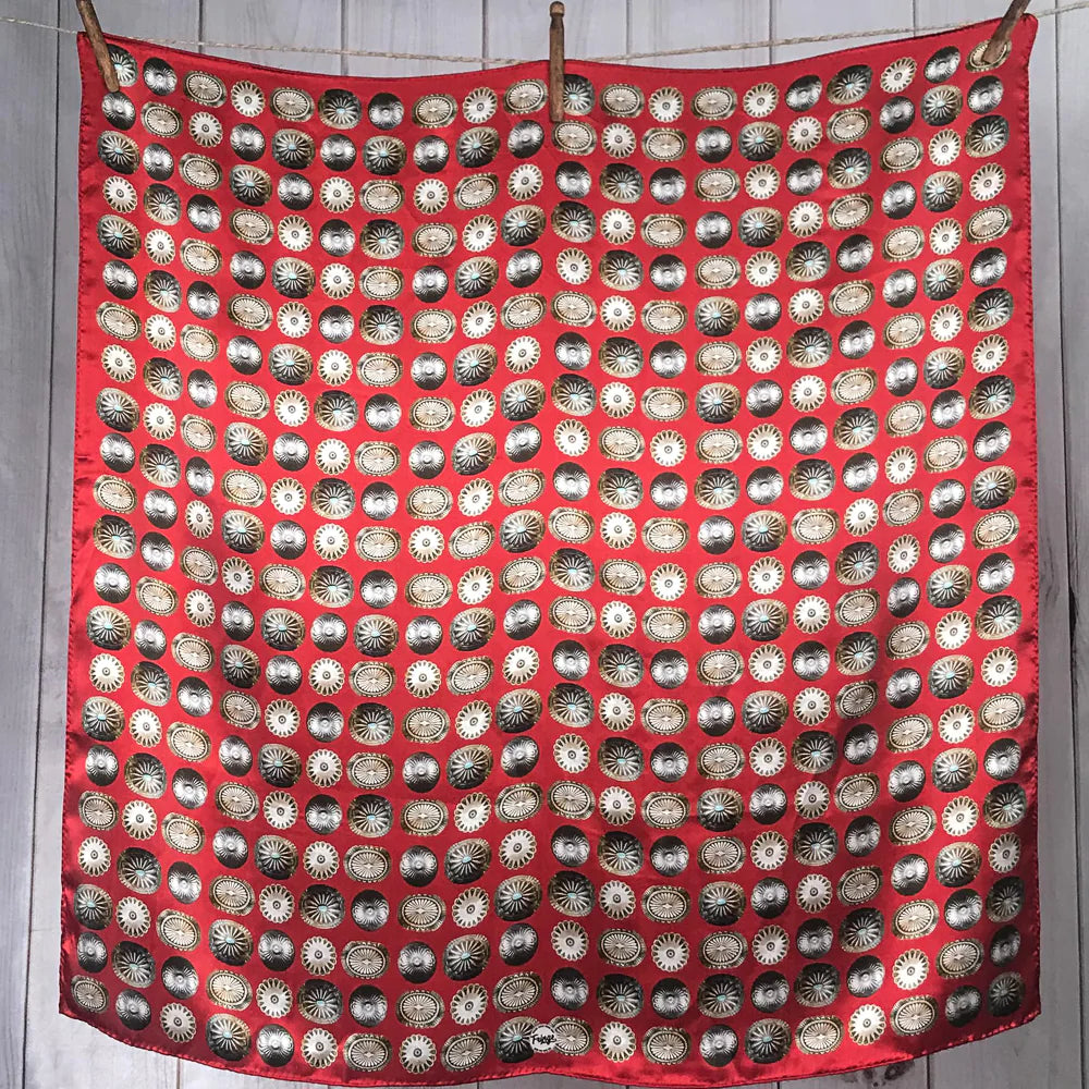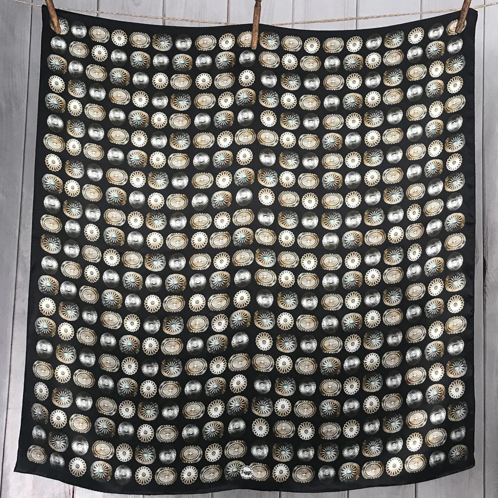 "Buy a scarf, save a necklace!" For those of you who love silver jewelry but want to shake it up a bit, this large 35x35 12mm Satin Silk scarf will do the trick! The Baby Concho is a spin off from our popular Big Concho line.