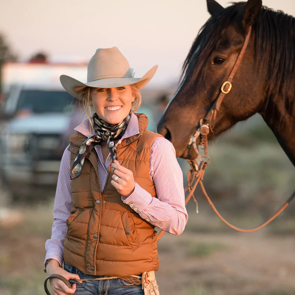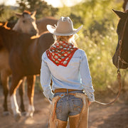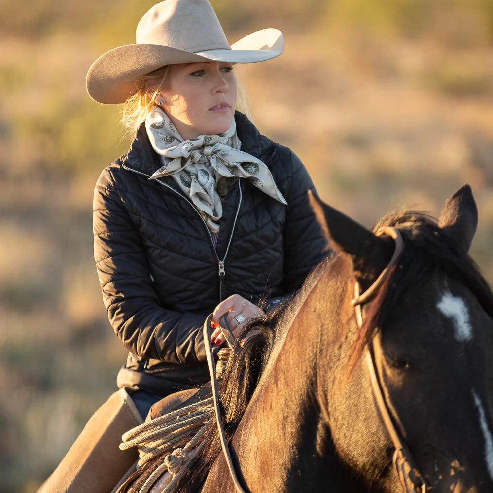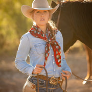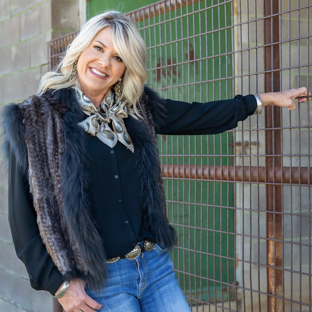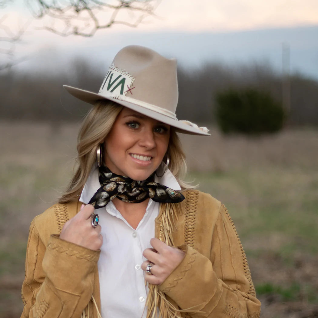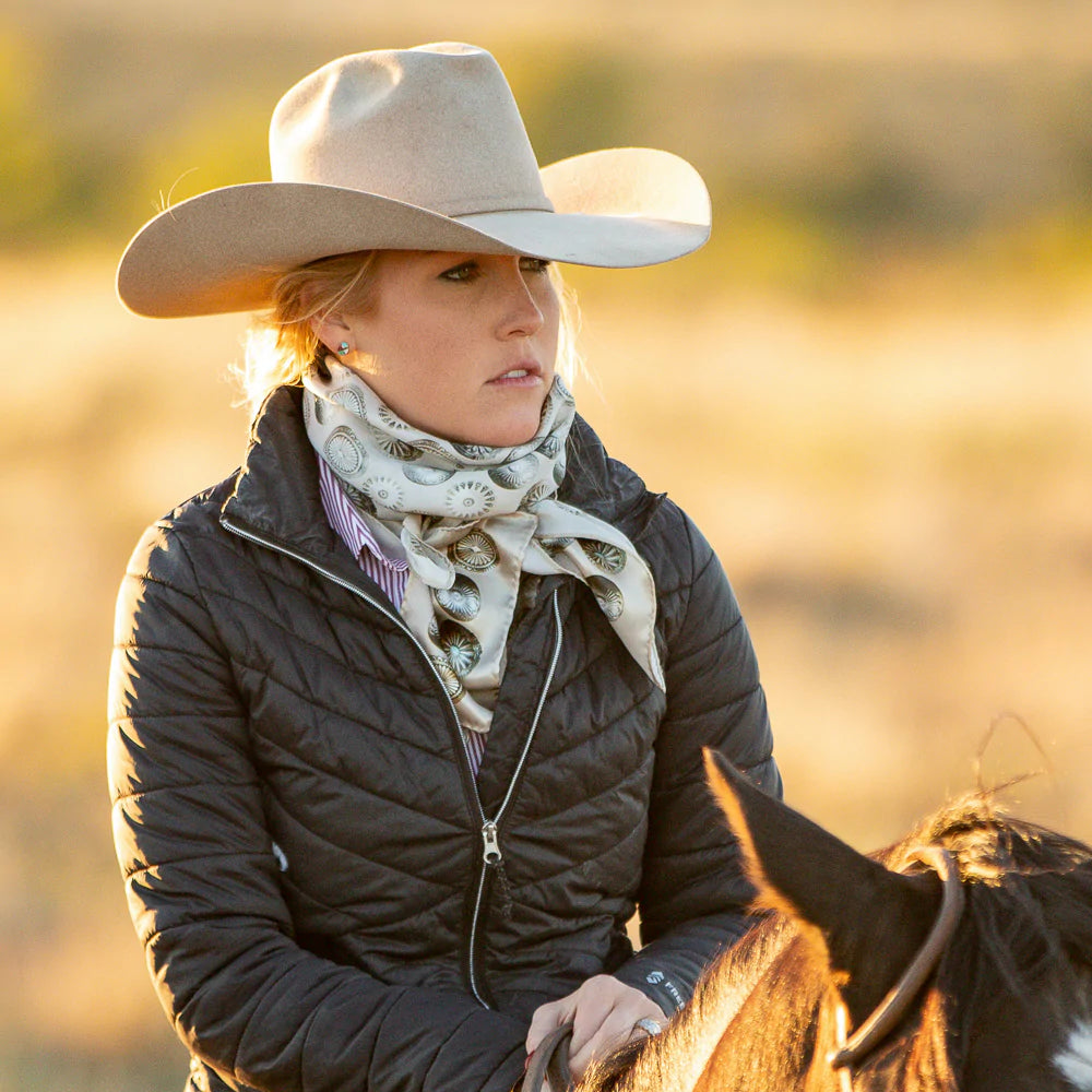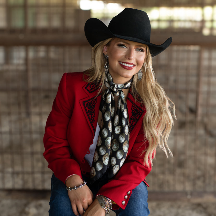 "Buy a scarf, save a necklace!" For those of you who love silver jewelry but want to shake it up a bit, this large 35x35 12mm Satin Silk scarf will do the trick! The Baby Concho is a spin off from our popular Big Concho line.