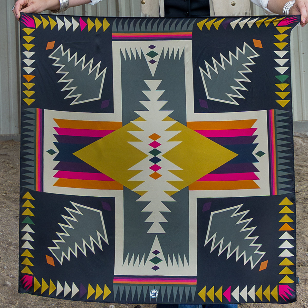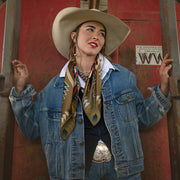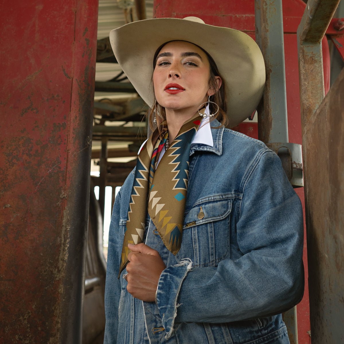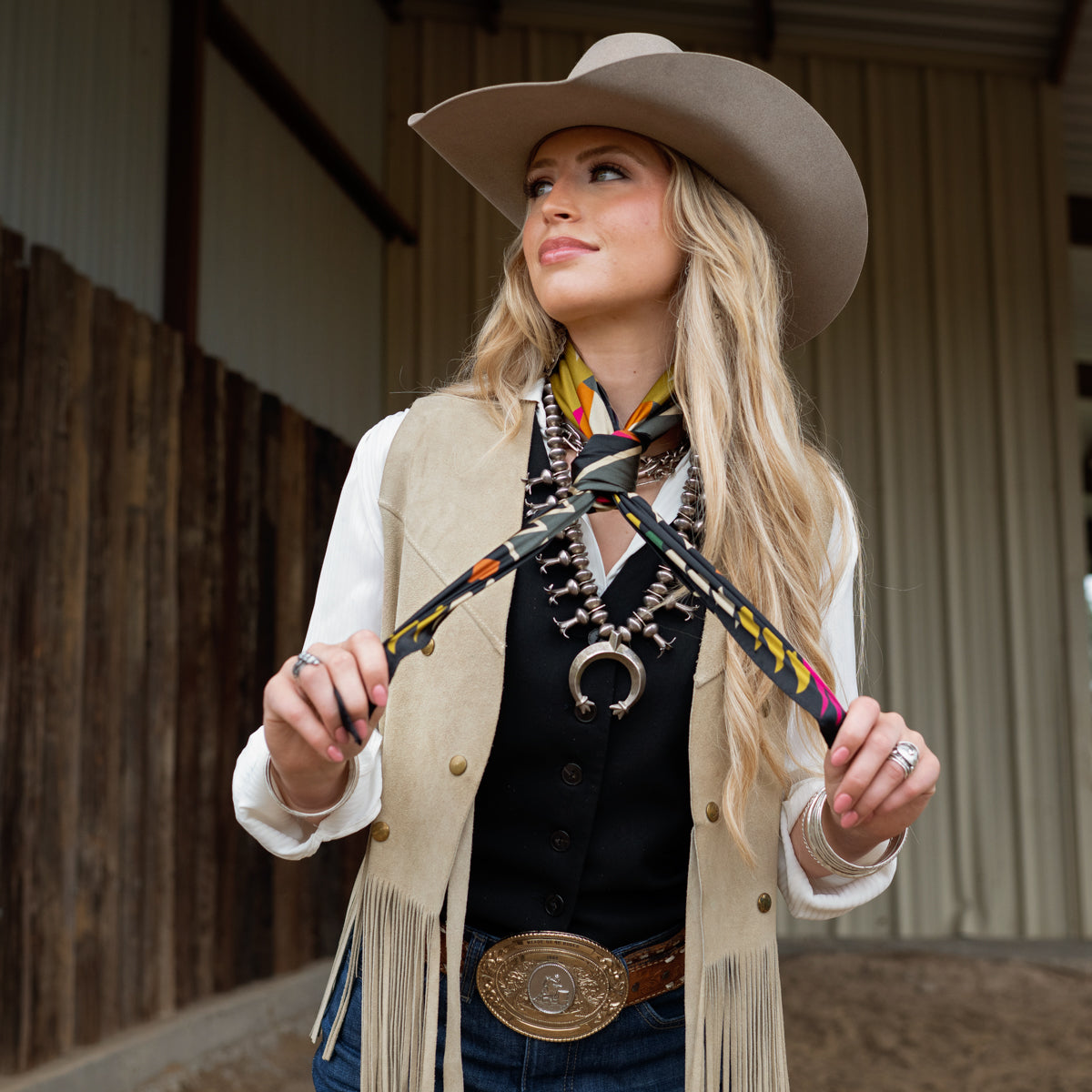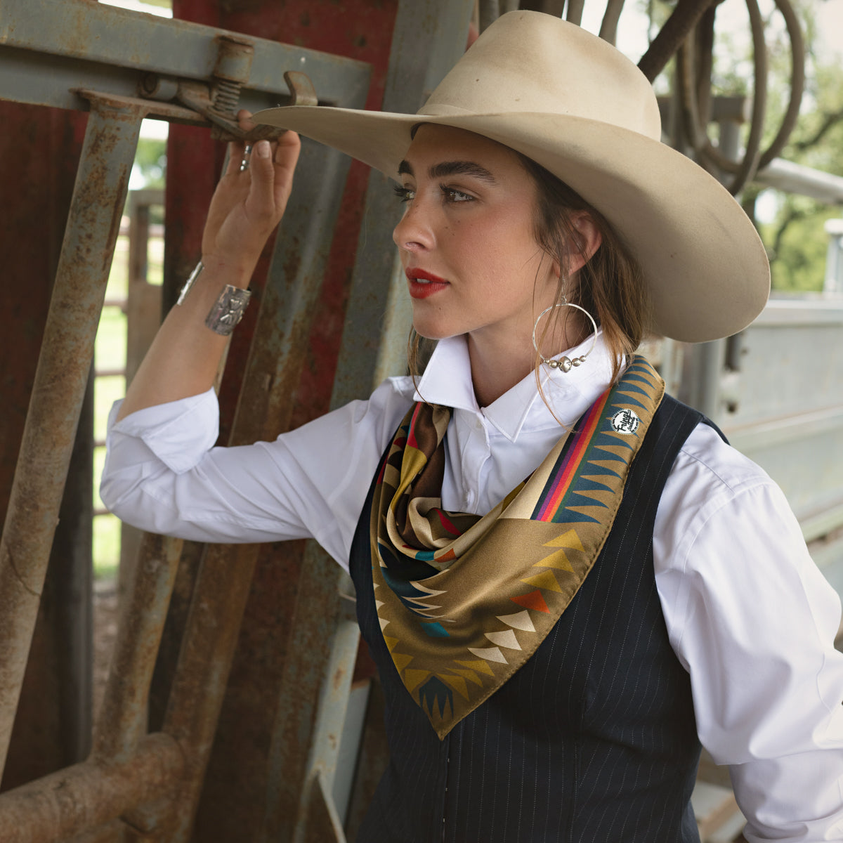 The Cross Me silk scarf is available in both our 35" Long-Tall and our 26" Shorty and are 100% Satin Silk. It honors the spirit of the Southwest—where tradition, nature, and the sacred cycles of life intersect, made for those who walk their own path.