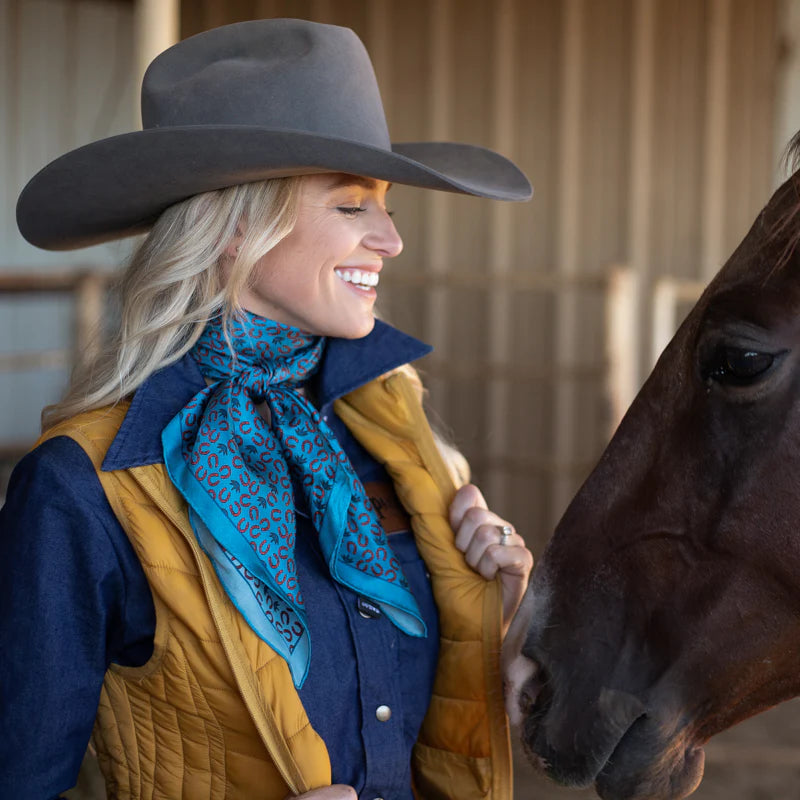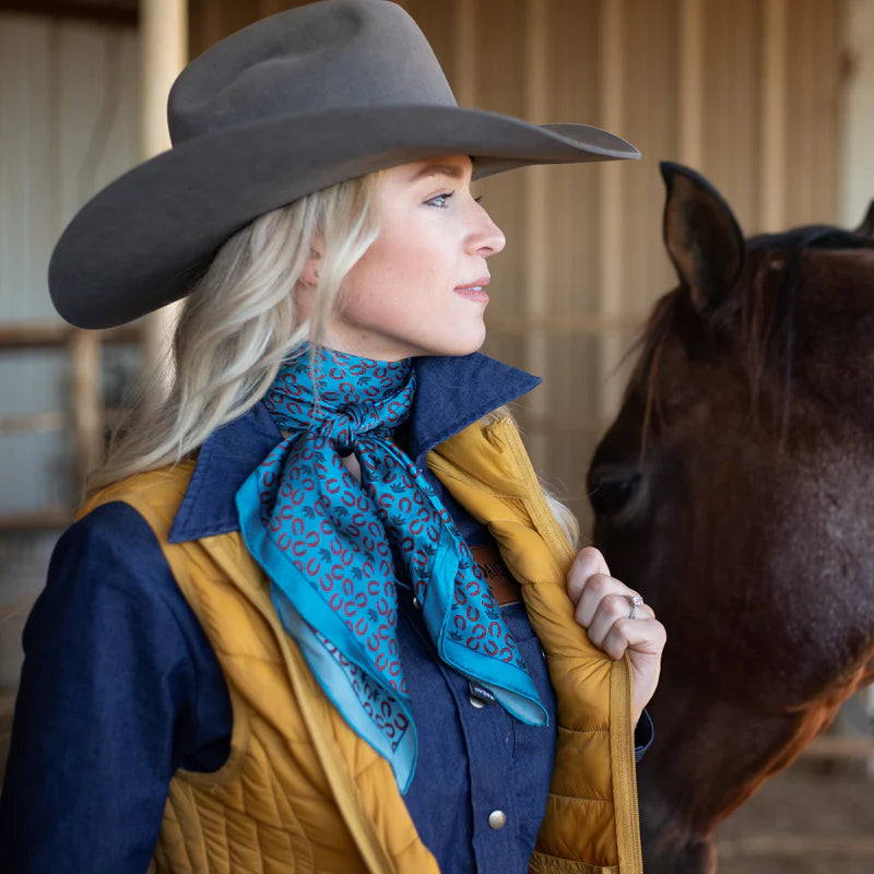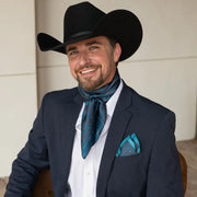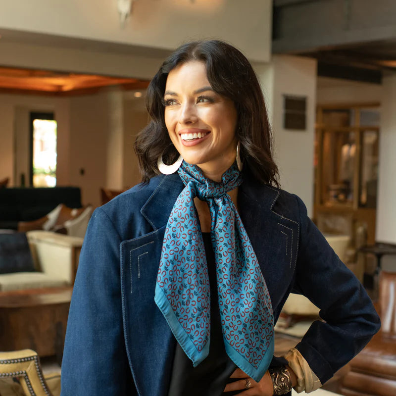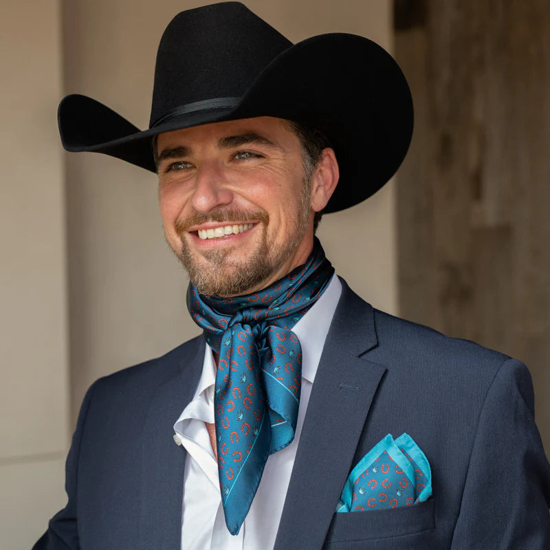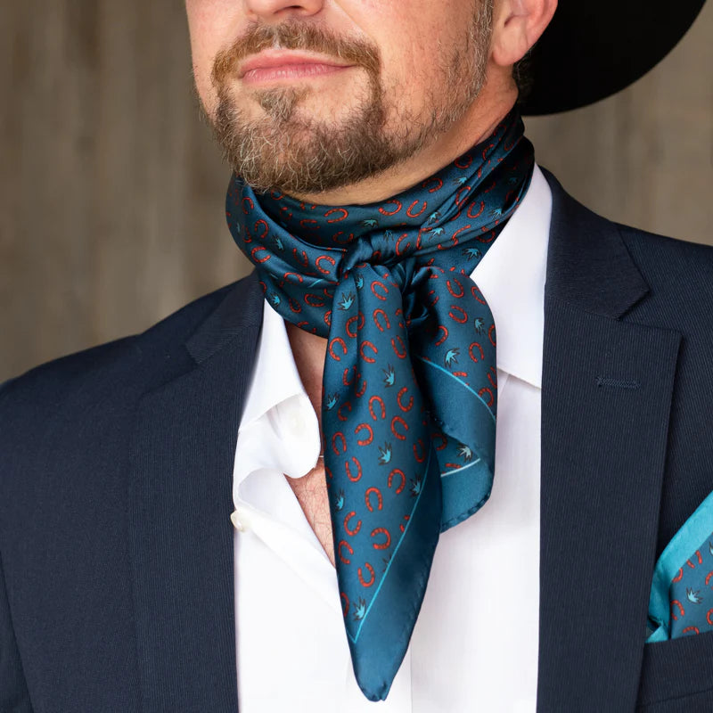 Shown is our 12mm 100% Executive Horseshoe/agave wild rag. We’ve been wanting to bring you a line of men’s ties, wild rags and pocket squares for some time. Wild rags consisting of iconic elements of the West, like: longhorns and saguaro and horseshoes and agave. Offered in different color combinations for the arena, out in the pasture or at your next meeting. Look for corresponding pocket squares and neck ties.
