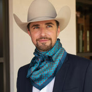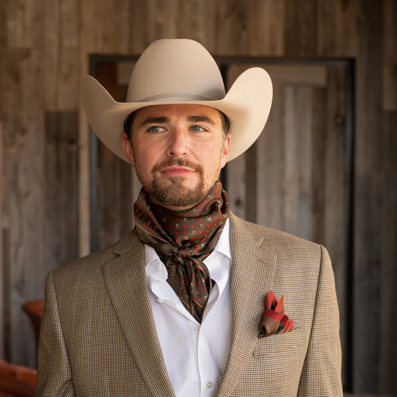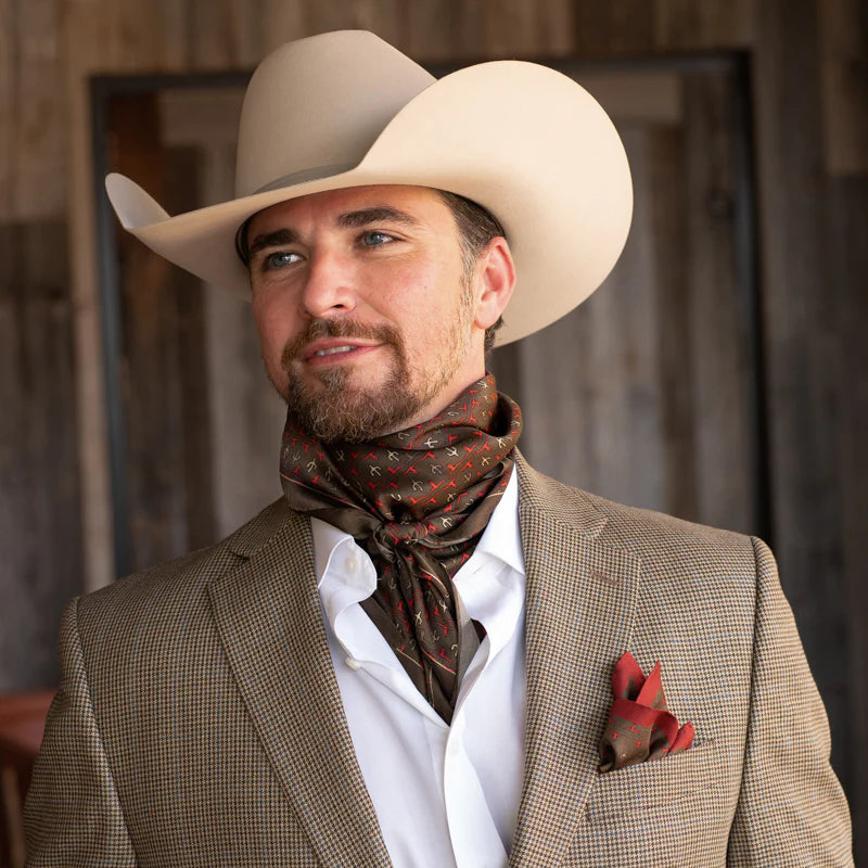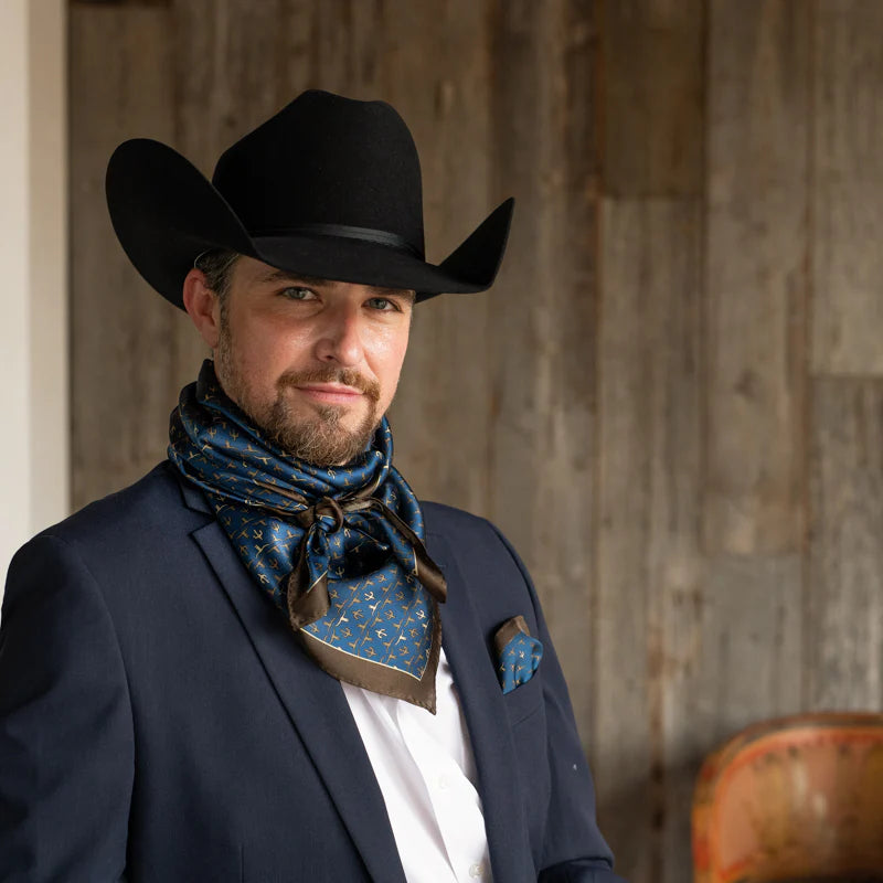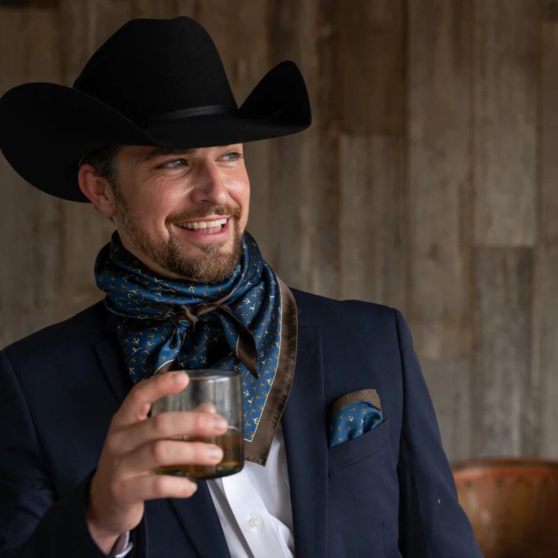 Shown is our 12mm 100% Silk, our Executive Longhorn/Saguaro wild rag. We’ve been wanting to bring you a line of men’s ties, wild rags and pocket squares for some time. Wild rags consisting of iconic elements of the West, like: longhorns and saguaro and horseshoes and agave. Offered in different color combinations for the arena, out in the pasture or at your next meeting. Look for corresponding pocket squares and neck ties.