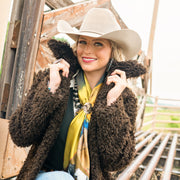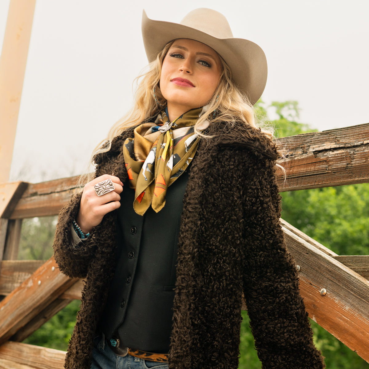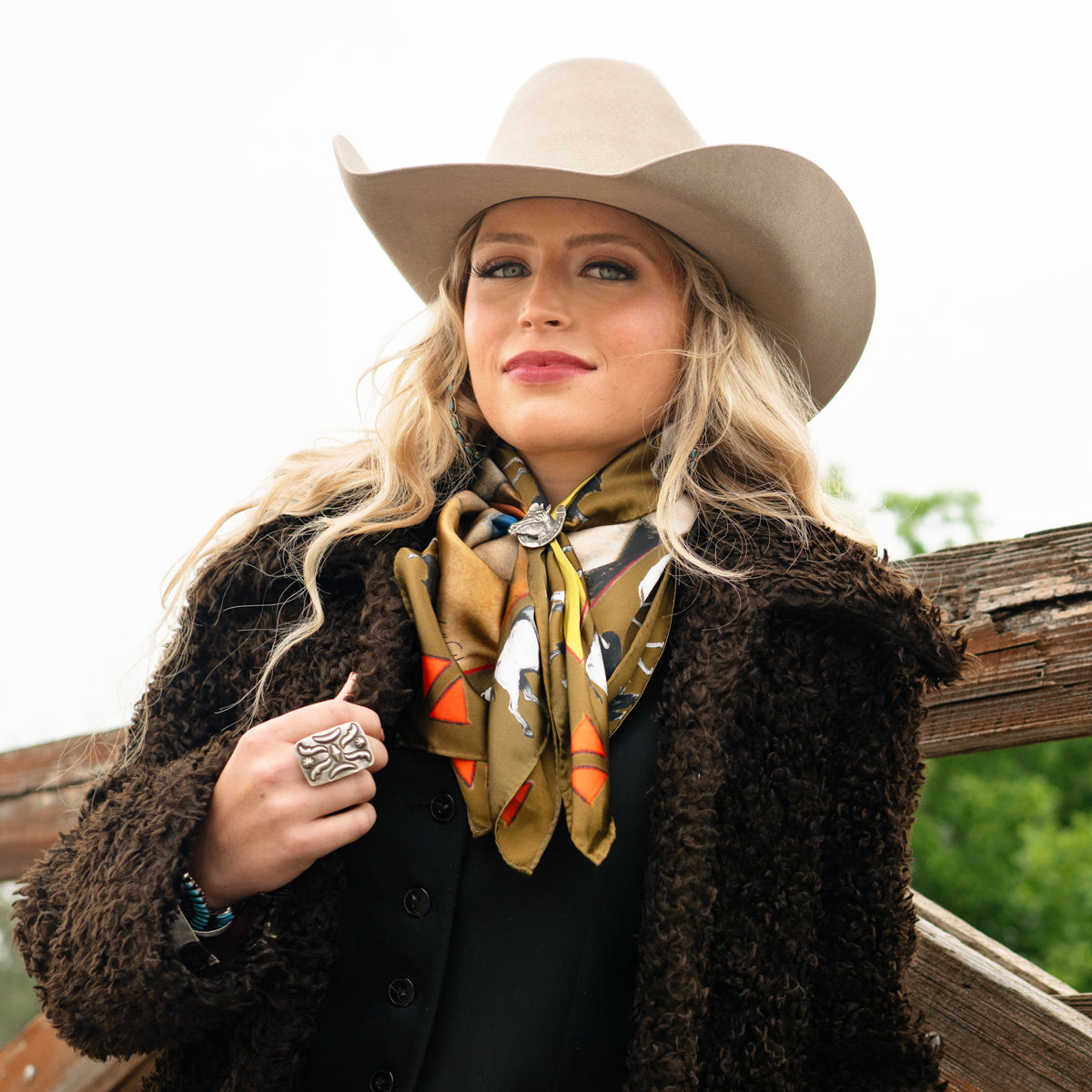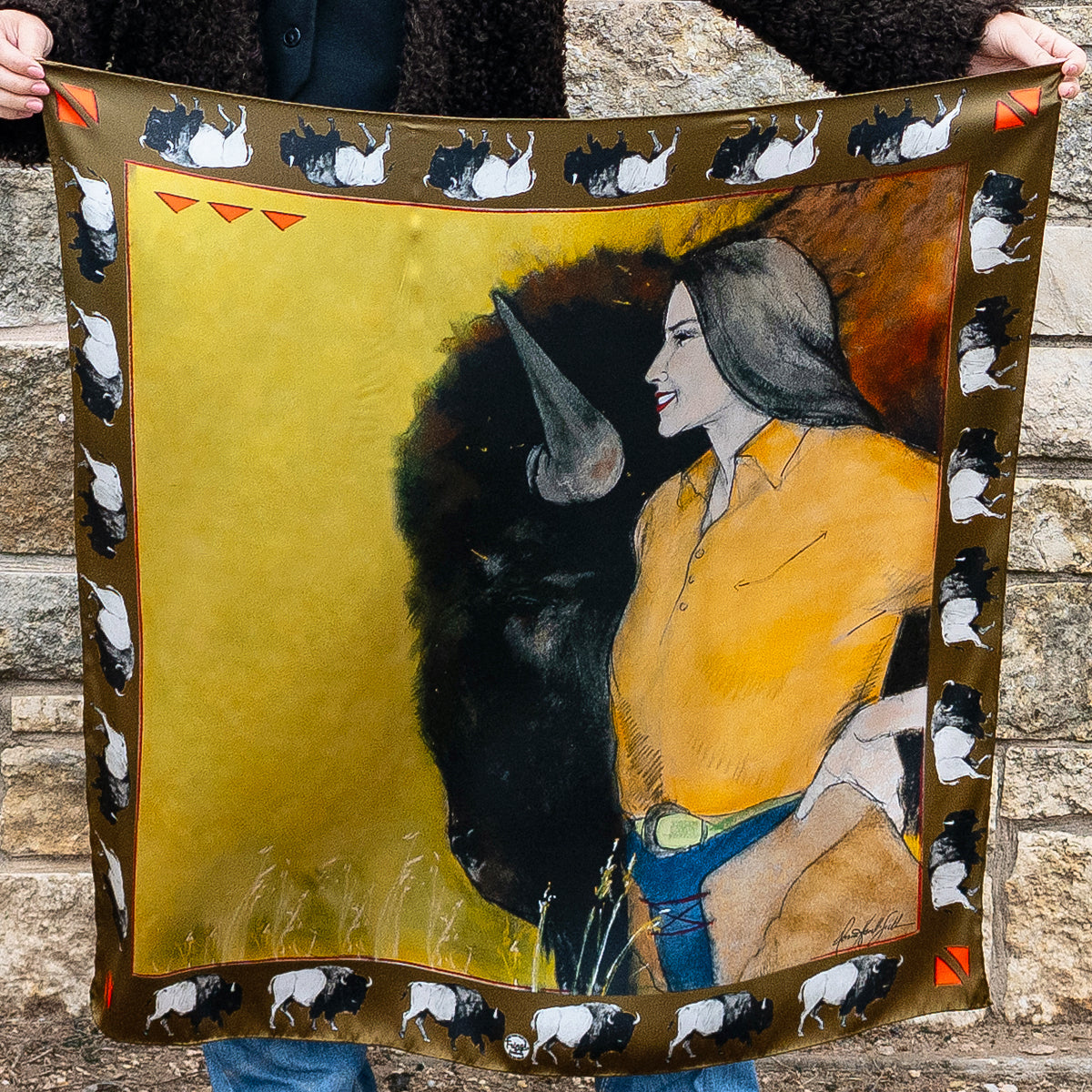 Girl & Bison is a powerful new design that captures a quiet, commanding moment—a woman standing shoulder to shoulder with a bison, the enduring symbol of the American frontier. With bold lines, soft earthy tones, and a whimsical bison border, this scarf embodies connection, courage, and the untamed heart of the West.