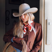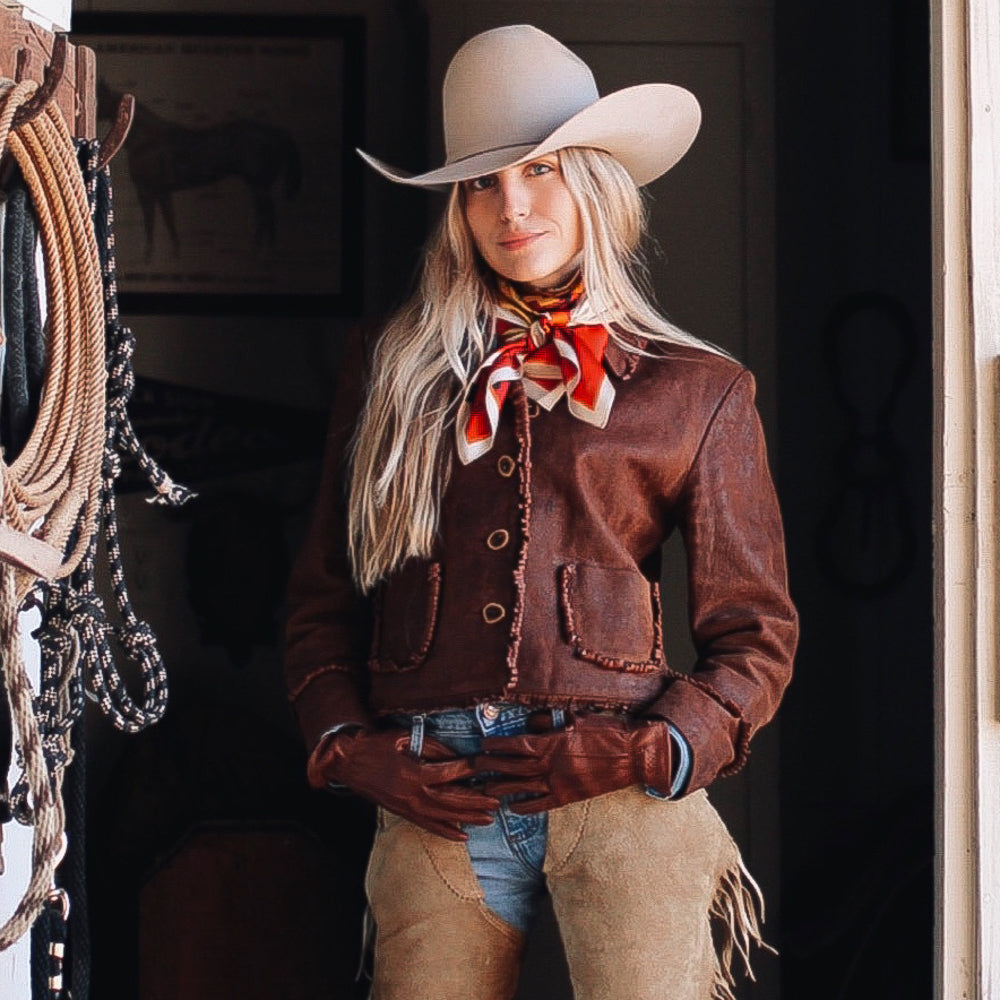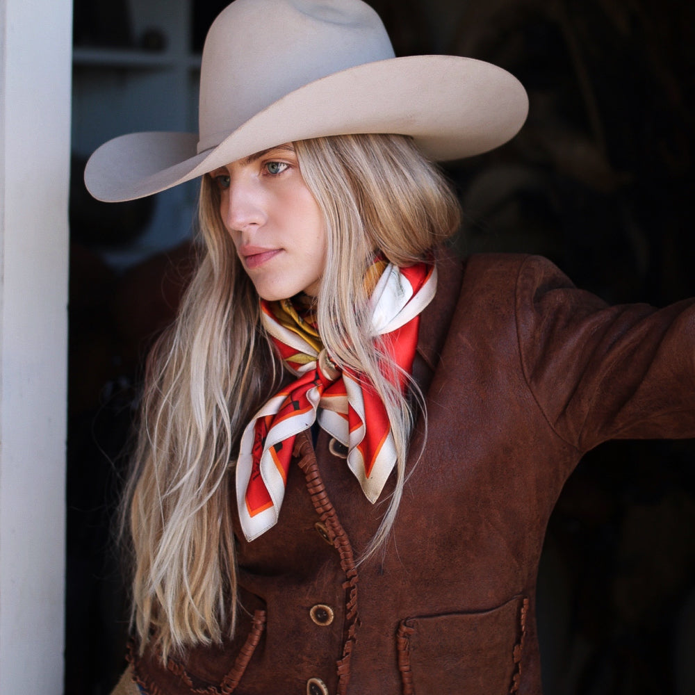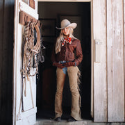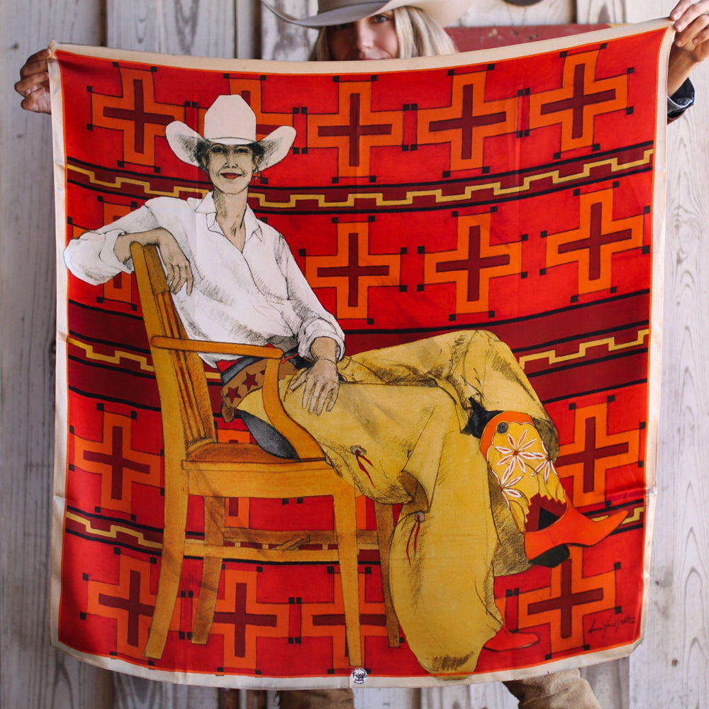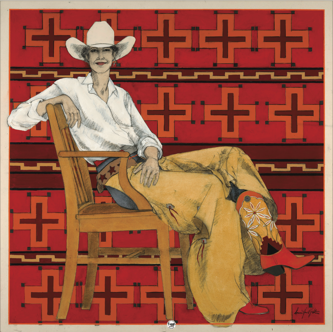 Shown here is I Have At Least 19 Opinions, one of three pieces Donna did for the Fringe Artist Collection. The colors are bold and brilliant and we love the contrast of red with the earthy leather in her chaps. Perfect with denim, a crisp white shirt, or your favorite leather jacket.
