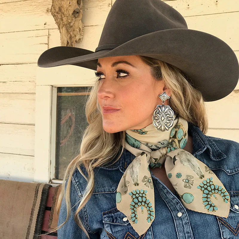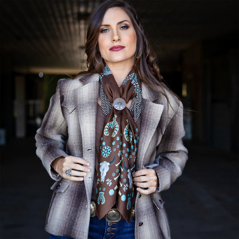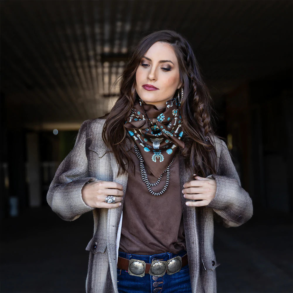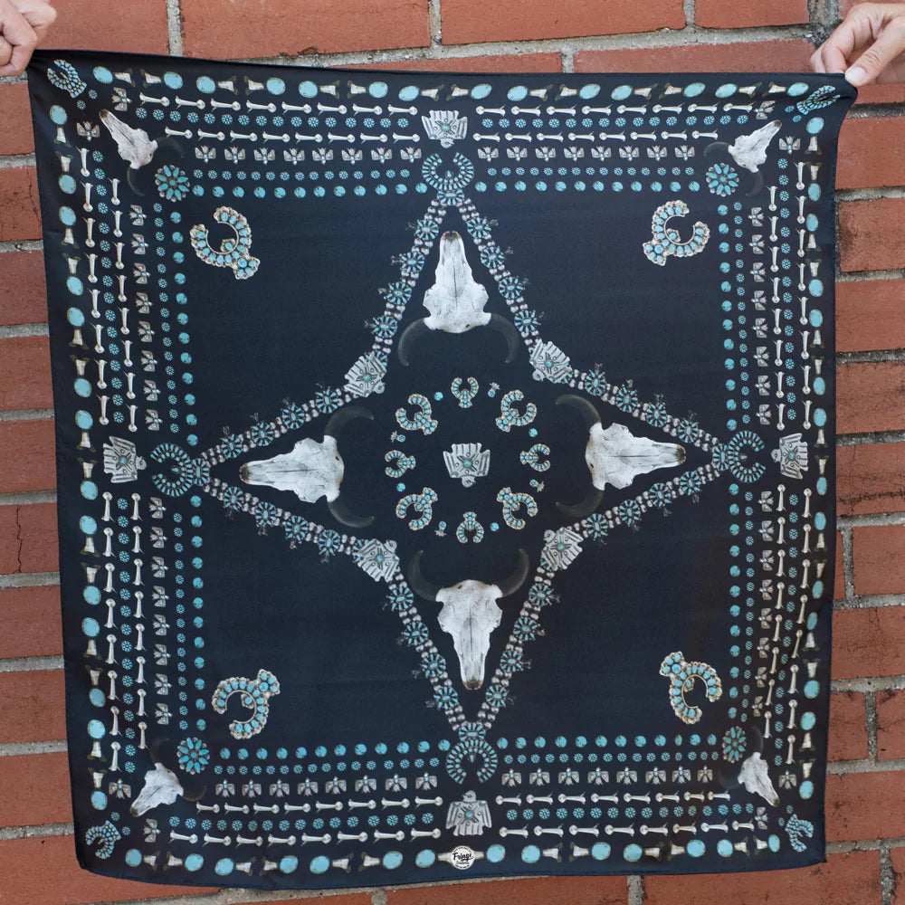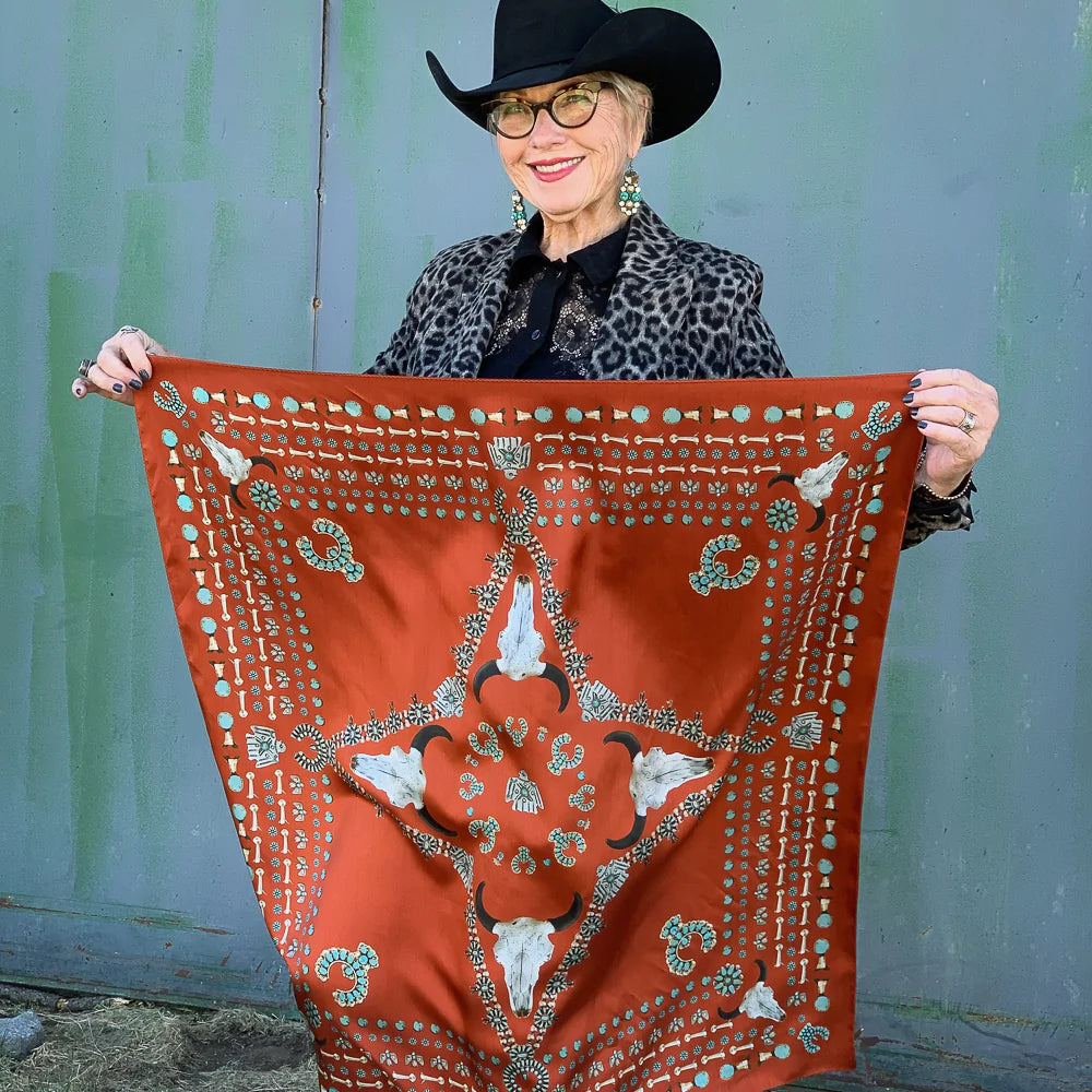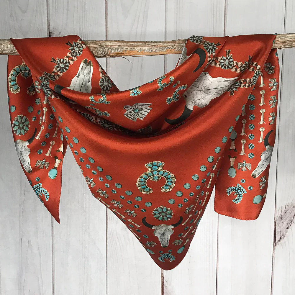 We all love some good vintage turquoise and silver, add to that a buffalo skull and viola... the Squash Blossomed 100% silk scarf.
