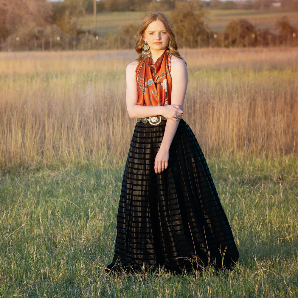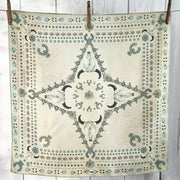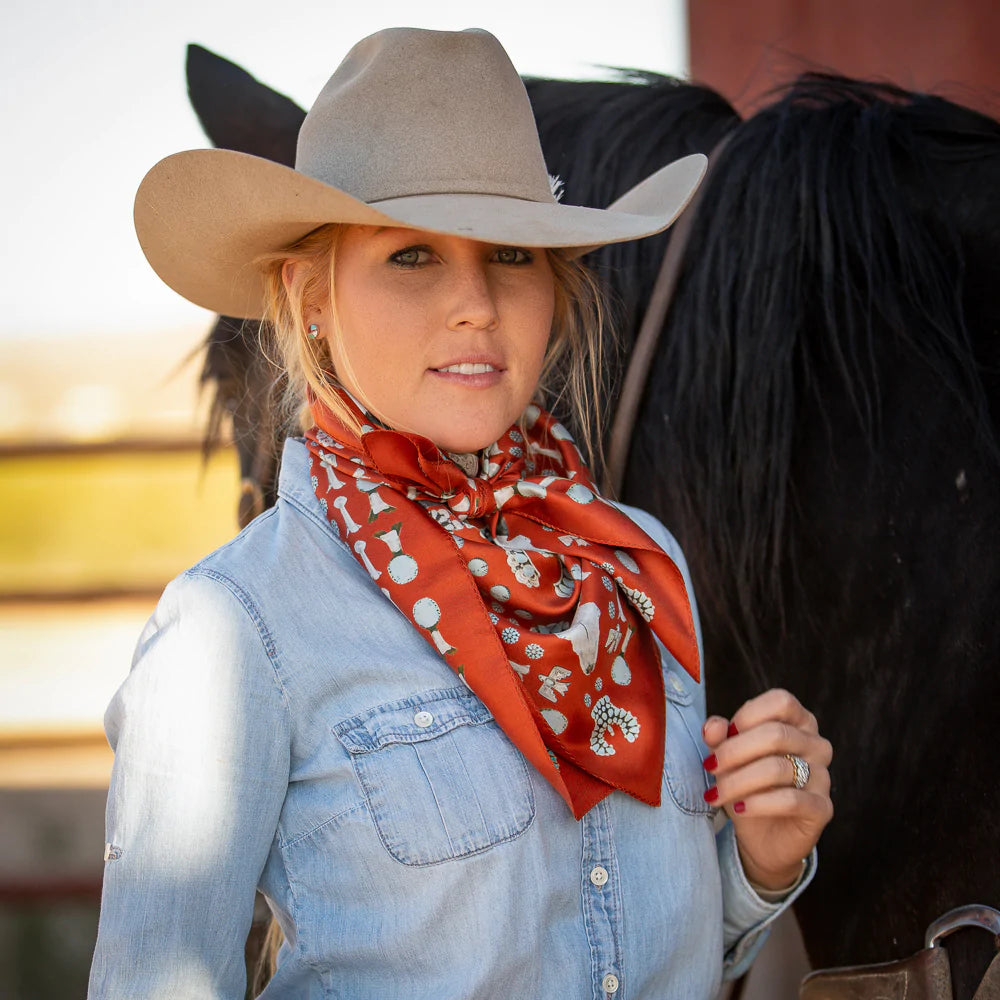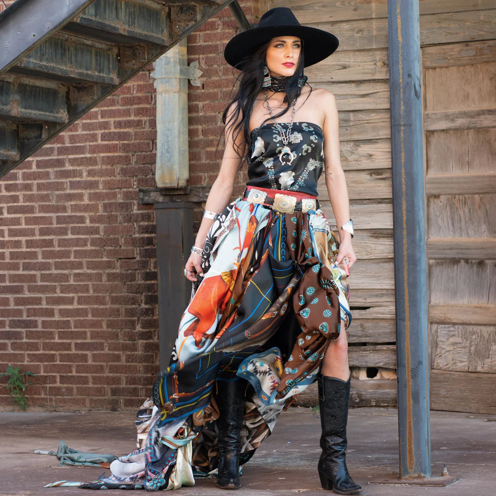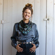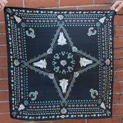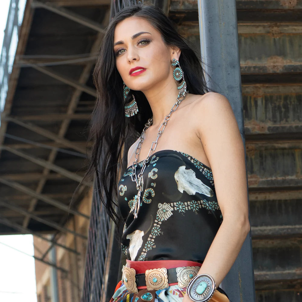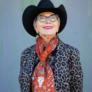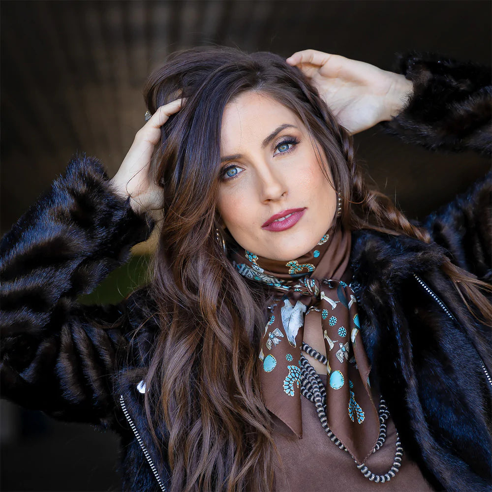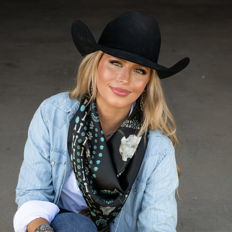 We all love some good vintage turquoise and silver, add to that a buffalo skull and viola... the Squash Blossomed 100% silk scarf.