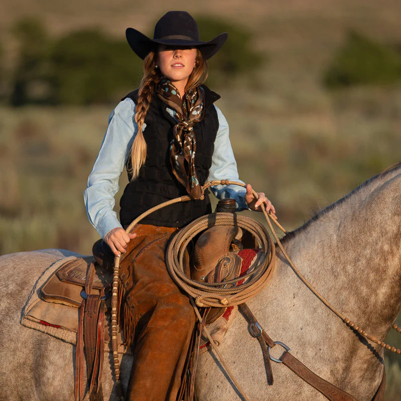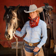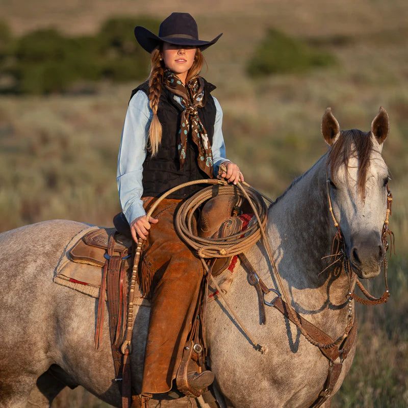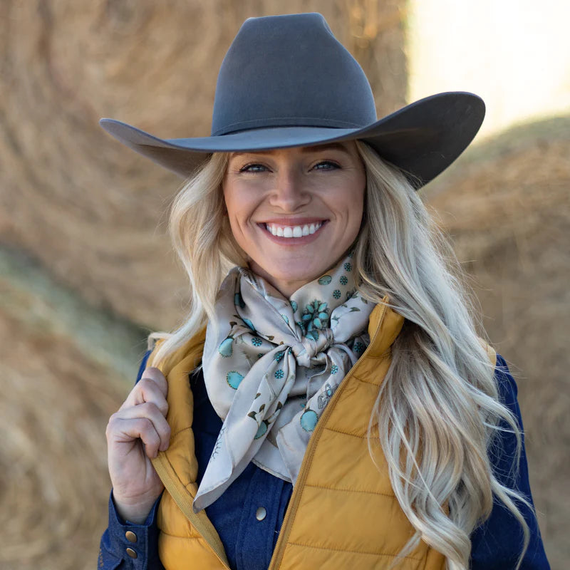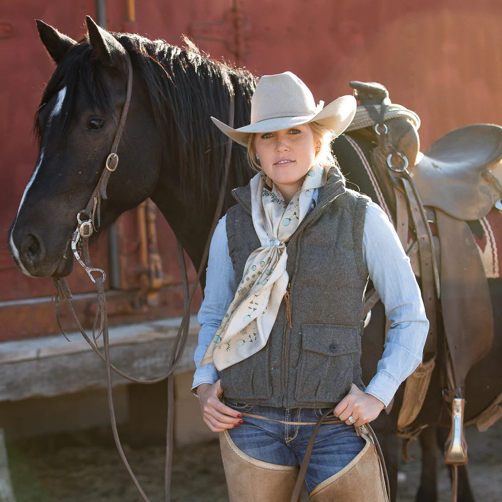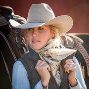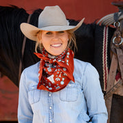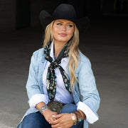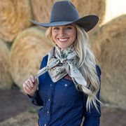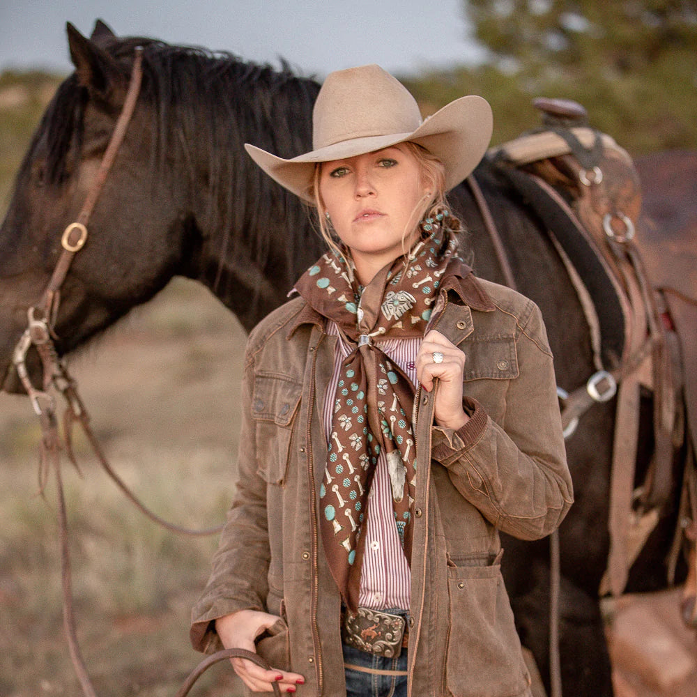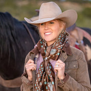 This wild rag has a rustic, earthy, desert, vintage feel and goes with so many classic inspired outfits. We added a vintage patina to this scarf to give it that distressed worn look.