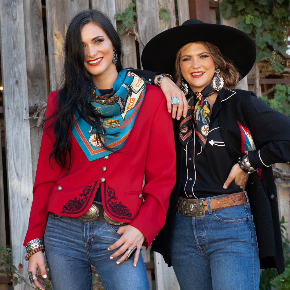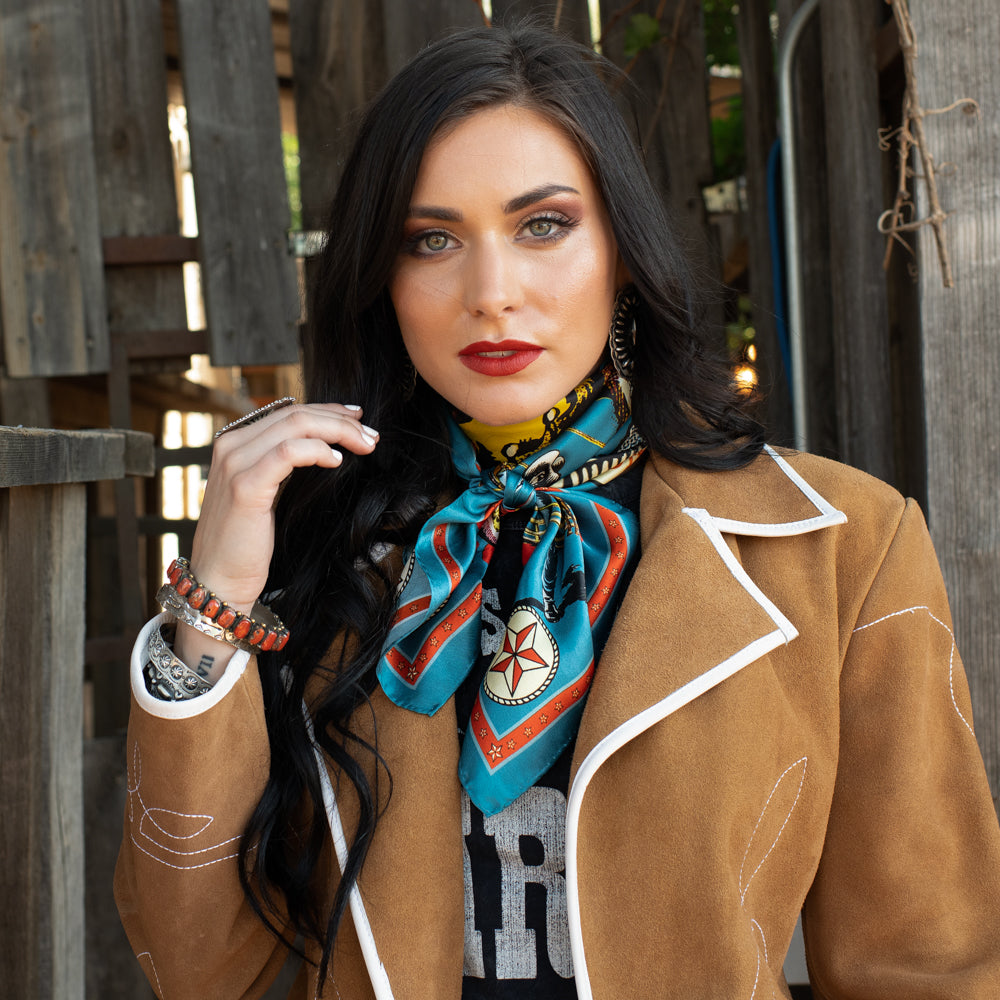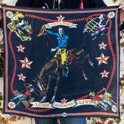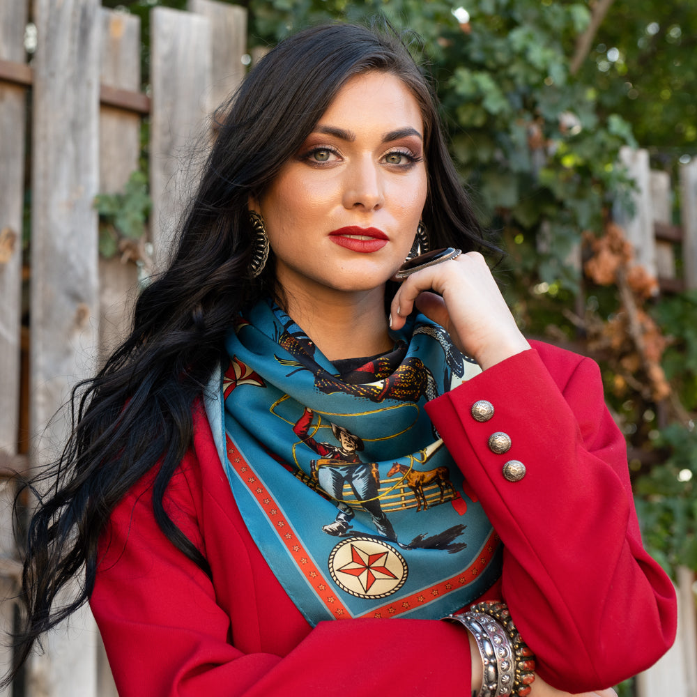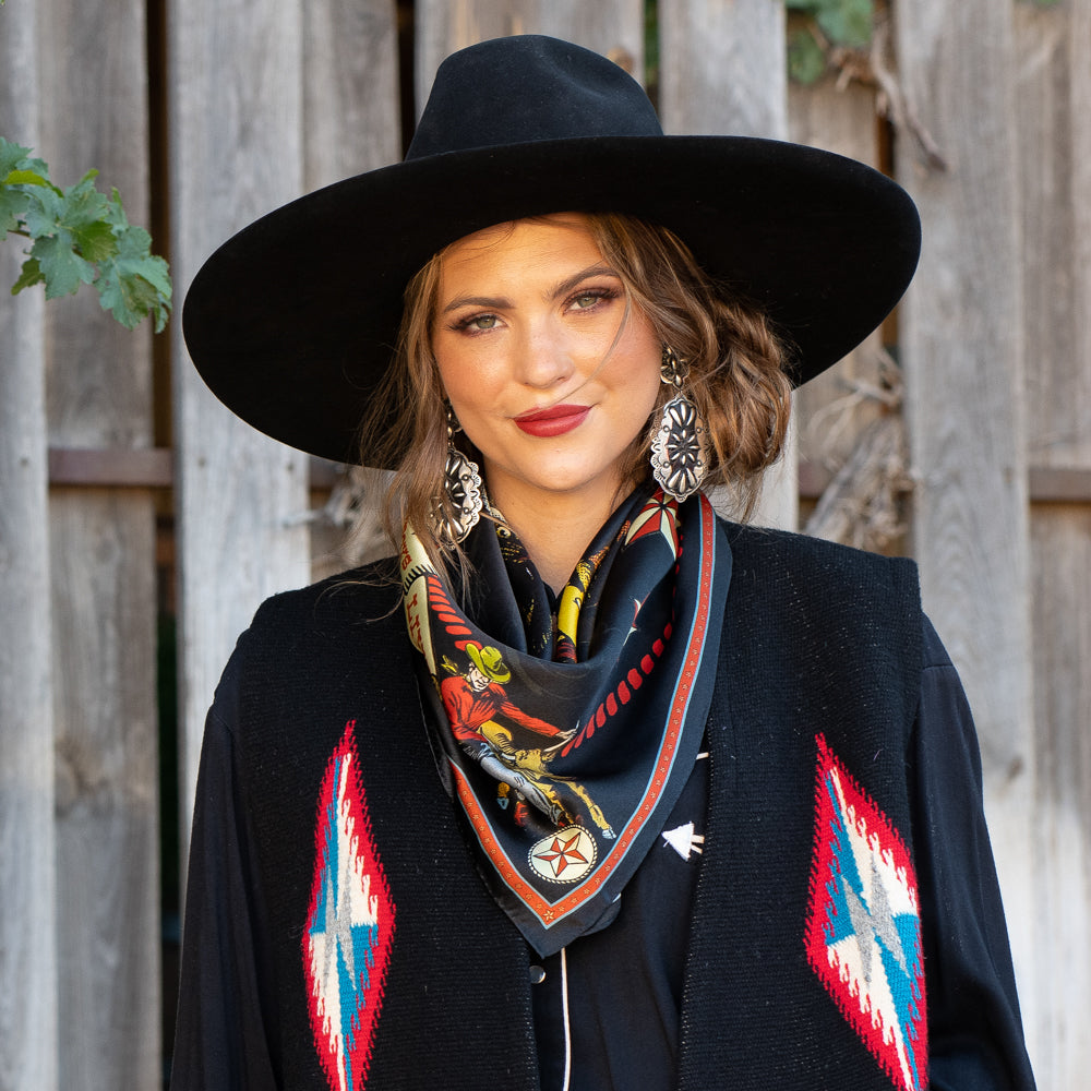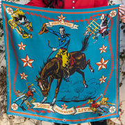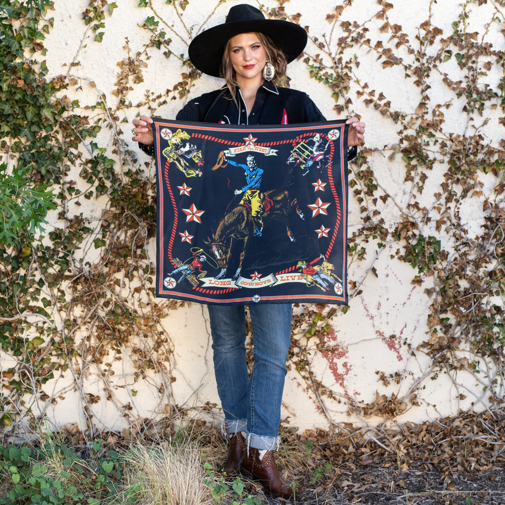 The Star Of The West is a 100% Satin Silk wild rag that has a BIG retro vibe to it! Vintage cowboy graphics with rope border and stars highlighting corners. This is a fun one and will last for years to come!