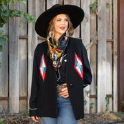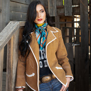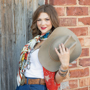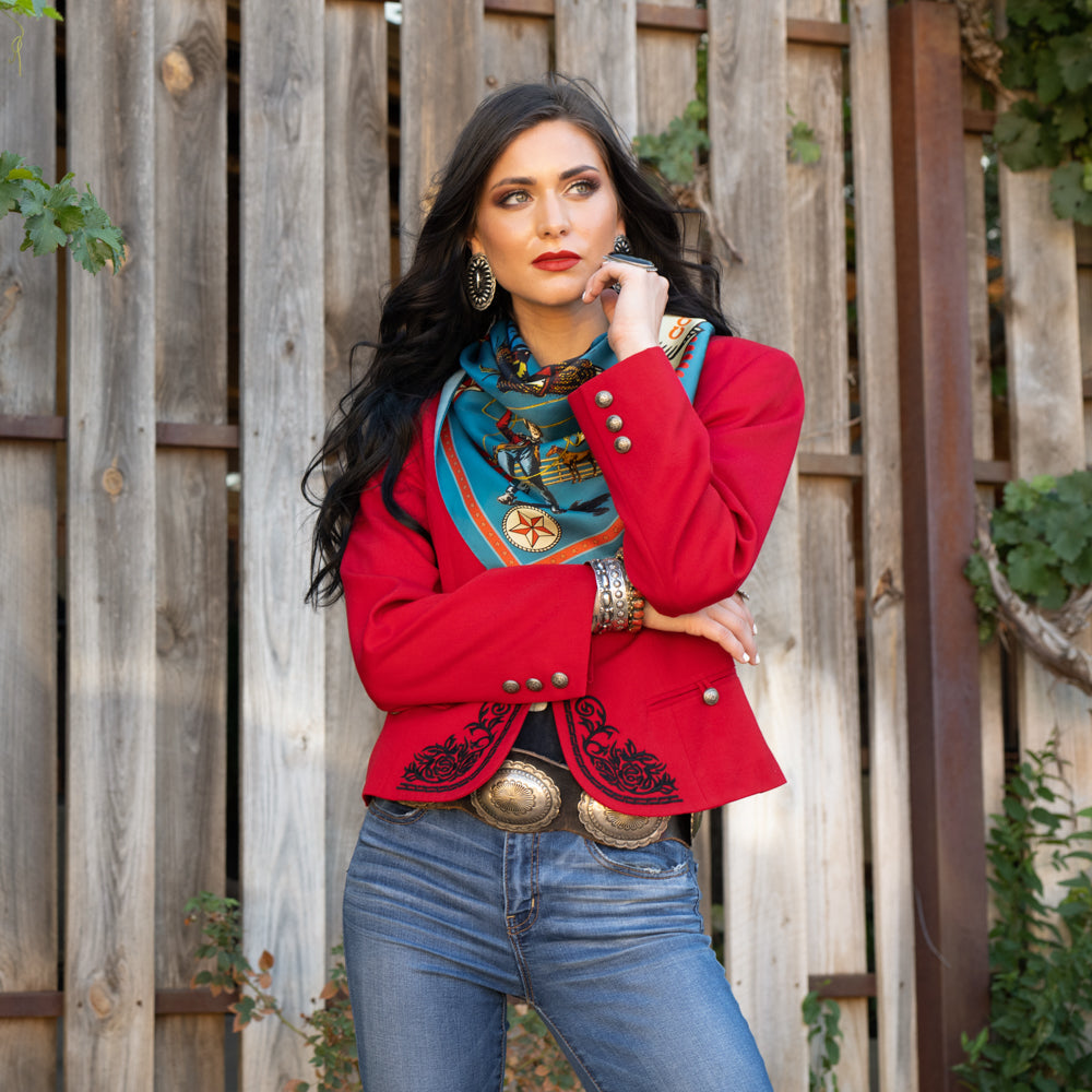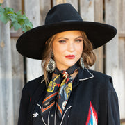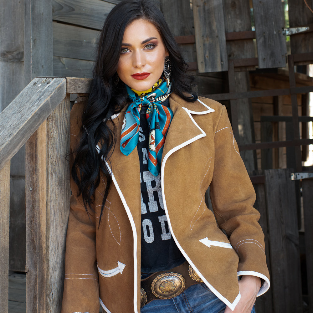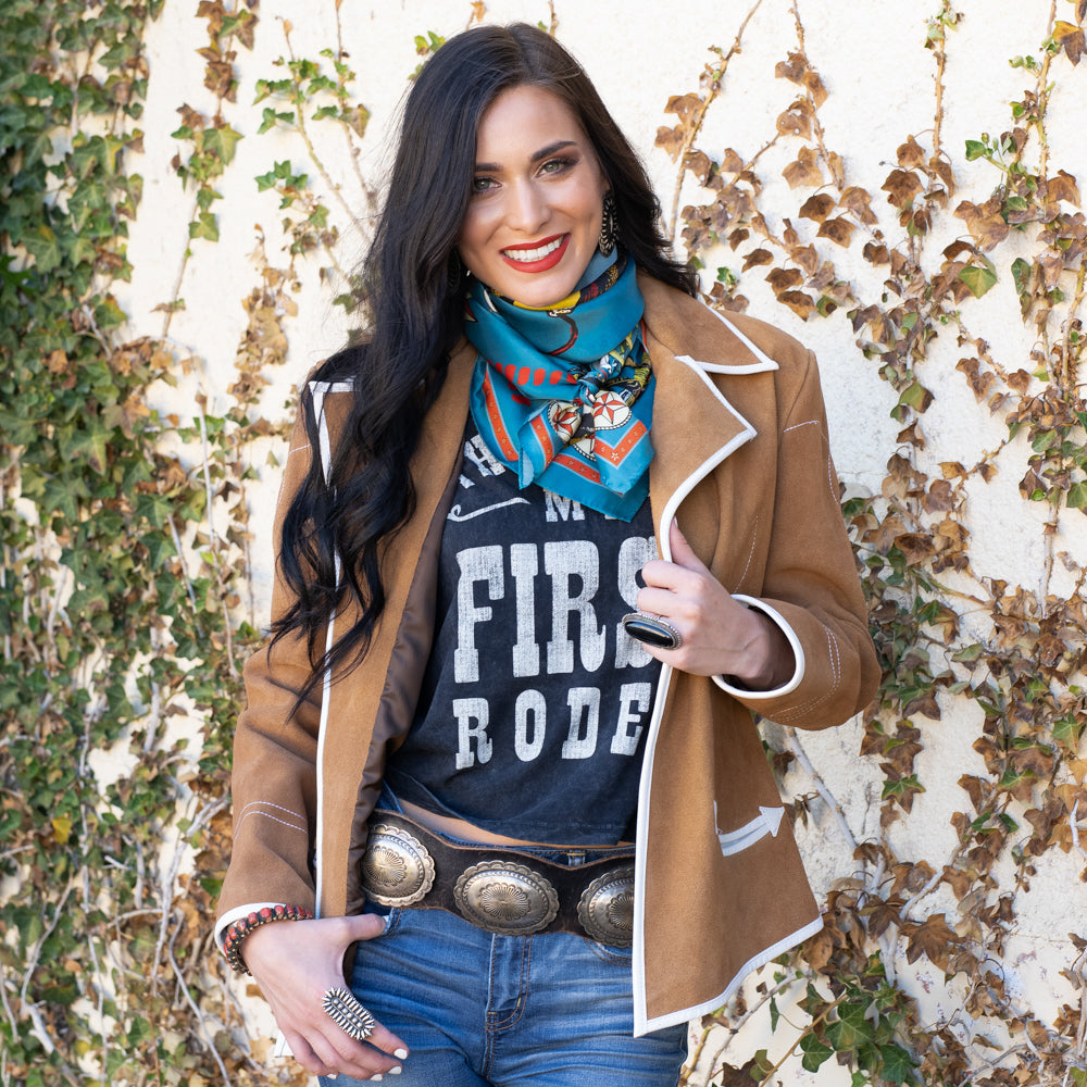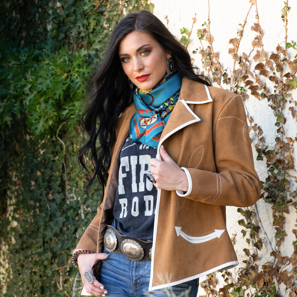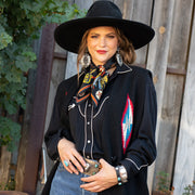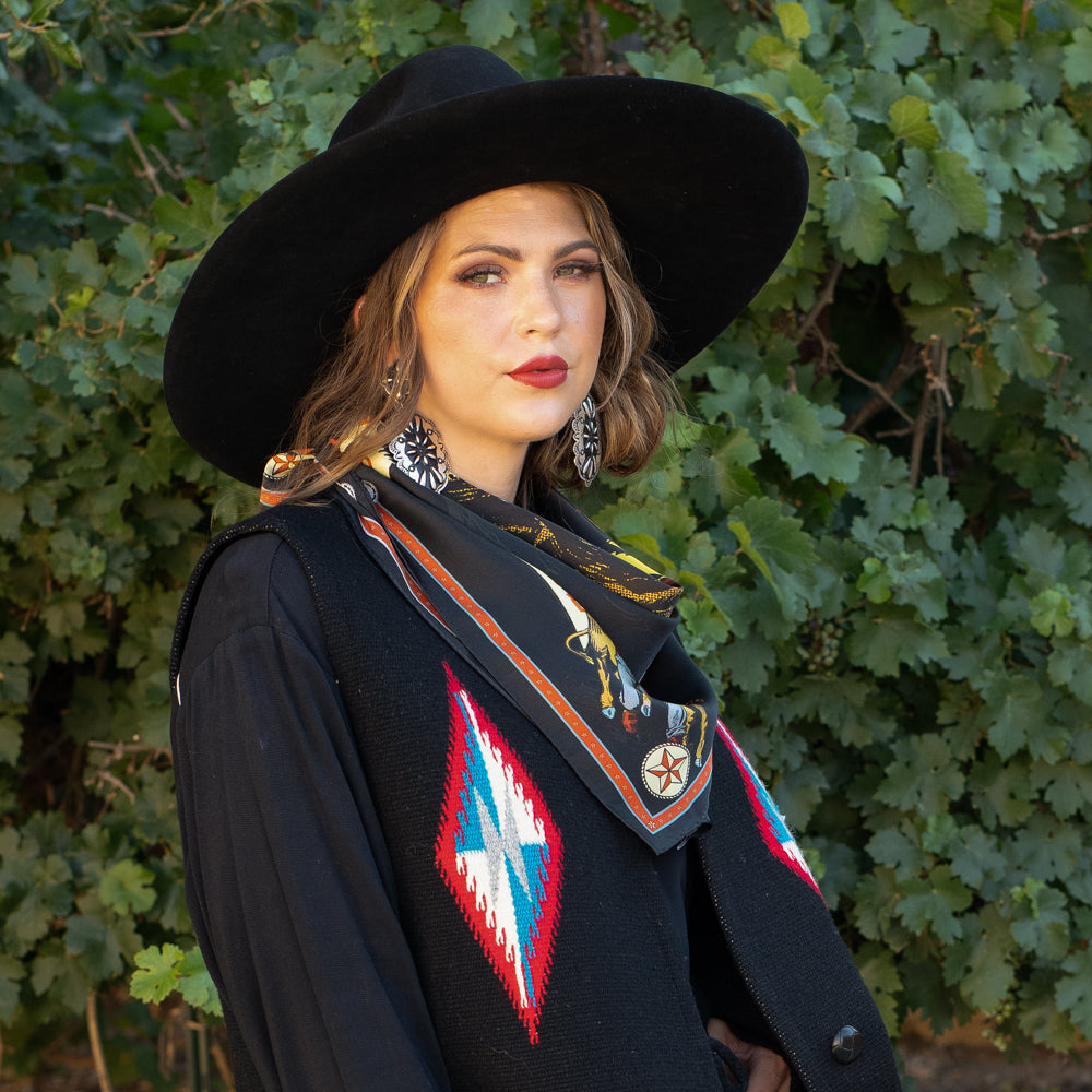 The Star Of The West is a 100% Satin Silk wild rag that has a BIG retro vibe to it! Vintage cowboy graphics with rope border and stars highlighting corners. This is a fun one and will last for years to come!