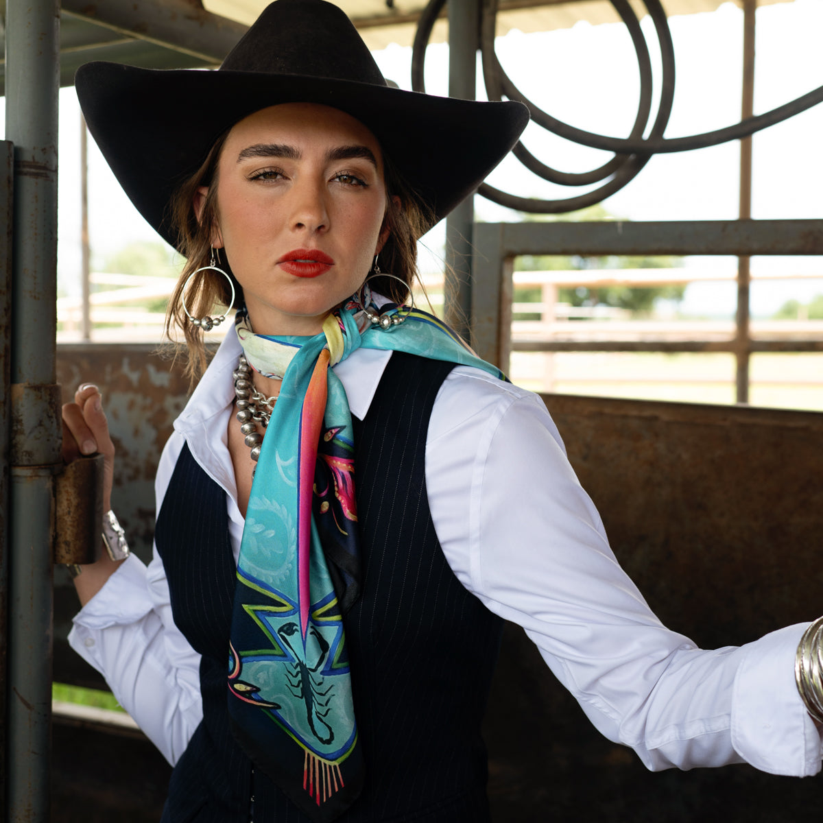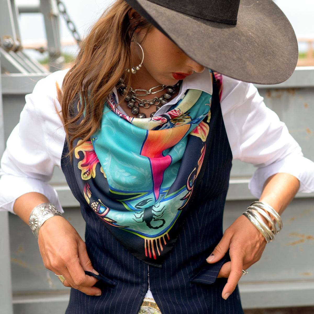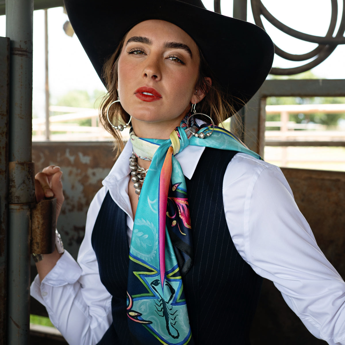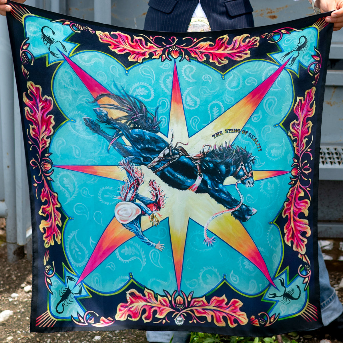 Printed on 14mm satin silk and finished with a hand-rolled hem, this scarf is a bold, emotional tribute to the resilience of the Western spirit. Limited edition.