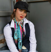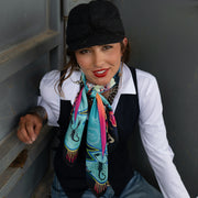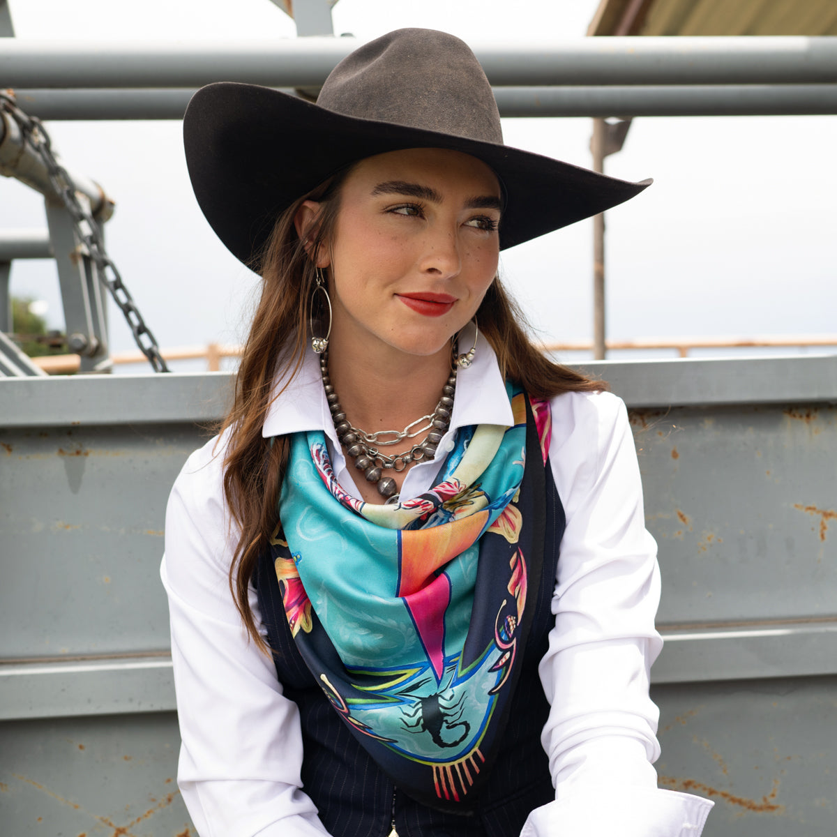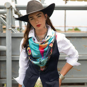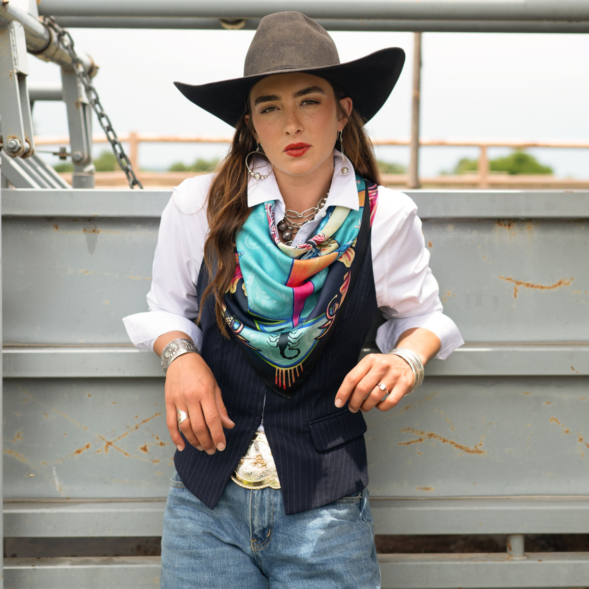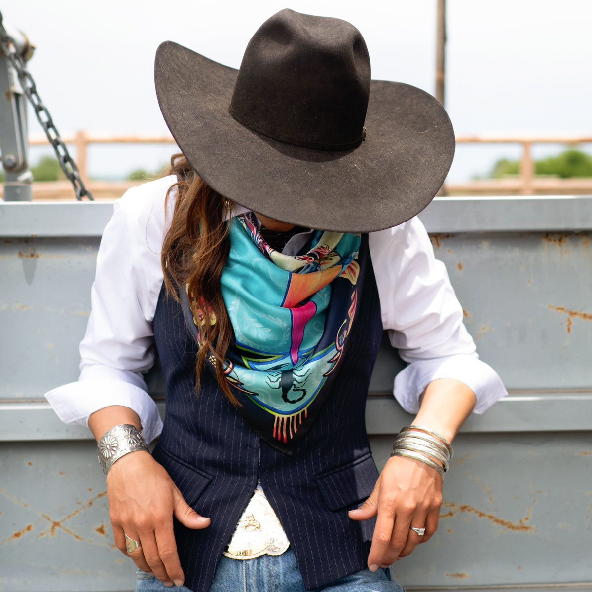 Printed on 14mm satin silk and finished with a hand-rolled hem, this scarf is a bold, emotional tribute to the resilience of the Western spirit. Limited edition.