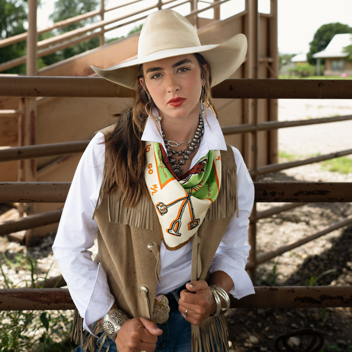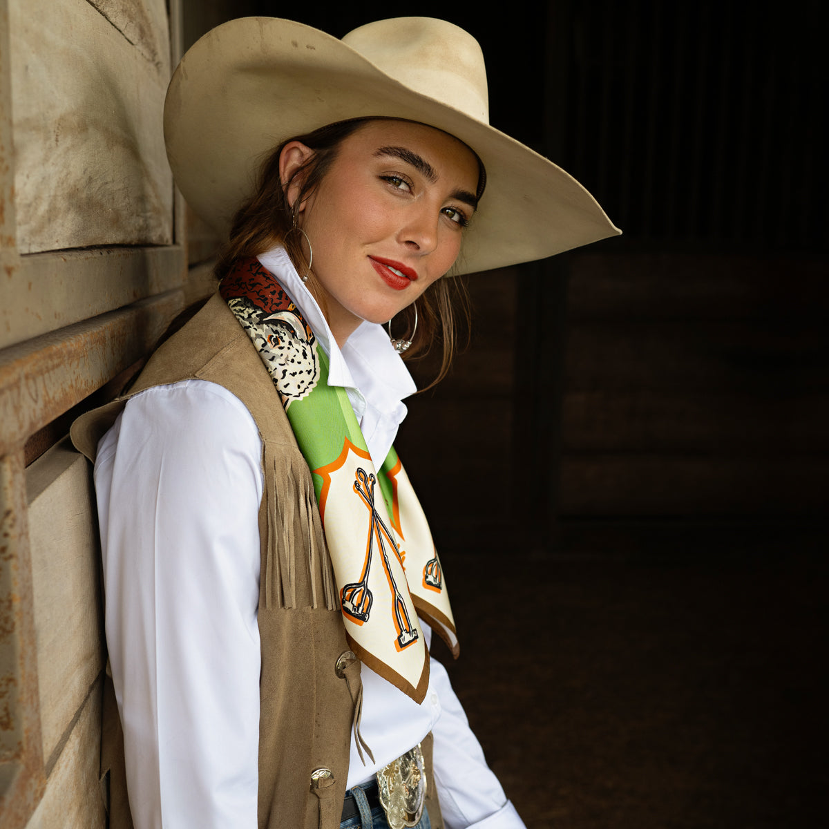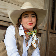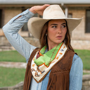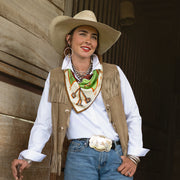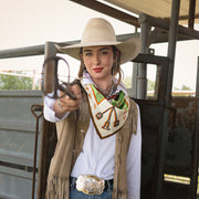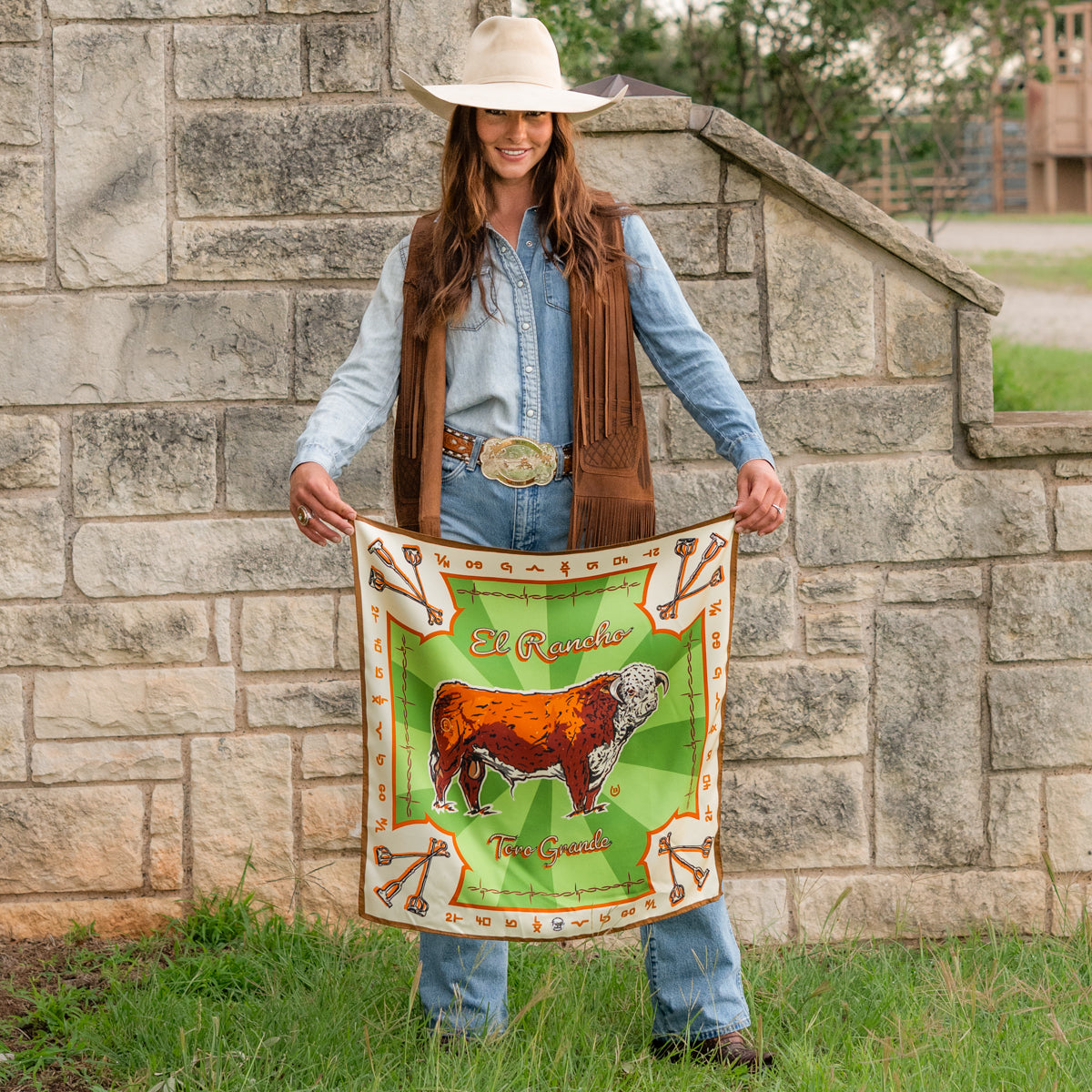 Toro Grande puts a powerful Hereford front and center, surrounded by branding iron motifs and Western typography that feel straight out of a dusty cattle drive. This scarf is bold, rugged, and unapologetically Western—perfect from branding pen to bunkhouse.