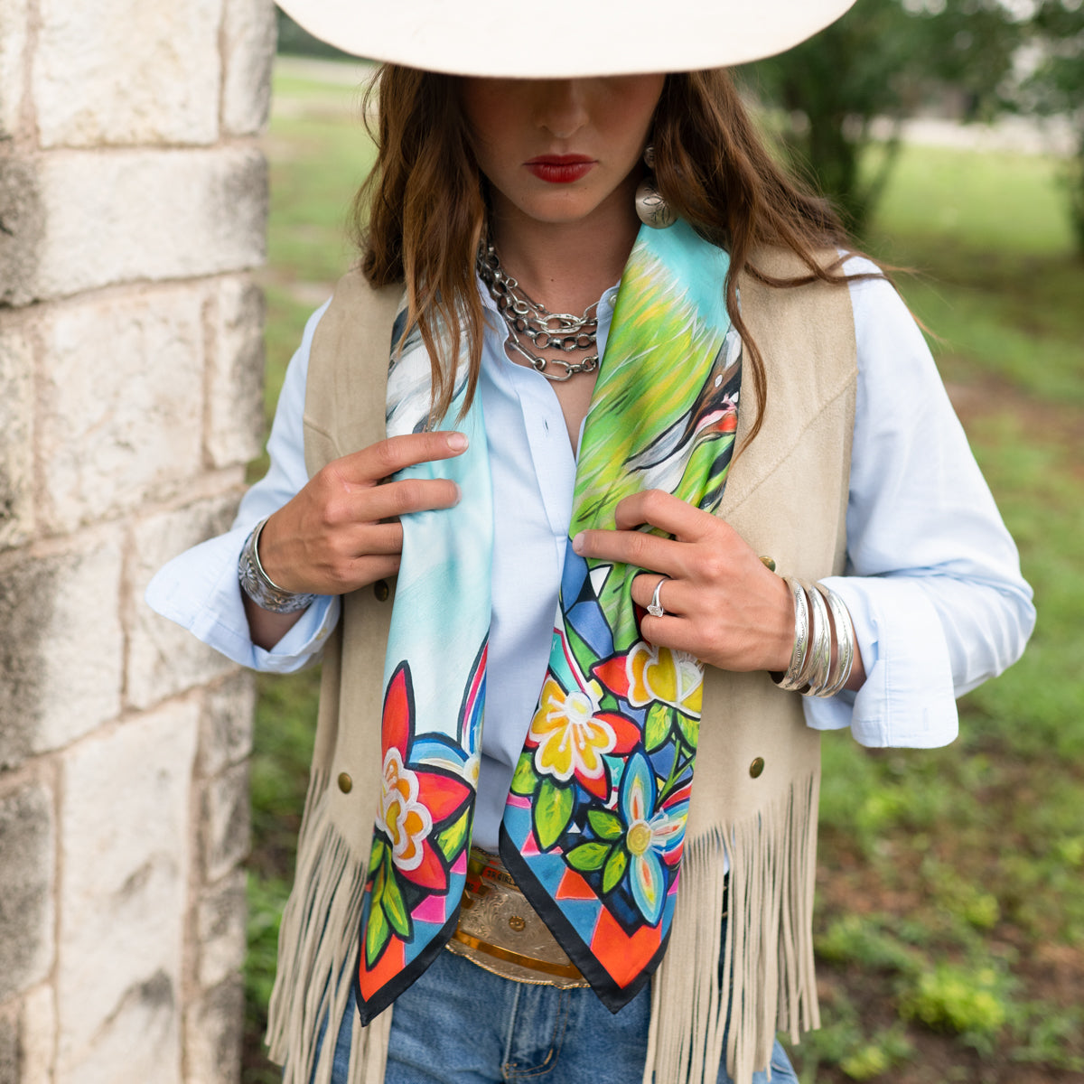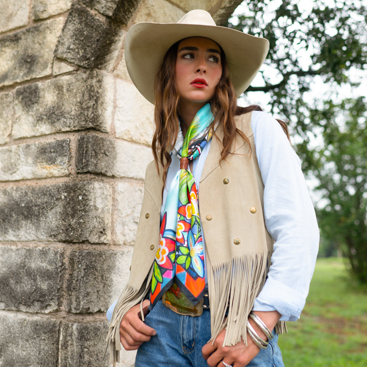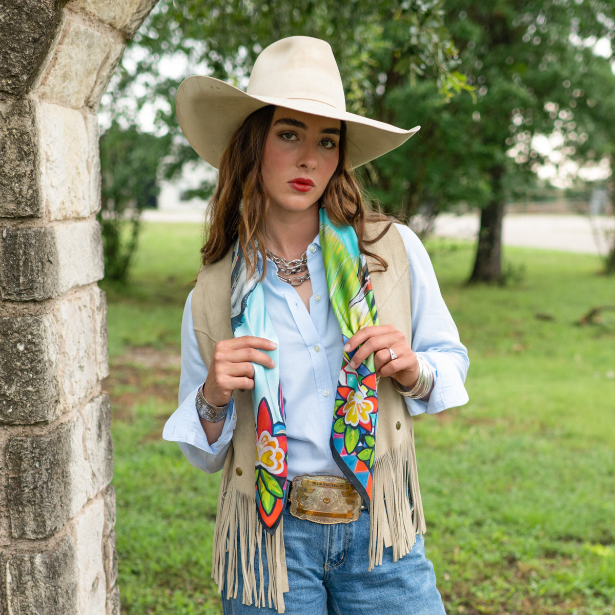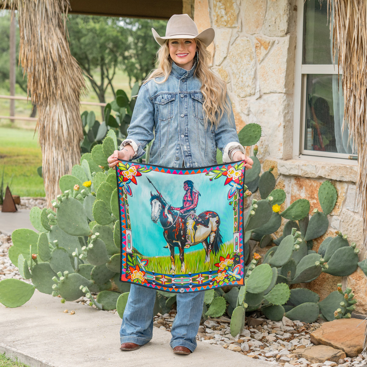 Fringe welcomes new artist Courtney Robertson to this year’s Artist Collection, bringing her storytelling brushstrokes and rich cultural awareness to silk. Her art draws from personal history and shared heritage, with a style rooted in the traditions of the American West.