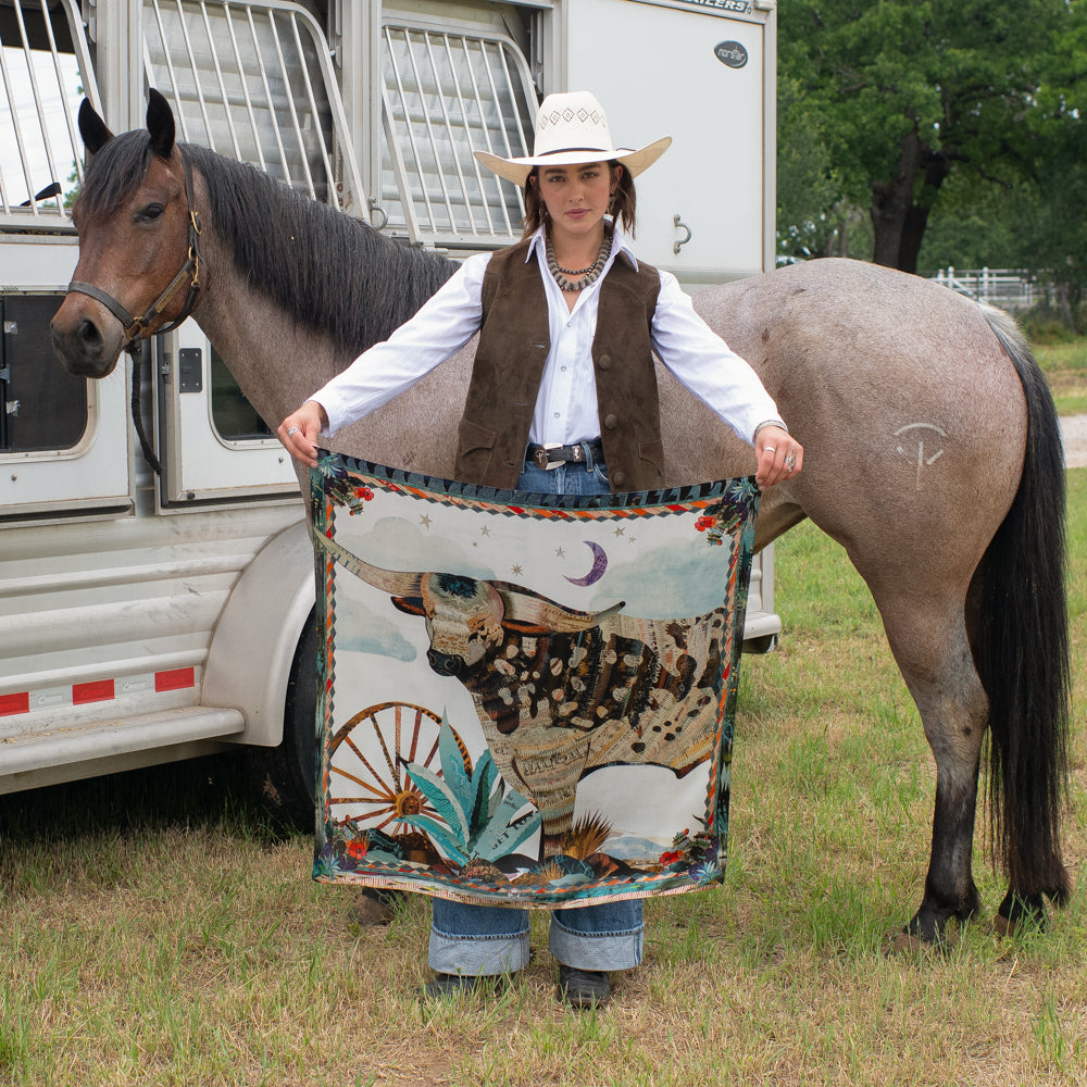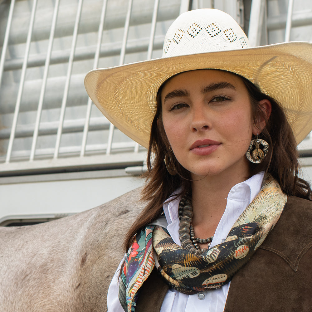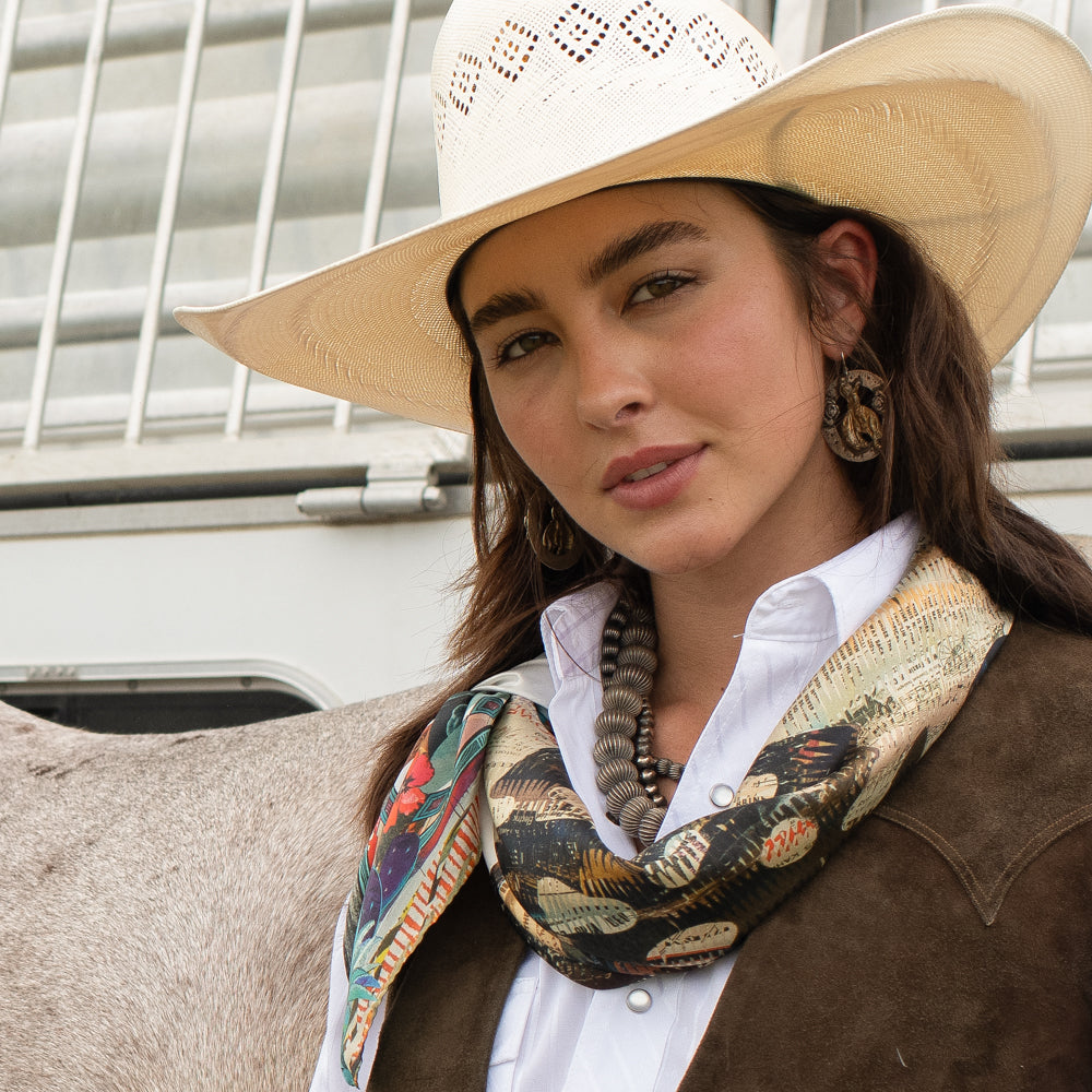 Broken Spoke is a wild rag in our Artist Collection by Dolan Geiman. Great borders and a gorgeous longhorn to boot! We love all the amazing colors and layers and can't wait to work the Broken Spoke into our outfits this fall.