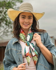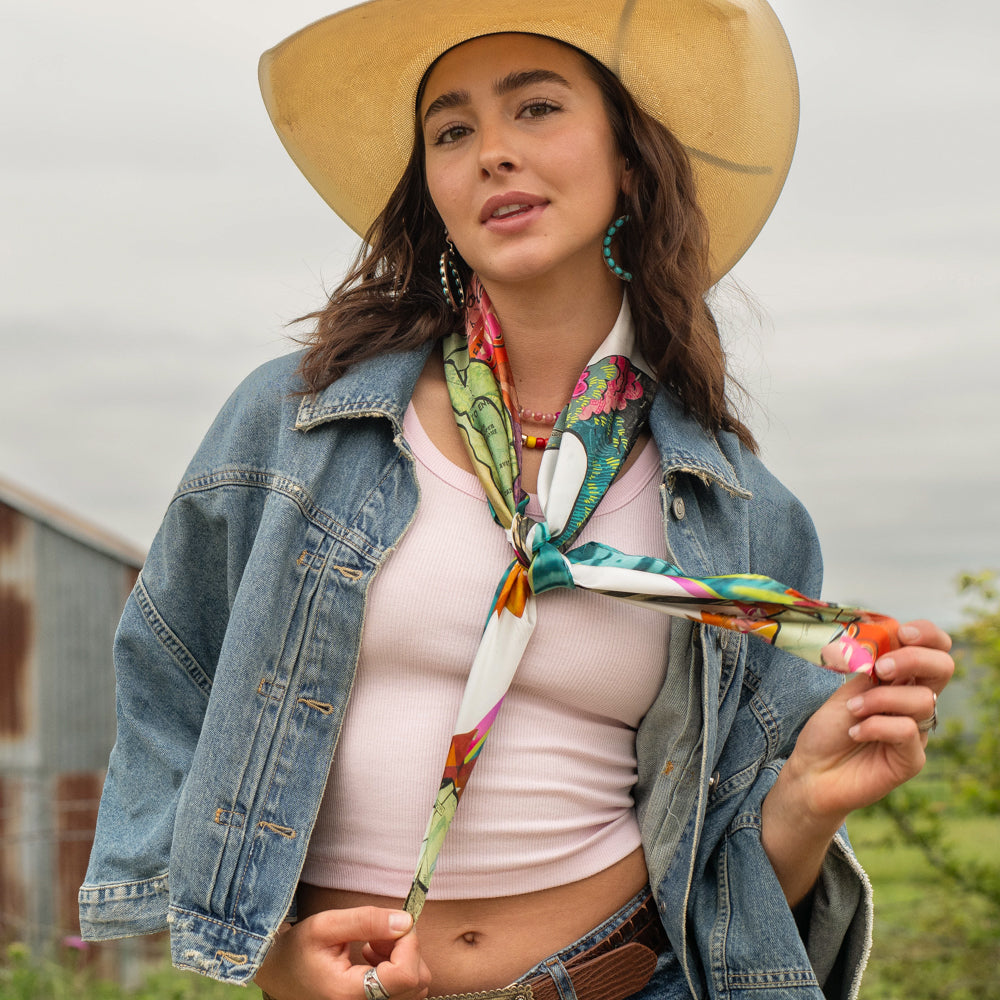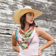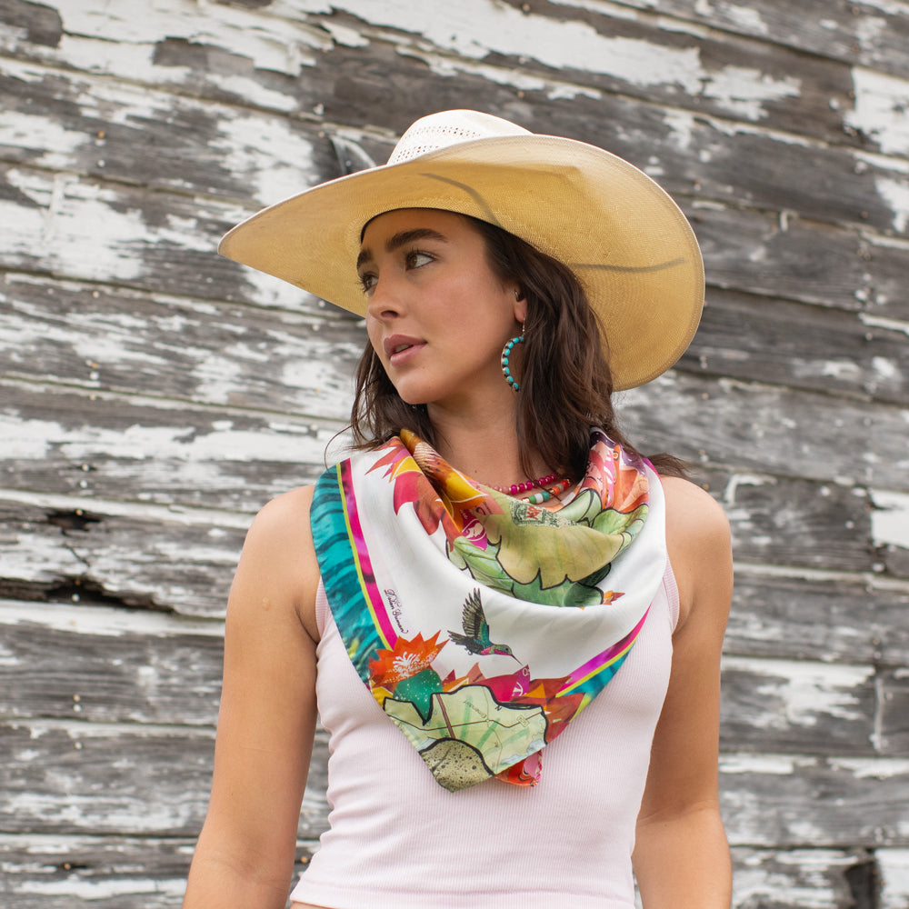 The Cactus Blooms is a beautiful Hummingbird themed silk scarf by artist Dolan Geiman and our latest release! A definite eye catcher with all the perfect colors for Spring and Summer!