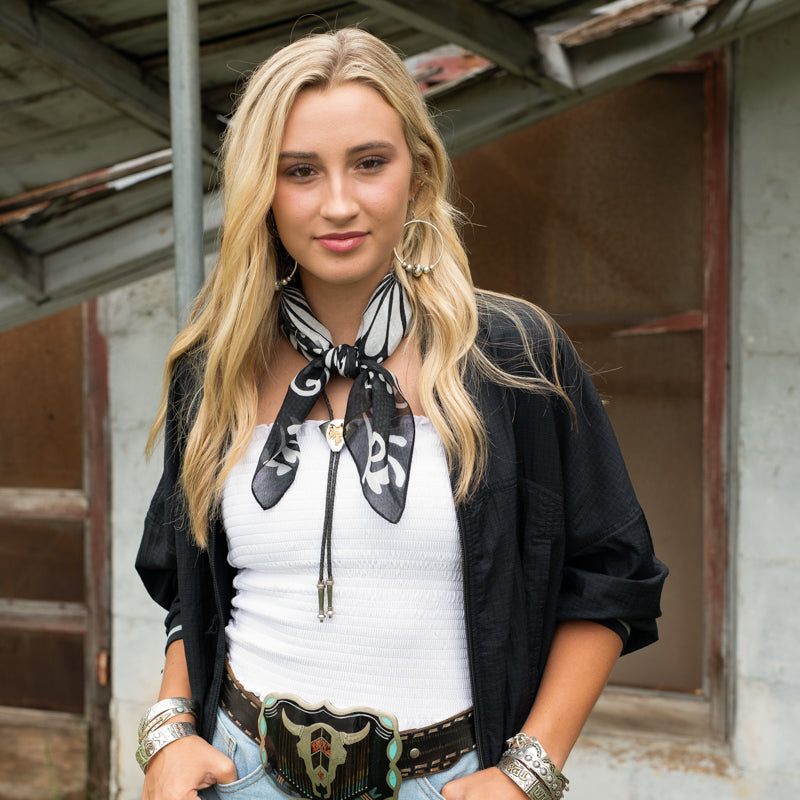 Available in our Shorty size of 26"x26". The standard cotton bandana is 22"x22", we made ours a few more inches longer to have that extra room to tie with or to add a scarf slide.