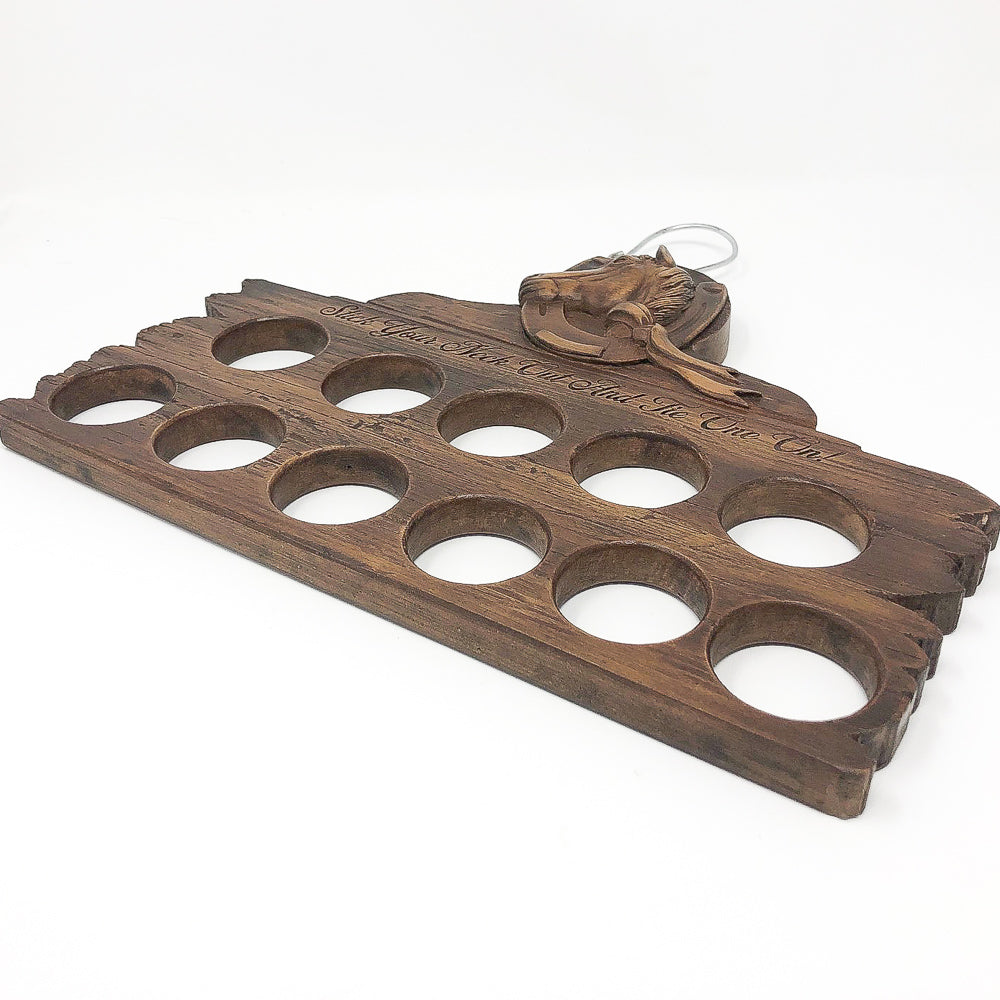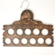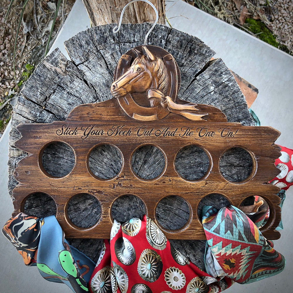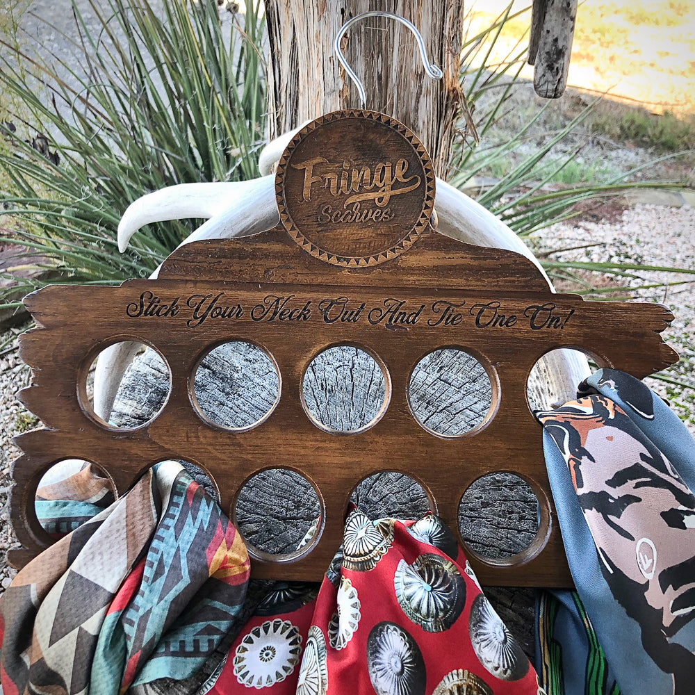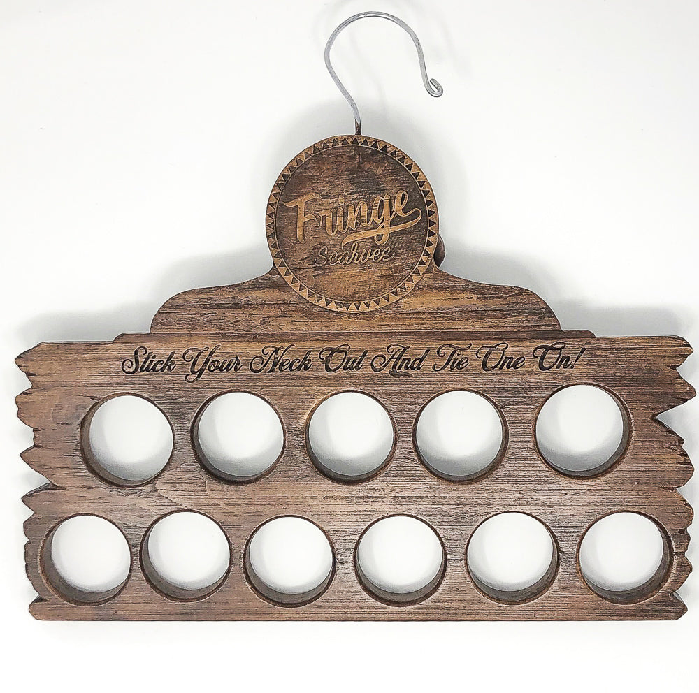 Introducing our new custom made scarf hanger with horse head on the front and Fringe Scarves logo on back. Tag line "Stick Your Neck Out and Tie One On" on both sides across the top. Hand carved mold, made from resin with beautiful wood texture and staining. Stationary metal hanger hook.