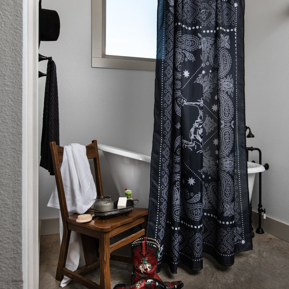 Bring some of your favorite Fringe Scarf designs HOME! The Bandito Bandana, is our take on the traditional bandana print, with cactus and bucking horses mixed with traditional paisleys. Perfect for the trending black and white bathroom, or add any splash of color to this blank canvas.