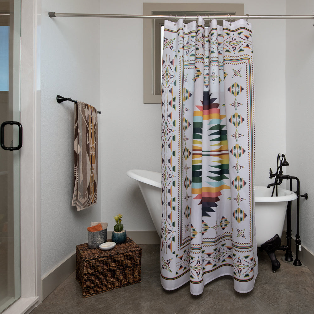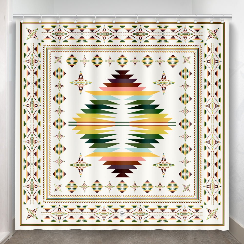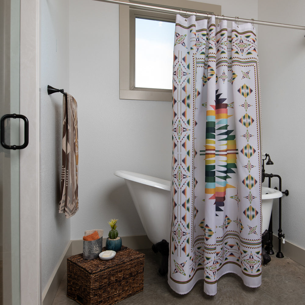 Bring some of your favorite Fringe Scarf designs HOME! The Mesa has that great traditional southwest style. With the perfect color palette for any bathroom. Off-white with turquoise, salmon, gold, peach, dark greens, maroons and burgundy.