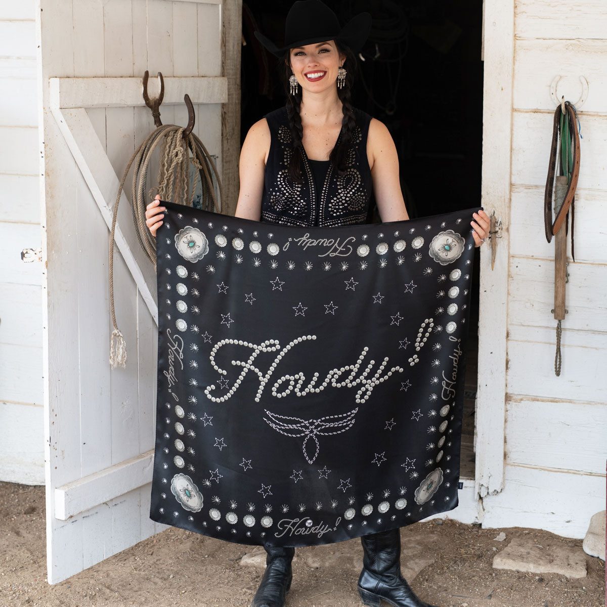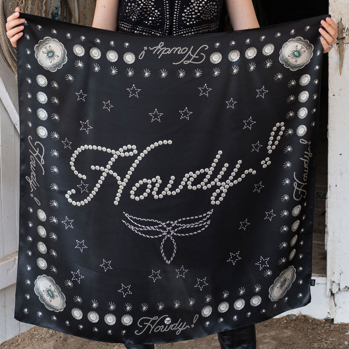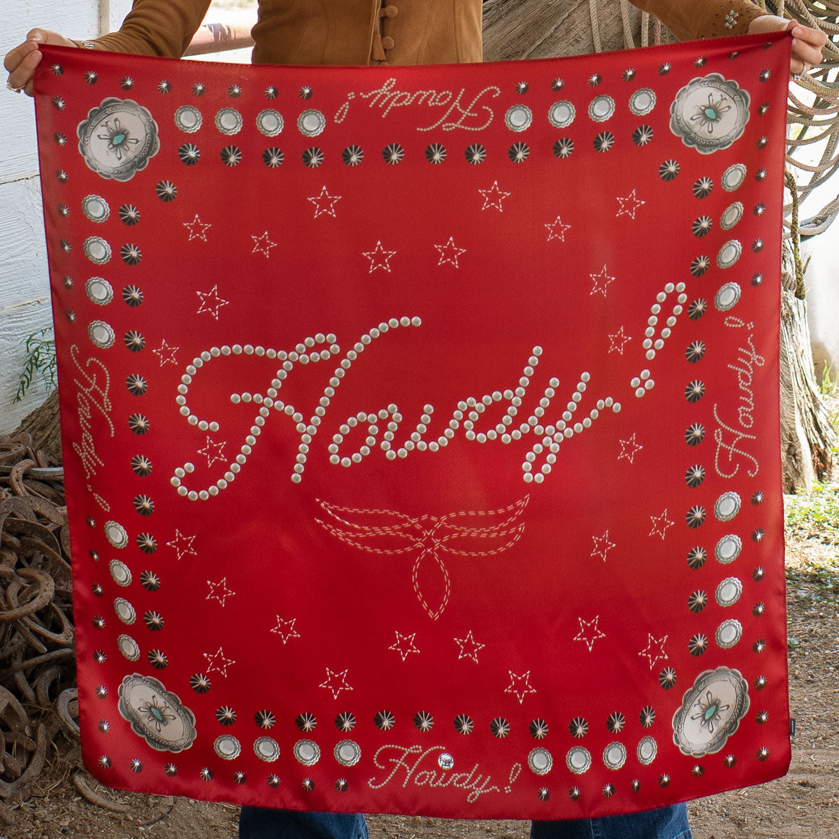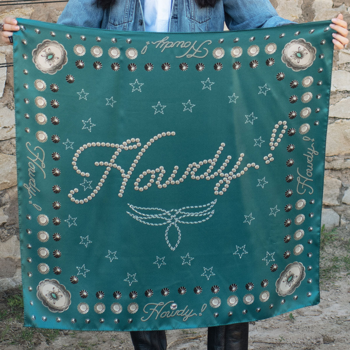 The Howdy, our latest concho-inspired wild rag with a silver studded "Howdy" at center. This traditional style design gives the versatility of a solid colored wild rag, with a little extra for that one-of-a-kind feel.