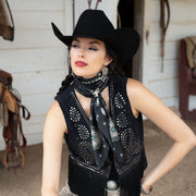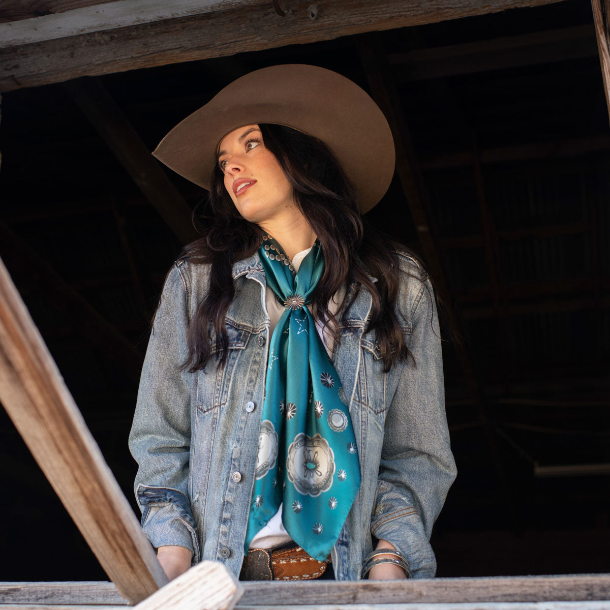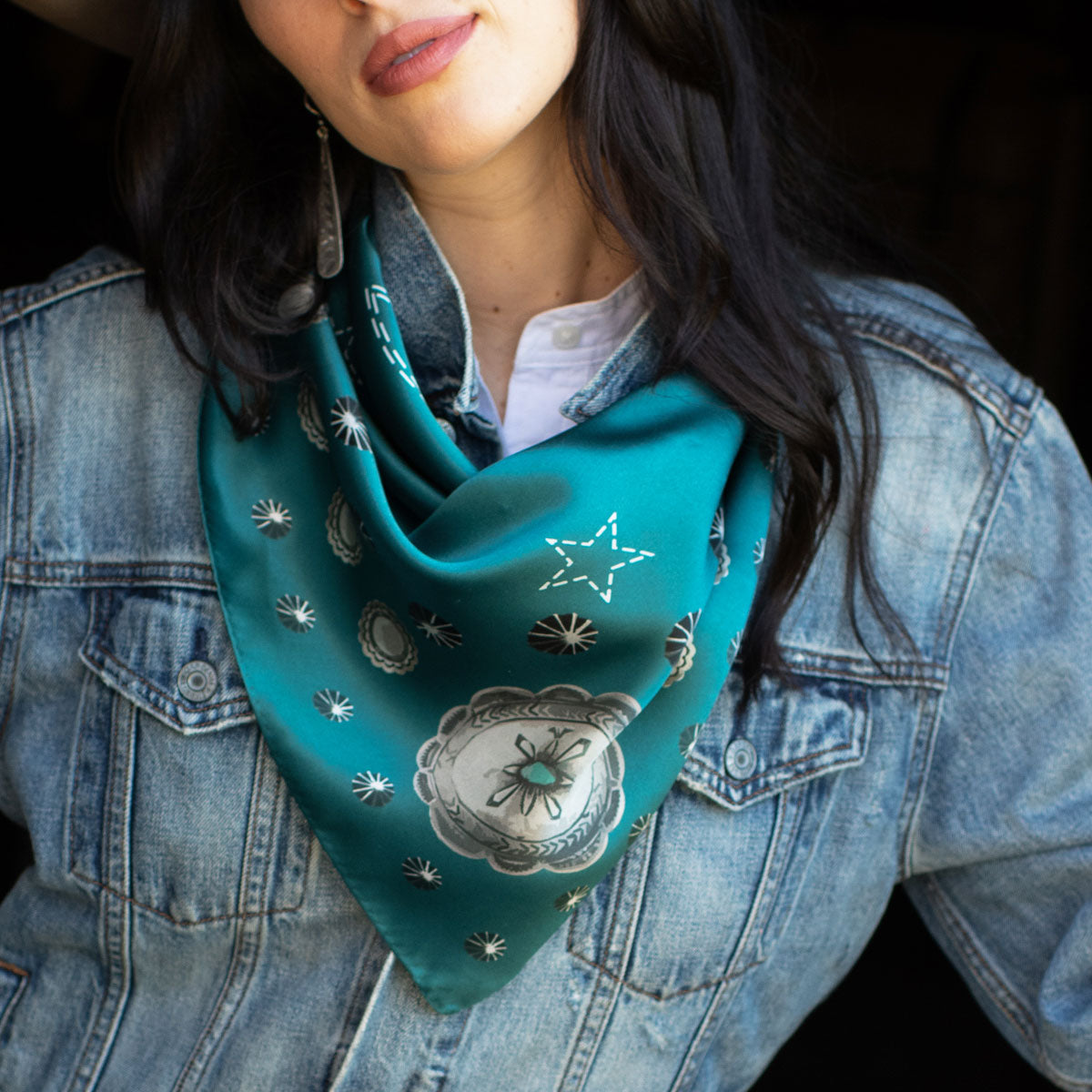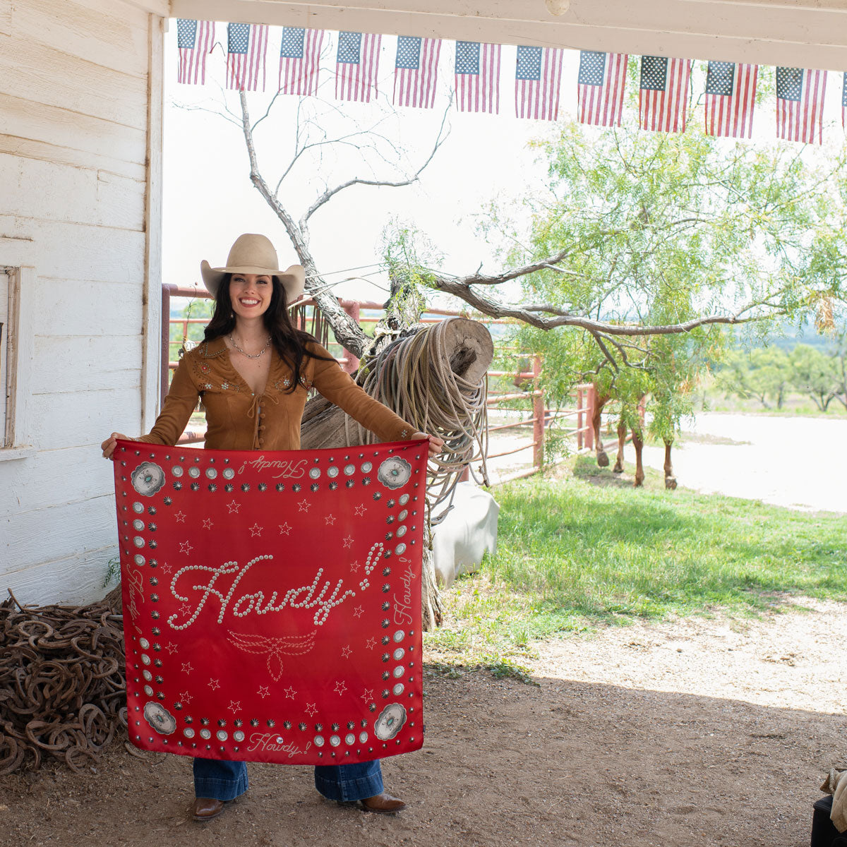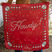 The Howdy, our latest concho-inspired wild rag with a silver studded "Howdy" at center. This traditional style design gives the versatility of a solid colored wild rag, with a little extra for that one-of-a-kind feel.