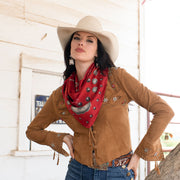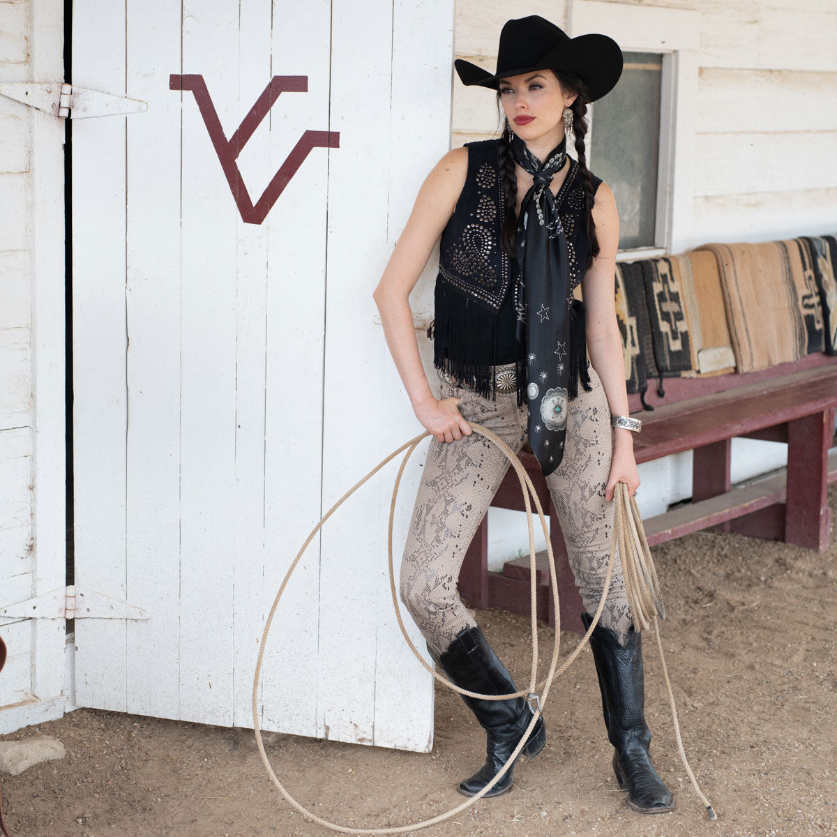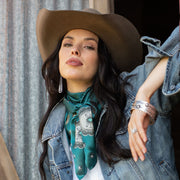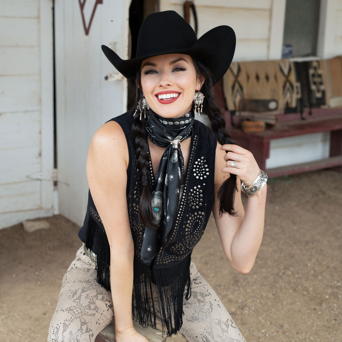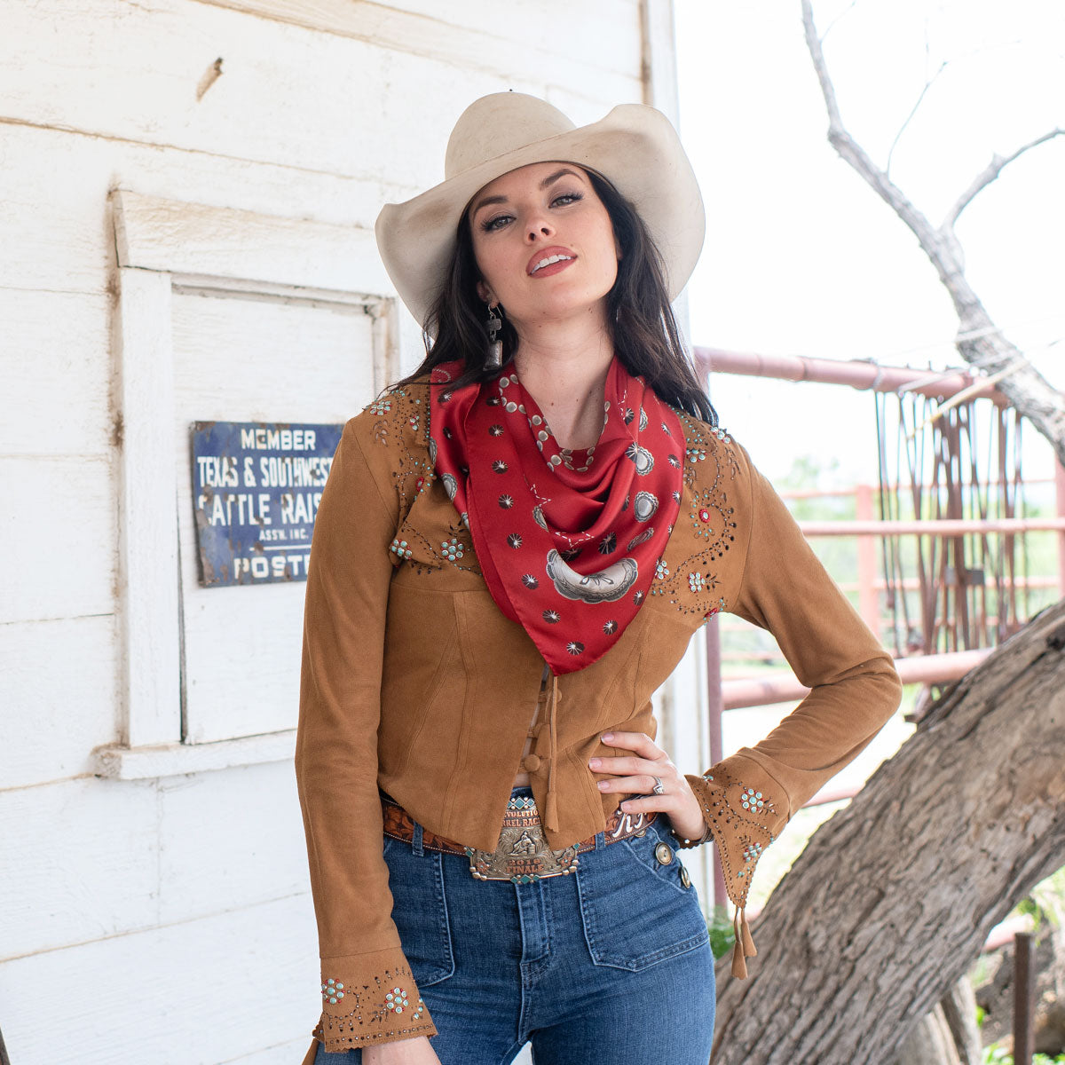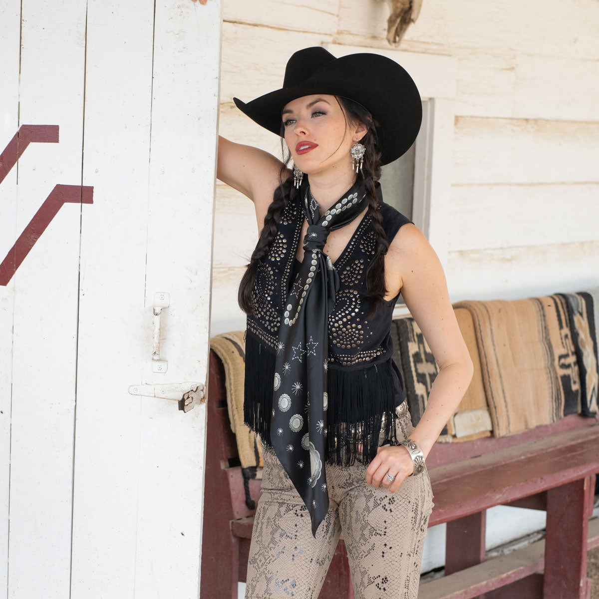 The Howdy, our latest concho-inspired wild rag with a silver studded "Howdy" at center. This traditional style design gives the versatility of a solid colored wild rag, with a little extra for that one-of-a-kind feel.