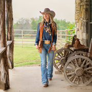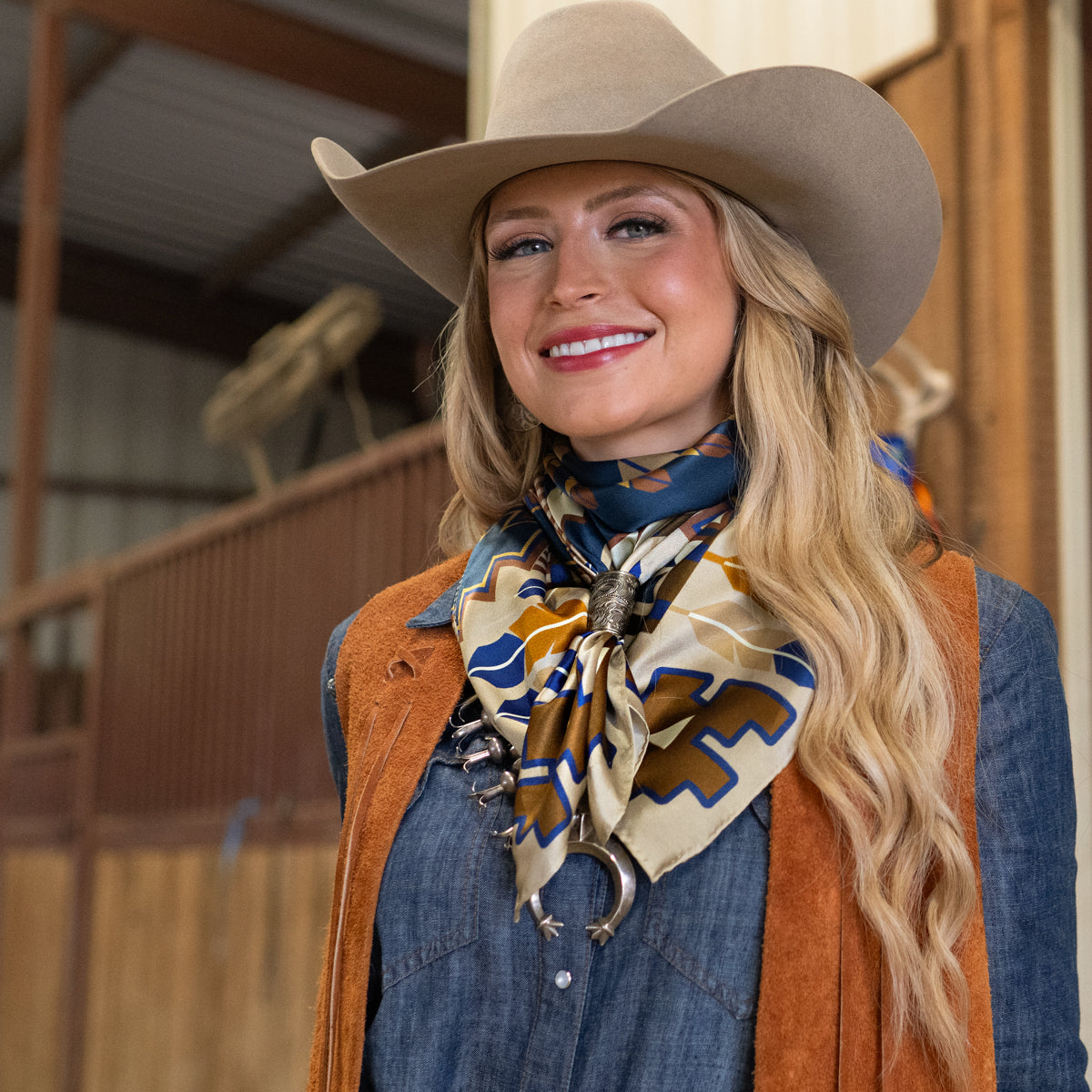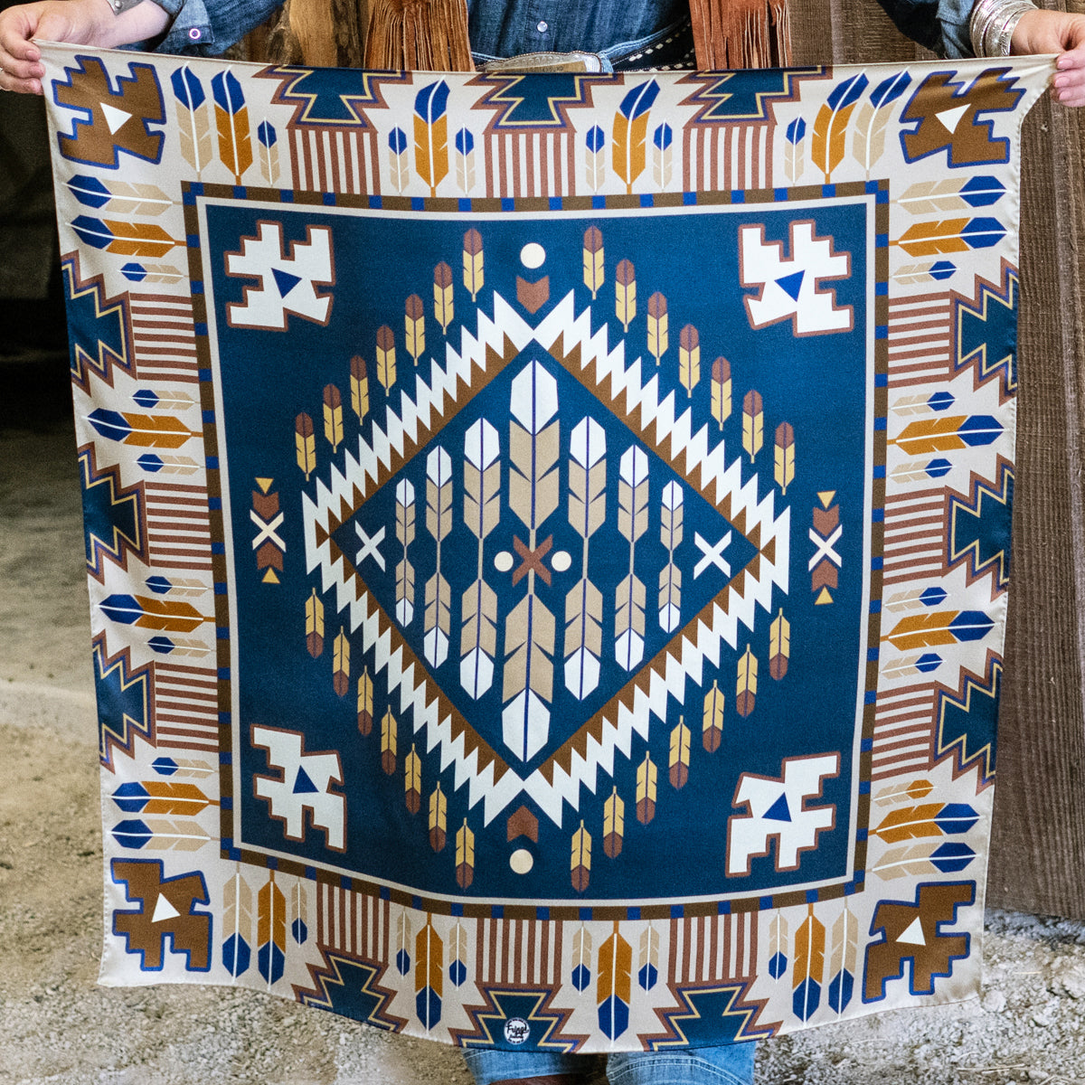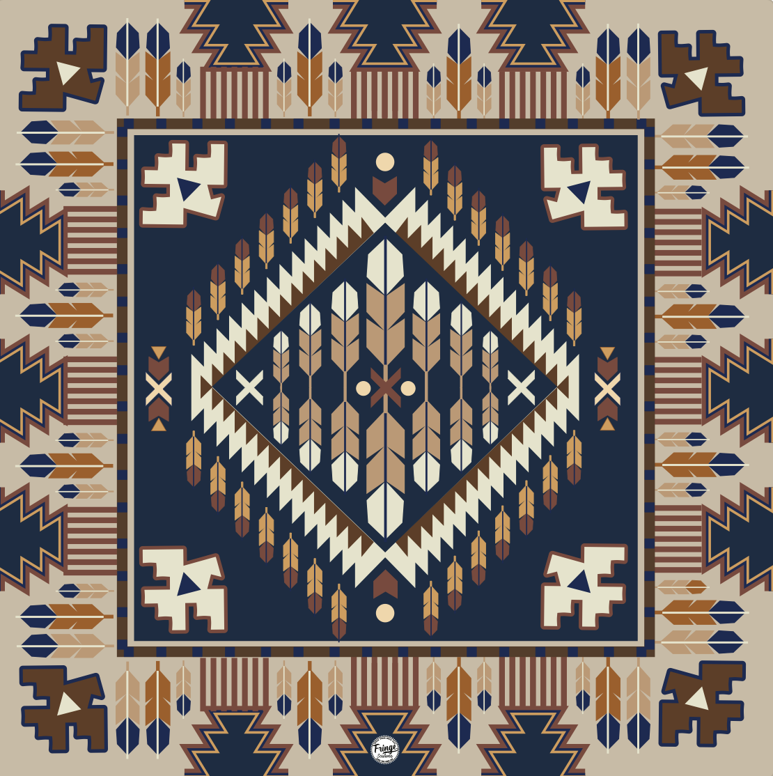 Rainmaker — a design rooted in rhythm and resilience. With a powerful mix of bold feathers, striking borders, and directional patterns, this scarf channels movement, momentum, and the hope of renewal. Neutral tones meet deep navy for a look that’s both grounded and graphic.