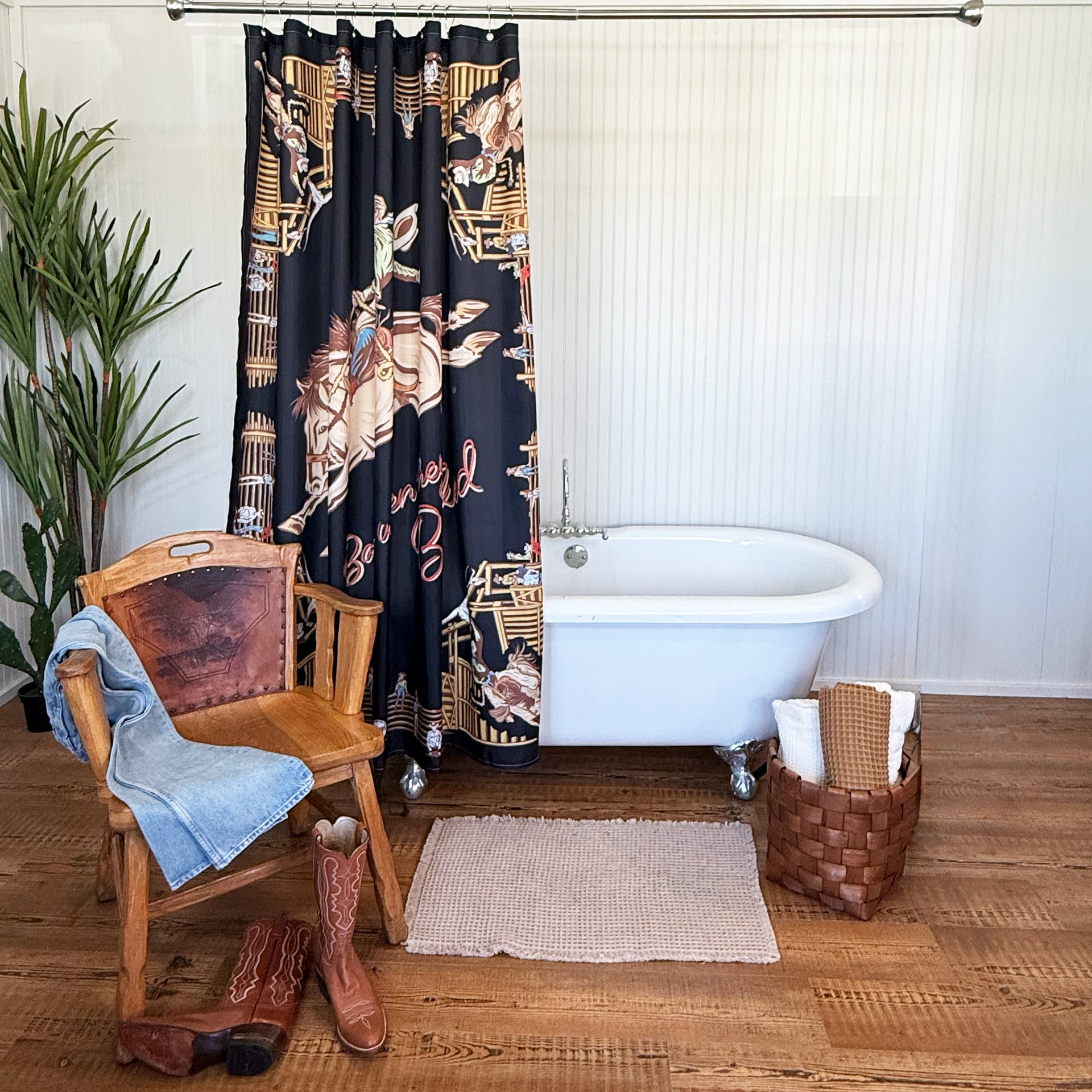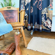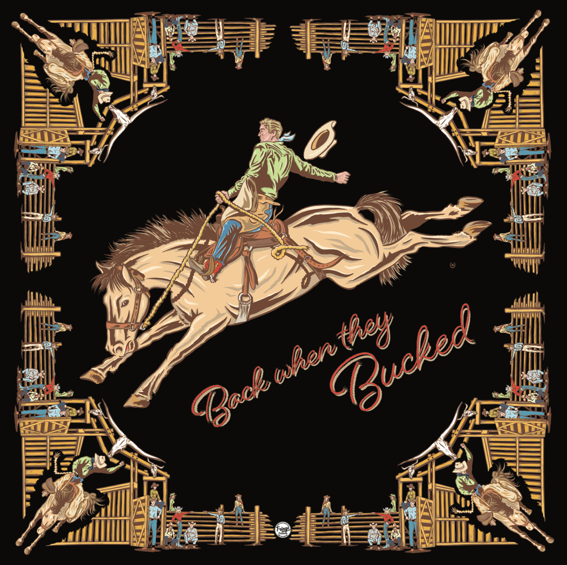 Back When They Bucked is a tribute to the rodeo’s golden era—think 1940s–50s bronc riders, bucking chutes, and mid-century swagger. With its hand-drawn details and classic composition, this scarf captures the spirit of a time when the arena was raw, rowdy, and full of glory. A must-have for collectors who appreciate tradition with bold style.
