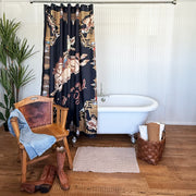 *100% polyester fabric - machine washable. Iron on polyester setting. Comes with set of silver shower rings. Size - 70” x 70.5”.