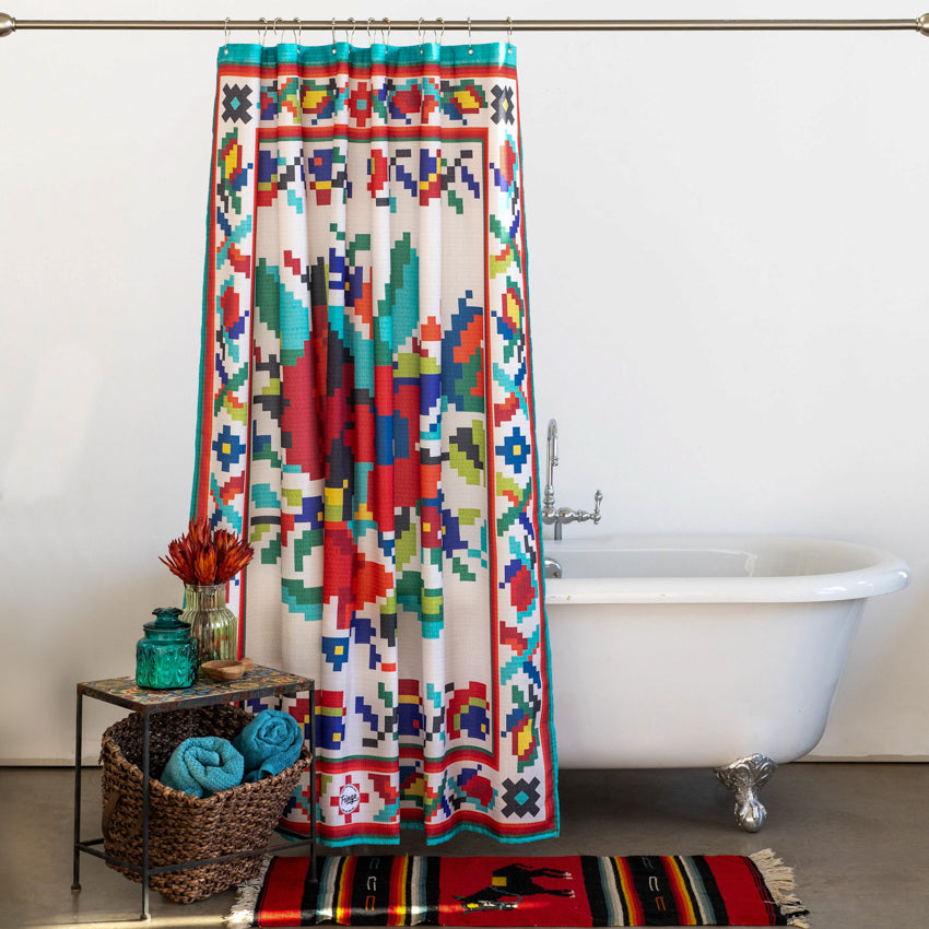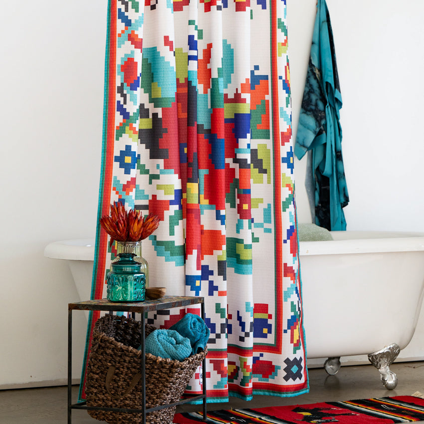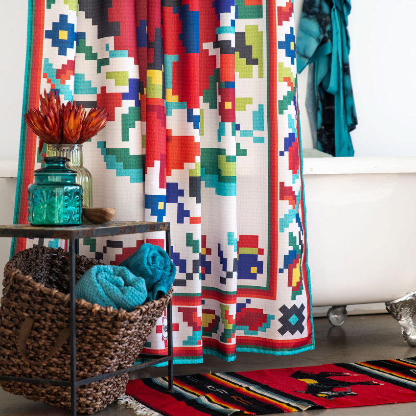 Bring some of your favorite Fringe Scarvf designs HOME! The CrossStitch brings a South of the Border look and feel to any bathroom. We love the contrast of the red, turquoise, blues and yellow. Sure to brighten up any bathroom!