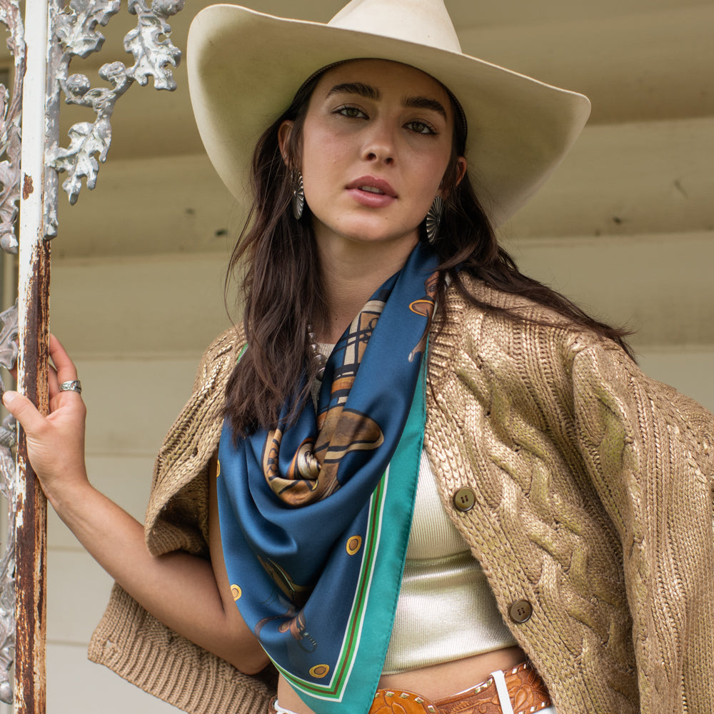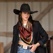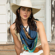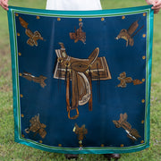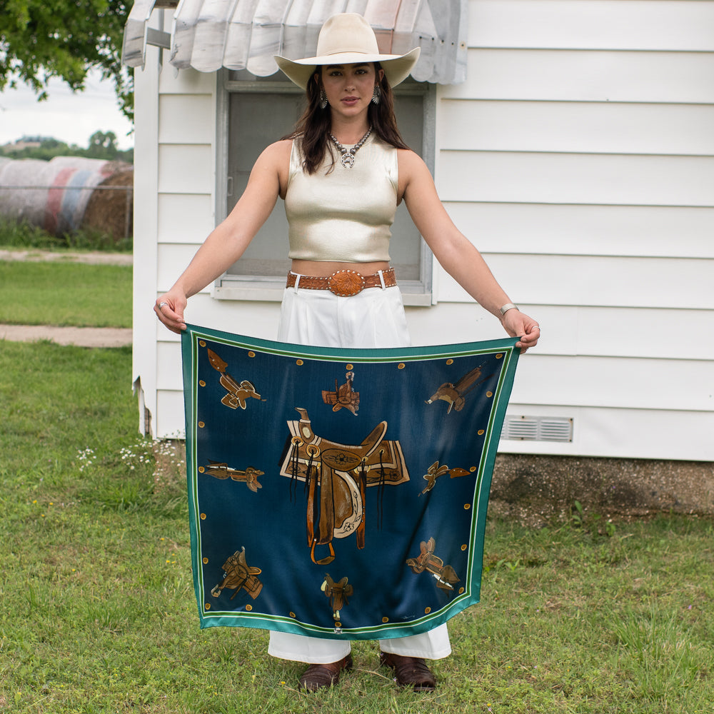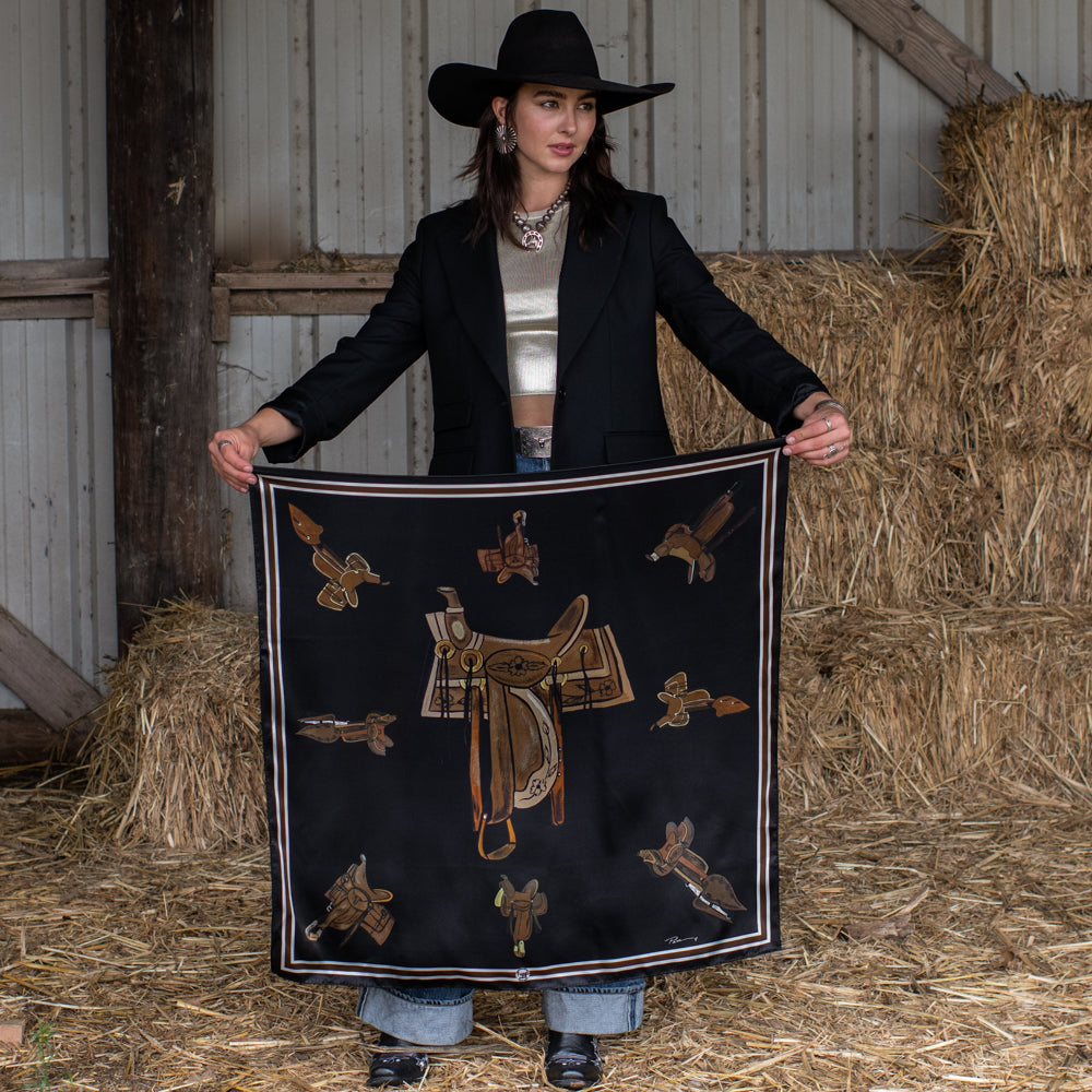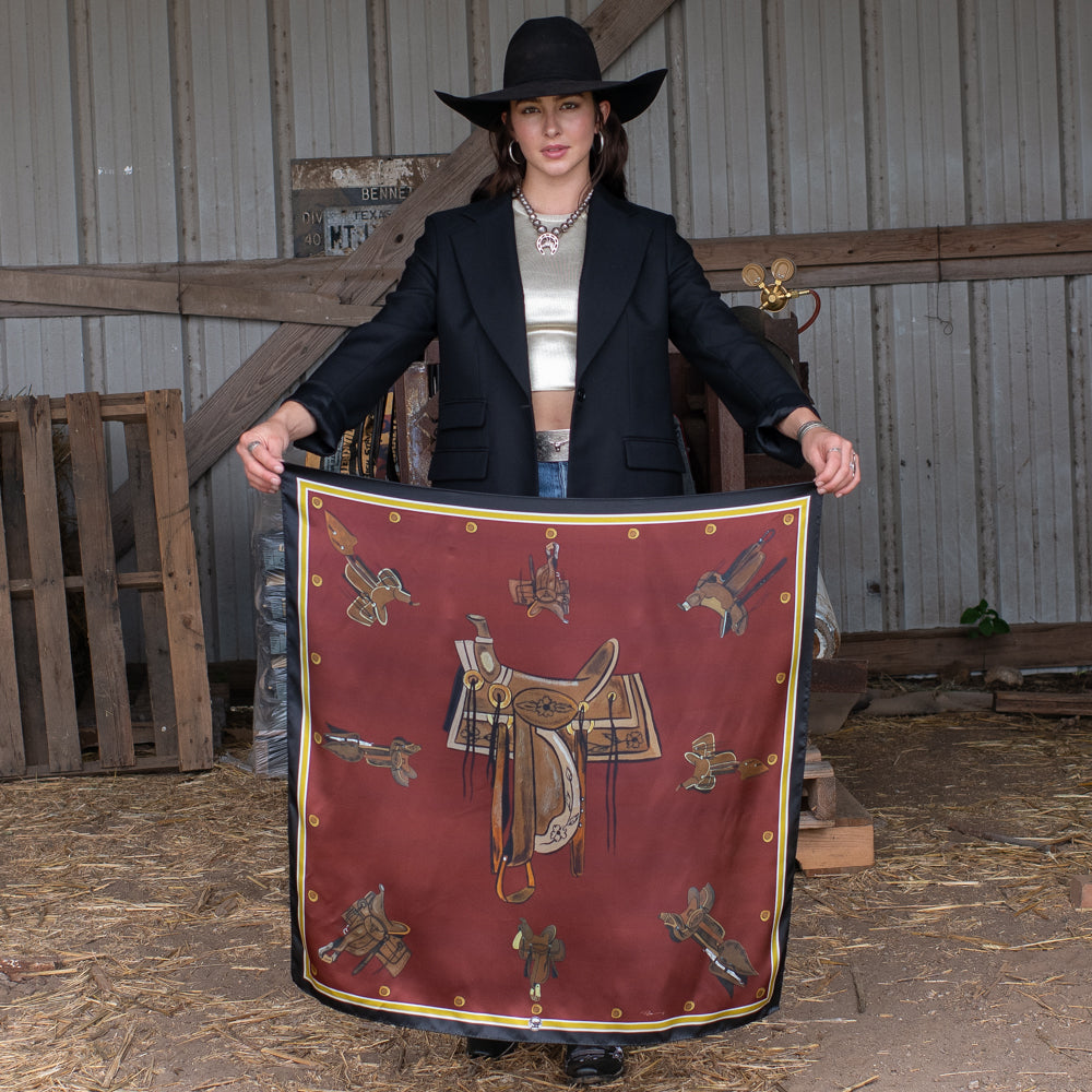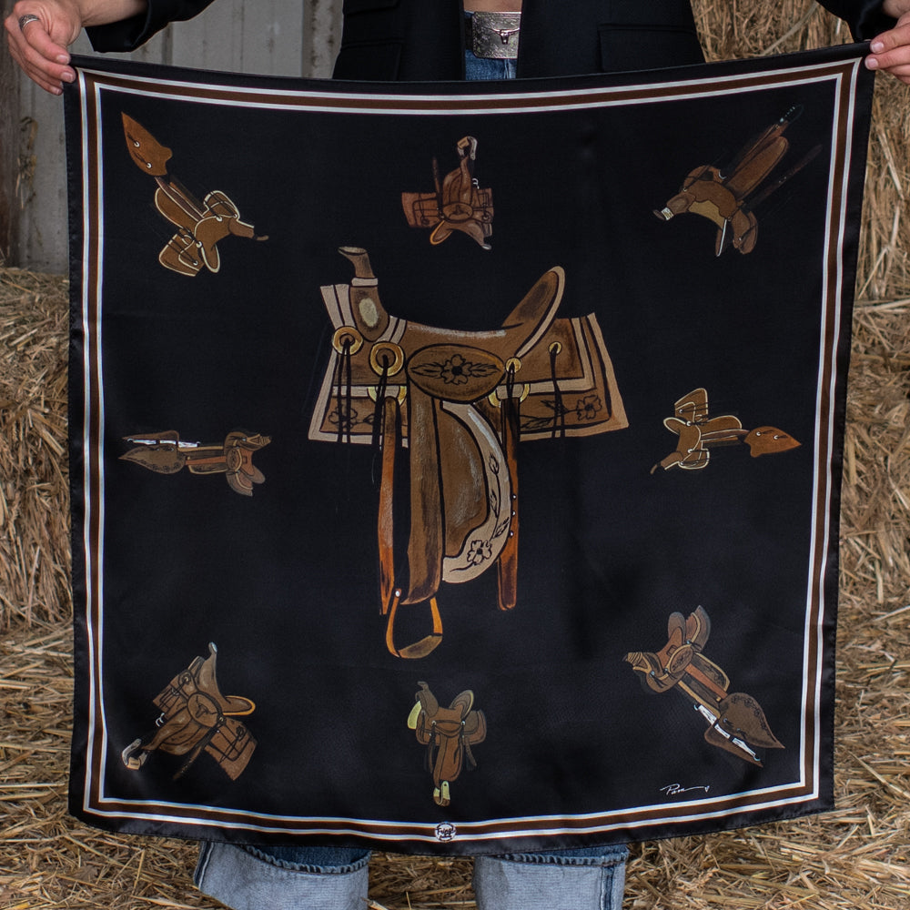 Take A Seat in the saddle! This beautiful new wild rag is adorned with saddle art by artist Pam Benke from Billings, MT. Western saddles, mixed with a preppy, streamlined and simple background/border combo, makes for just the right addition to your Western wardrobe.