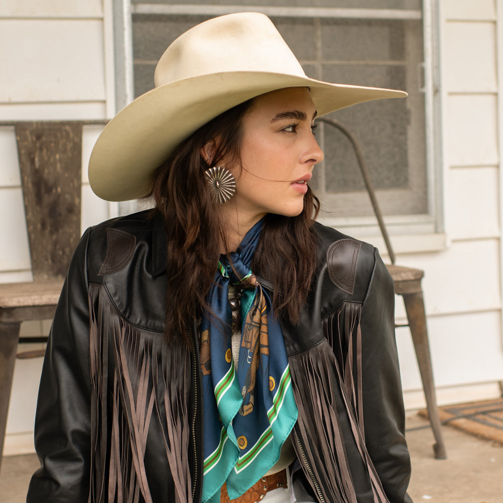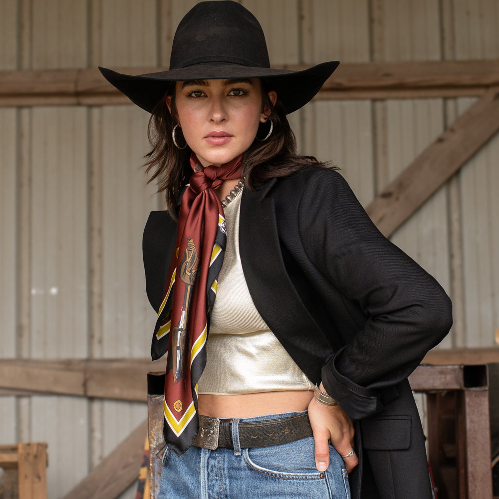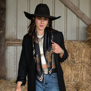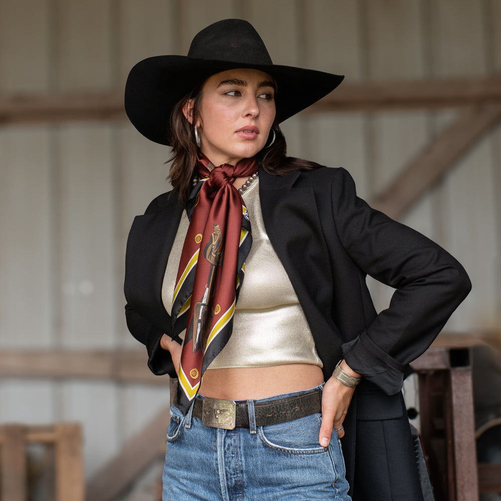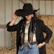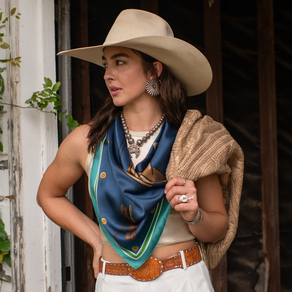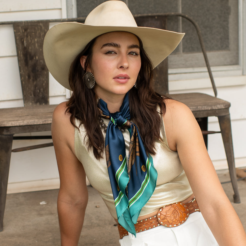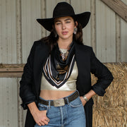 Take A Seat in the saddle! This beautiful new wild rag is adorned with saddle art by artist Pam Benke from Billings, MT. Western saddles, mixed with a preppy, streamlined and simple background/border combo, makes for just the right addition to your Western wardrobe.