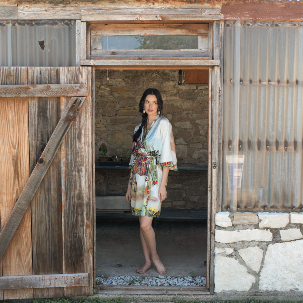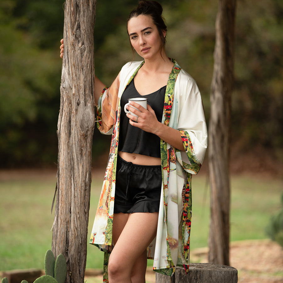 The Haute Horse kimono style robe, perfect for lounging around or getting ready in the morning. You can also throw it on with your favorite cami, skinny jeans and some tall top boots for a night out. Whether you are going from your bed to grab some coffee, or covering up after a swim, this versatile piece is sure to turn some heads.