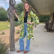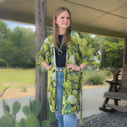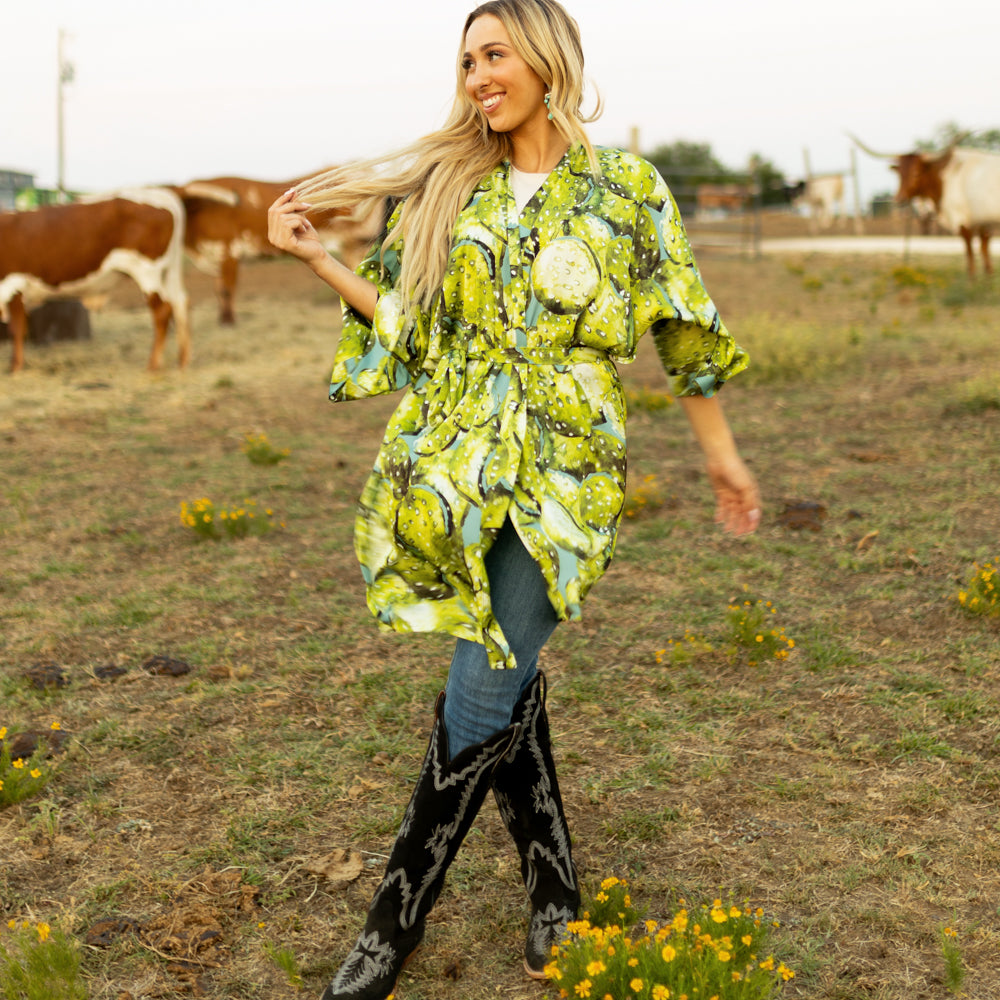 The Prickly Pear kimono robe, perfect for lounging around or getting ready in the morning. You can also throw it on with your favorite cami, skinny jeans and some tall top boots for a night out. Whether you are going from your bed to grab some coffee, or covering up after a swim, this versatile piece is sure to turn some heads.
