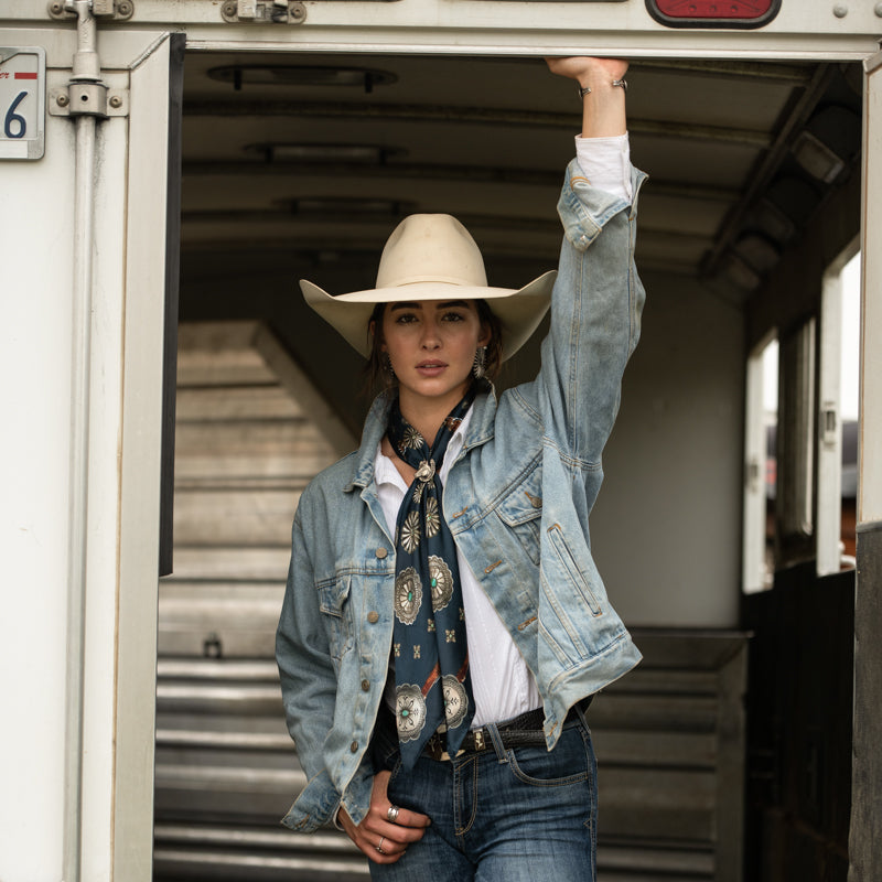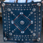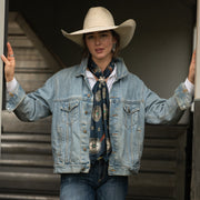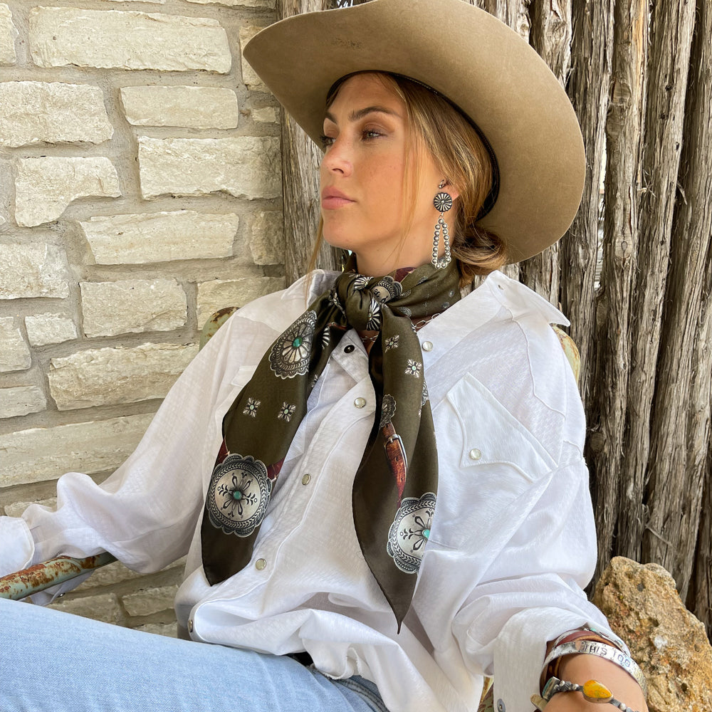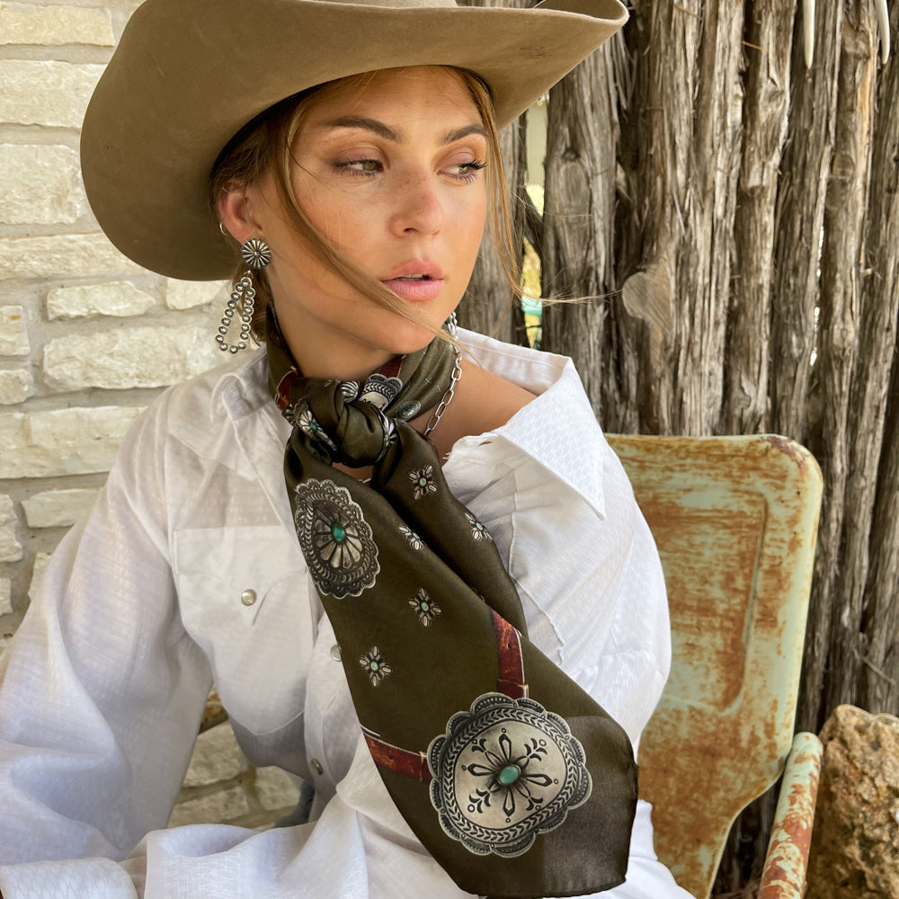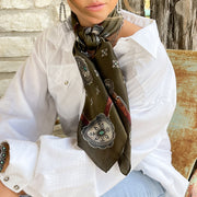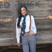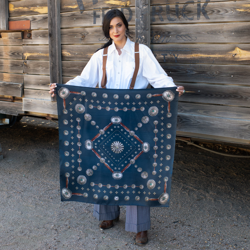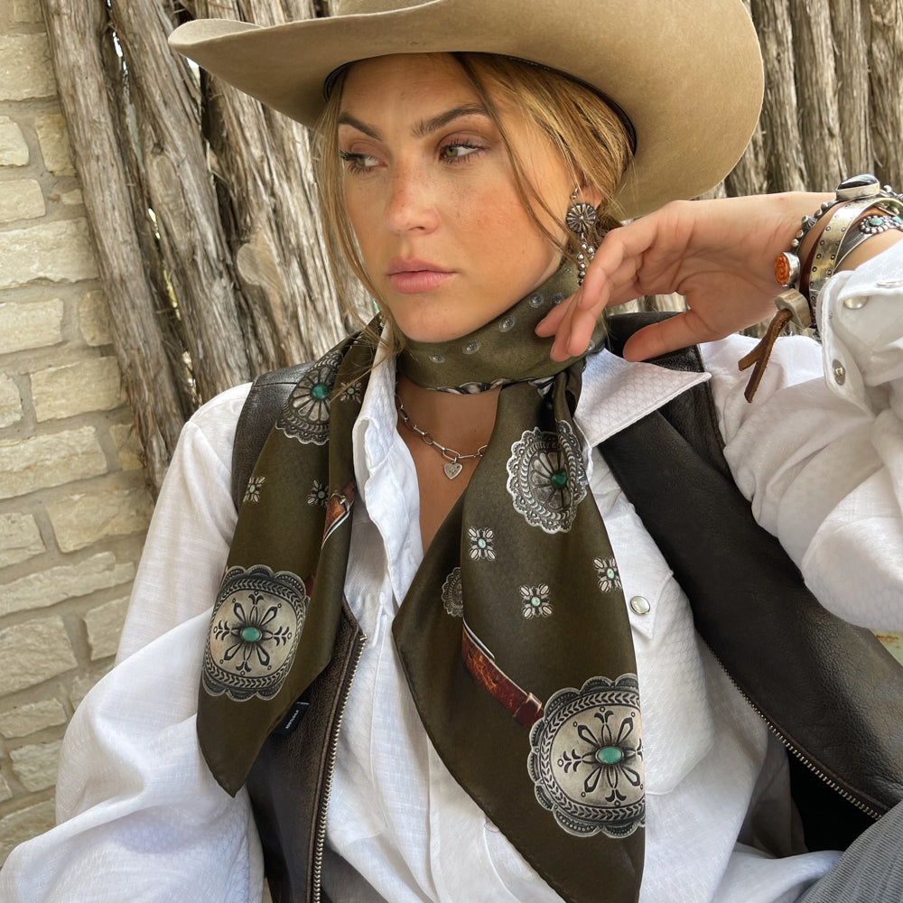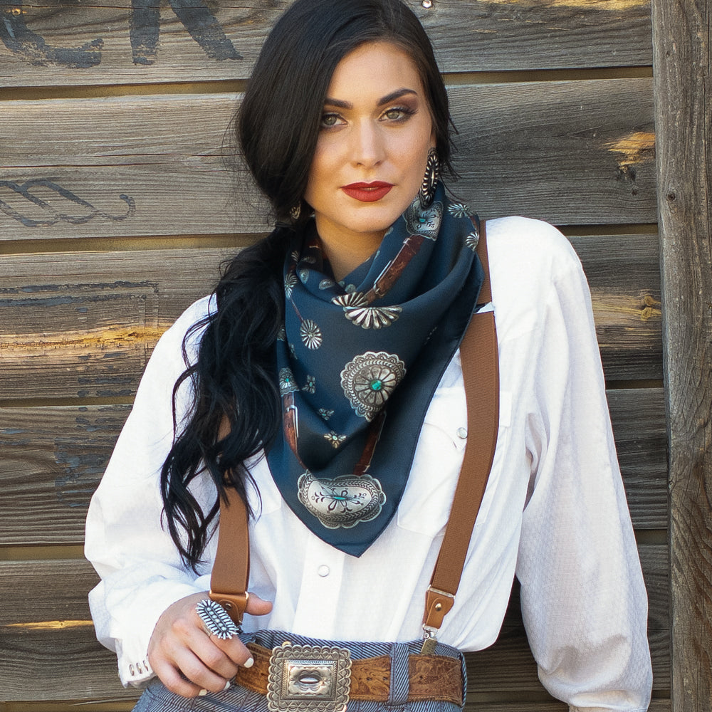 The Flagstaff is a 100% Satin Silk wild rag that has a rustic, vintage feel. A true classic! We added a vintage patina to this scarf to give it that distressed worn look.