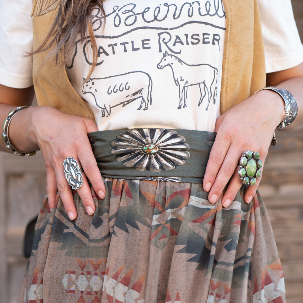 - COLOR: Antique sage, Antique Brown, and Navy with silver and brown detail and turquoise stones.