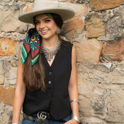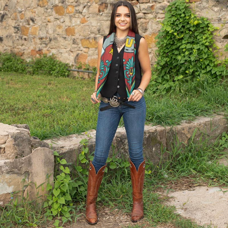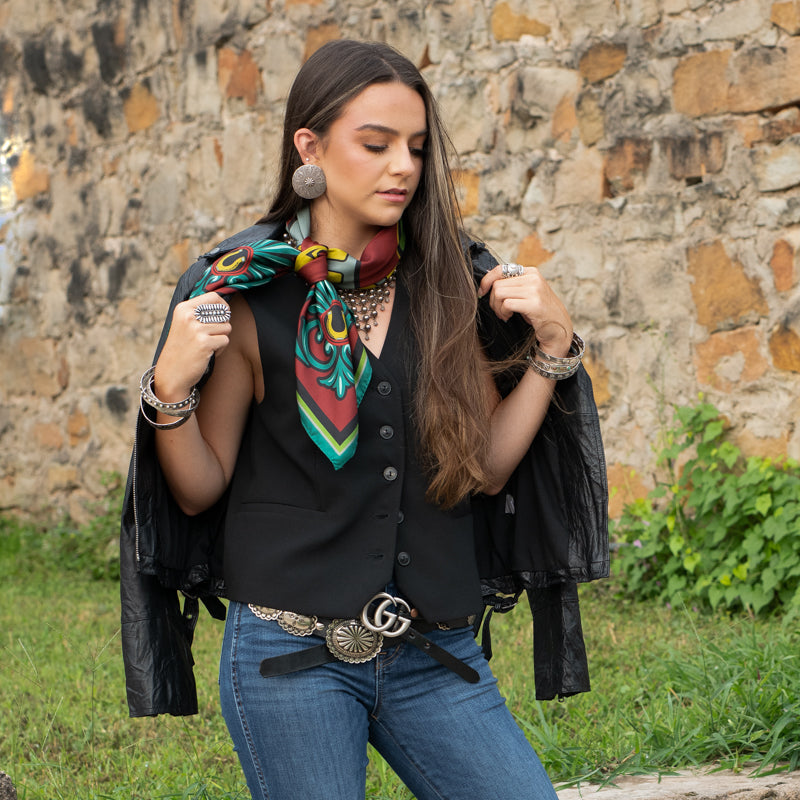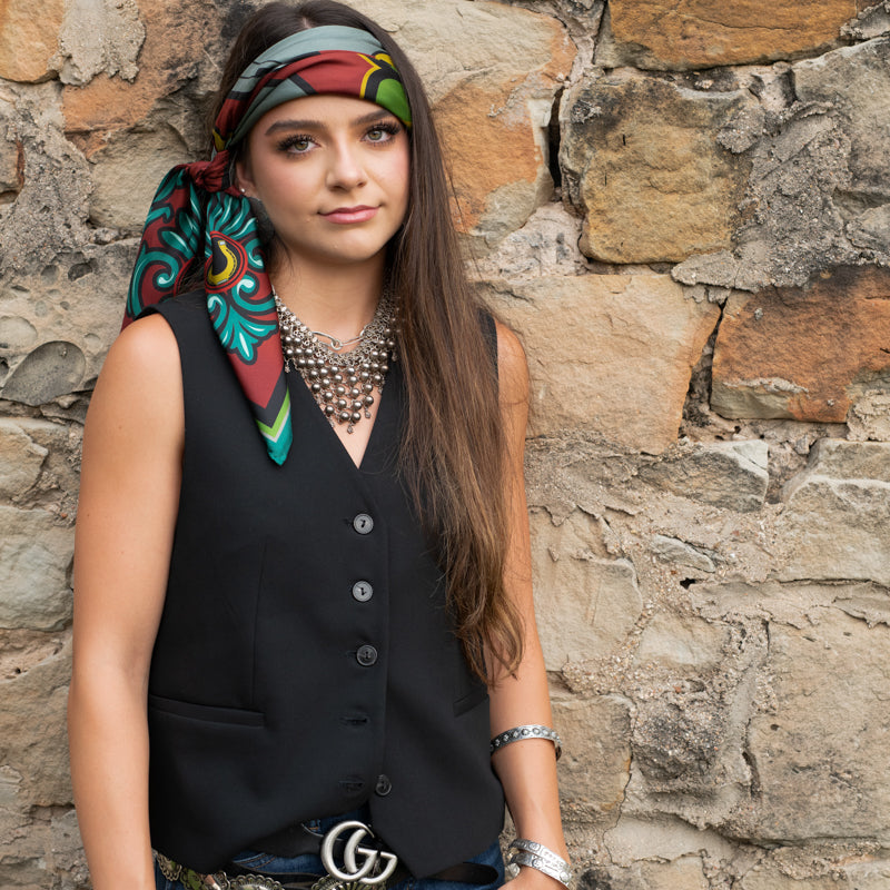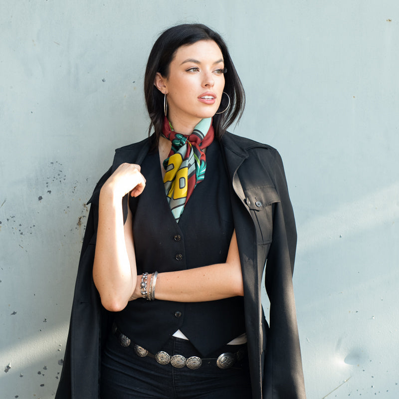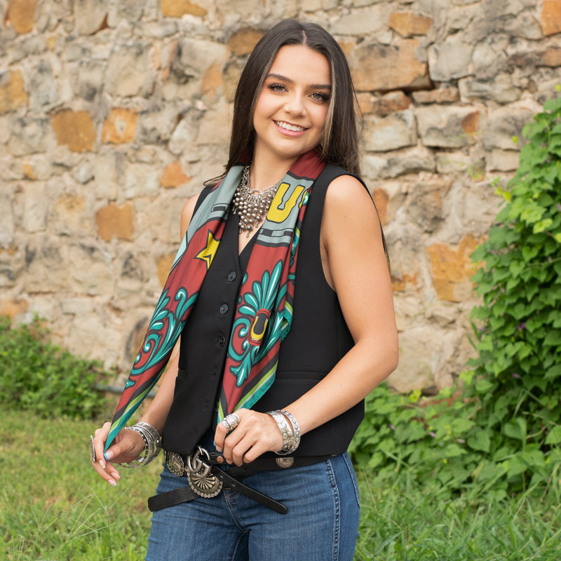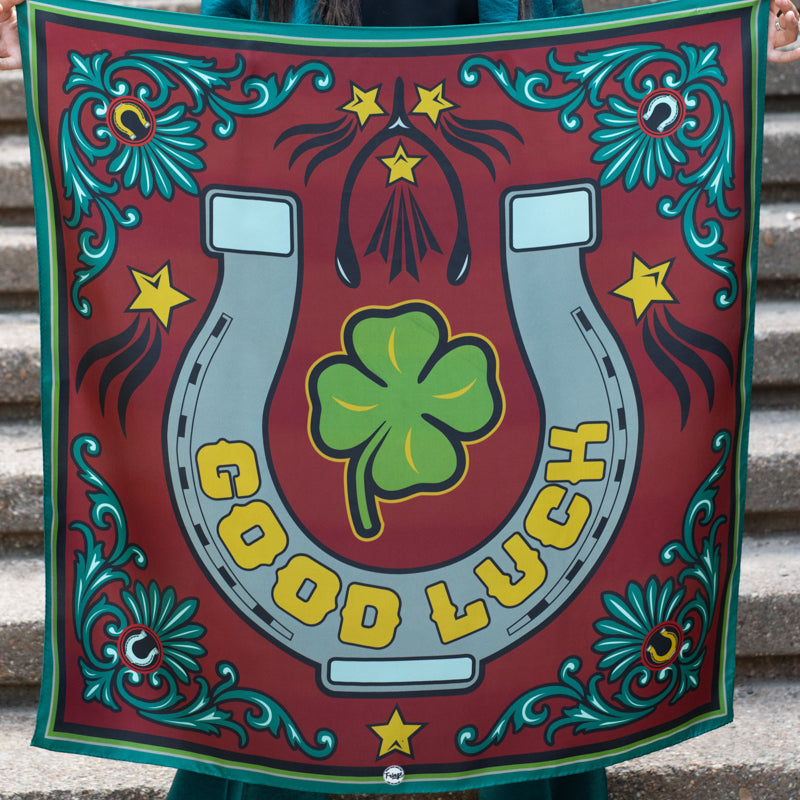 The The Lucky Horseshoe comes in our Long-Tall size and is 100% Satin Silk. Inspired by one of my friend's antique collectibles and brought to life by another artist friend, Ron Bonge. This pop culture inspired scarf is so fun, but works itself into any dressy outfit with ease. Three great colors to choose from.