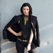 Tips: Just tie one on! Have fun mixing this with denim, screened t's and tennis shoes. Then make an easy transition into evening with your favorite black blazer and heels or dressy boots.