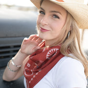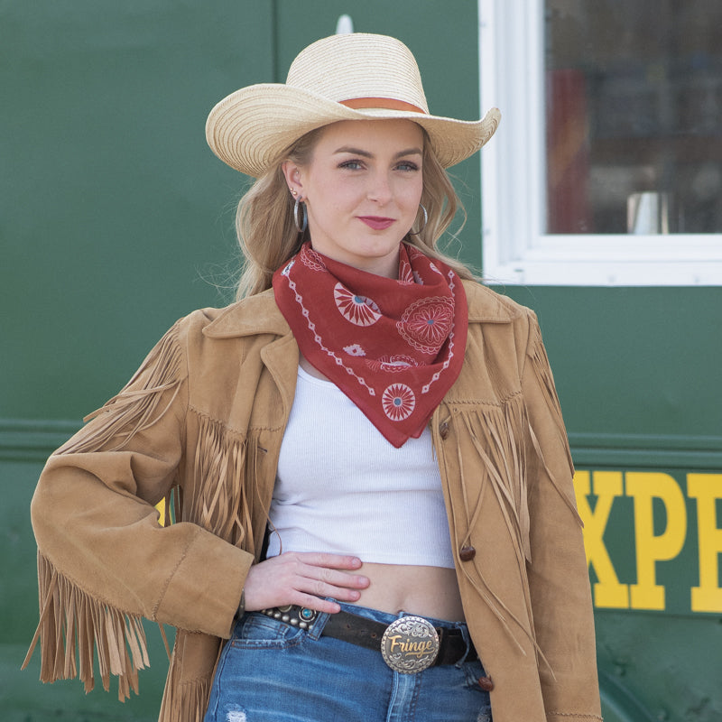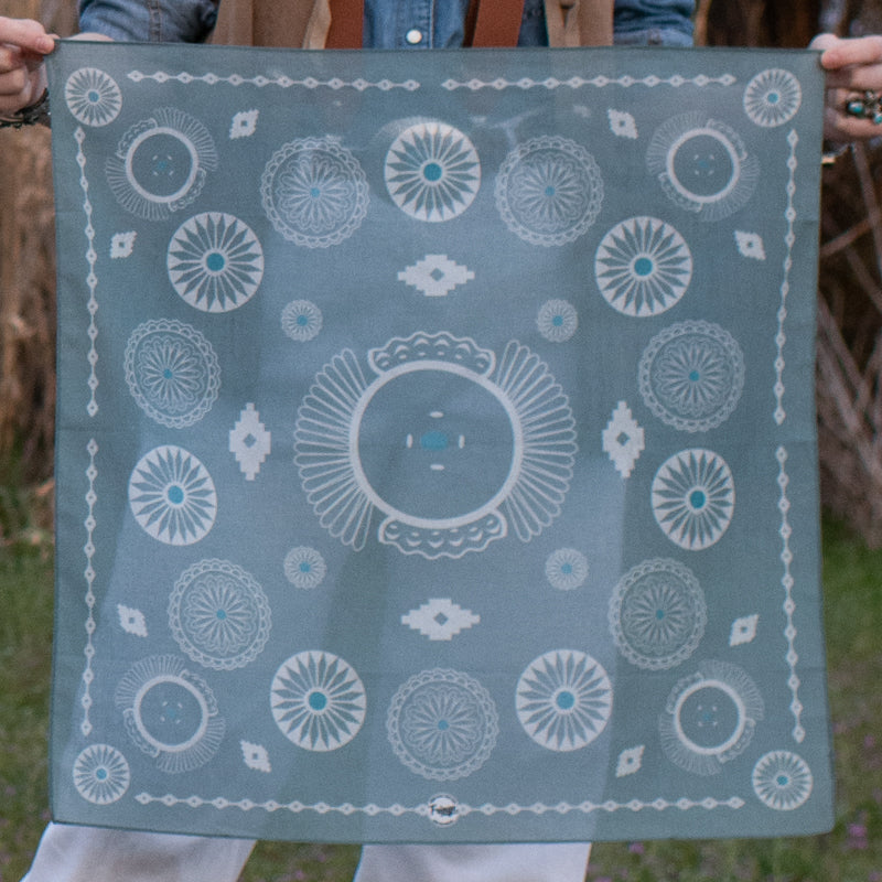 Our all new 100% cotton "Taos" Bandana has a traditional bandana feel with iconic concho and aztec graphics. This replaces the paisley with a traditional iconic feel from the Southwest. All with a distressed effect applied for the perfect vintage look! Super soft with a great broke-in feel!