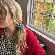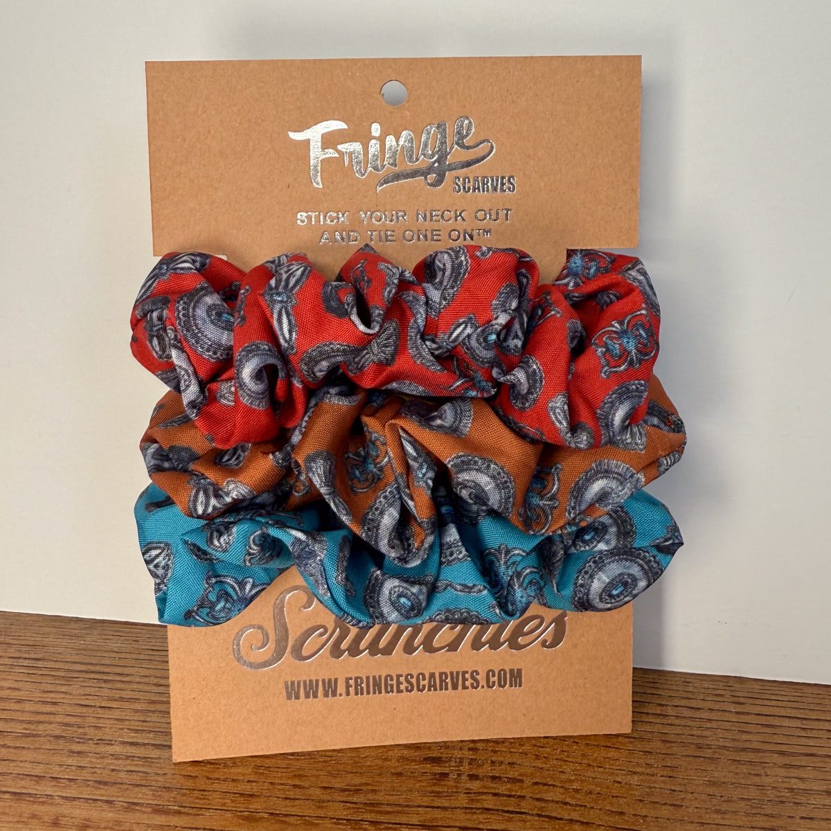 We took one of our newest patterns, the Turqs & Conchos, and made it available in your favorite Fringe Scrunchies! Comes in a set of 3 versatile colors, red, orange and turquoise.