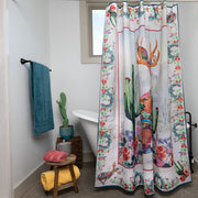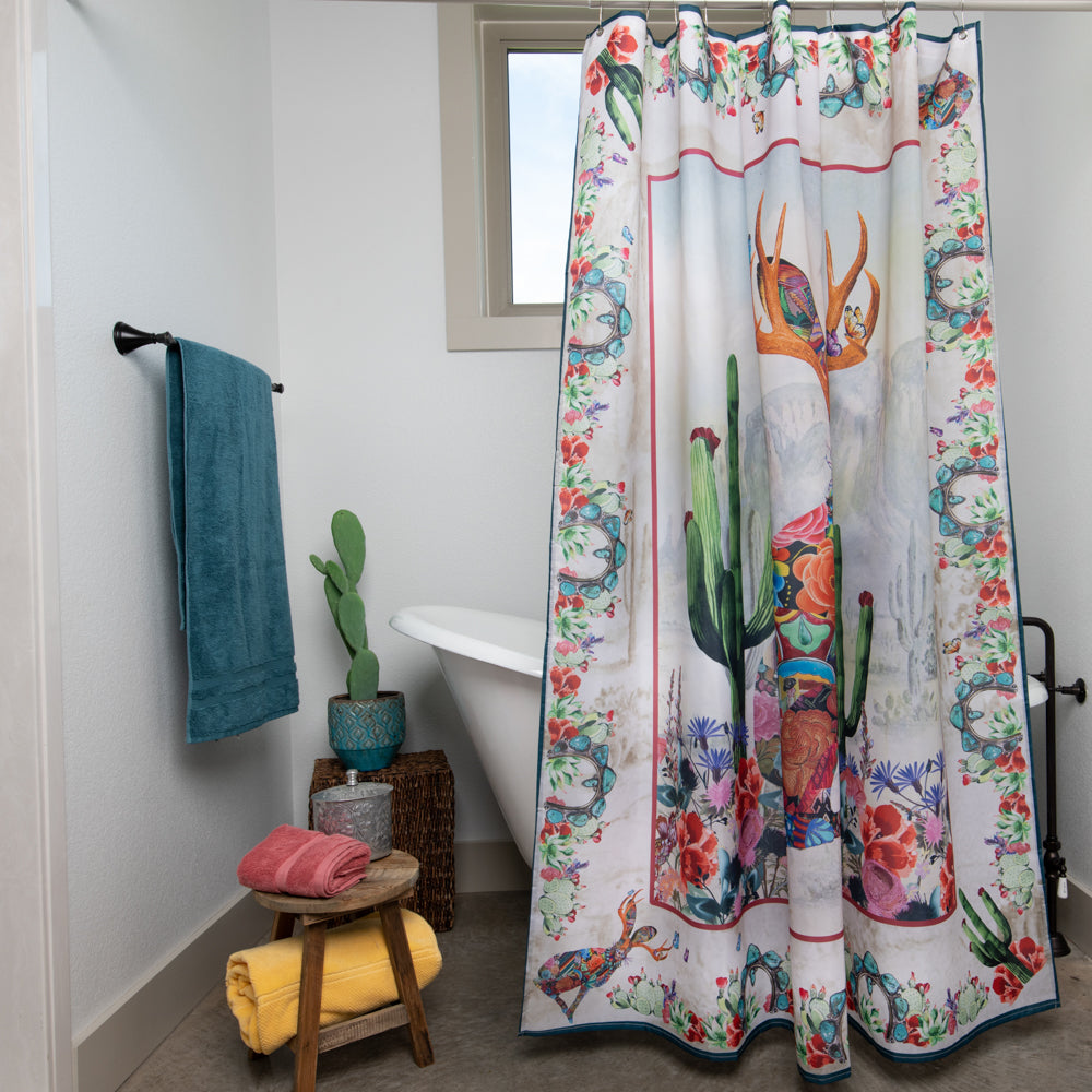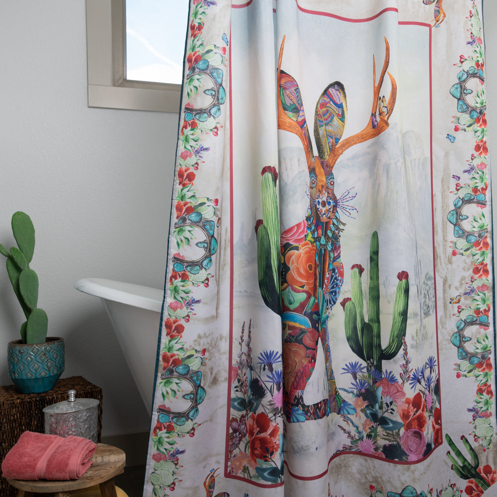 Bring some of your favorite Fringe Scarf designs HOME! The Jewelled Jackalope is one of our best selling scarves. It's now part of our new shower curtain lineup to help liven up your bathroom. We love the Jewelled Jackalope for a fun, Out-West addition to your home. It makes a great gift for a little girls bathroom or your master!