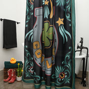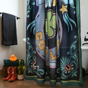 *100% polyester fabric - machine washable. Iron on polyester setting. Comes with set of silver shower rings. Size - 70” x 70.5”.