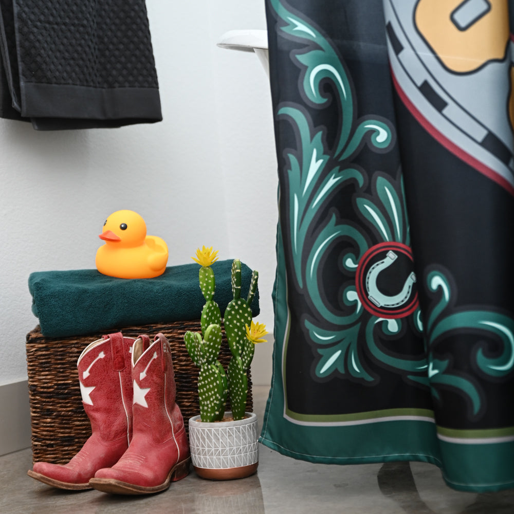 Bring some of your favorite Fringe Scarf designs HOME! The Lucky Horseshoe is such a fun addition to a western or non-western bathroom. Who doesn't need a little luck? Great colors and the perfect focal point!