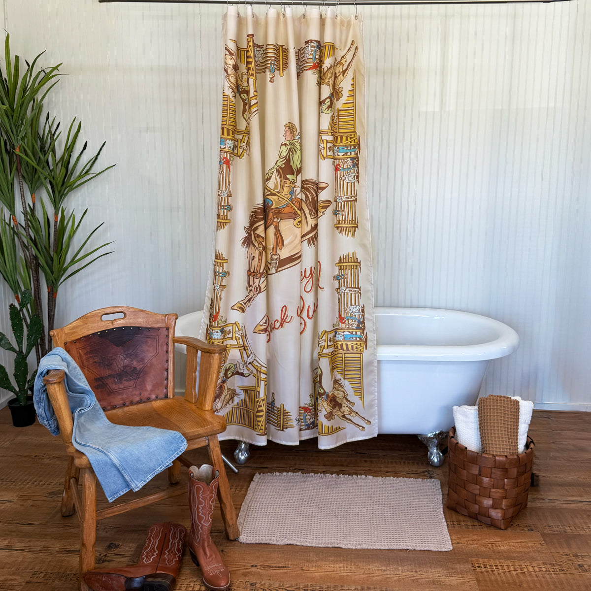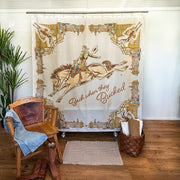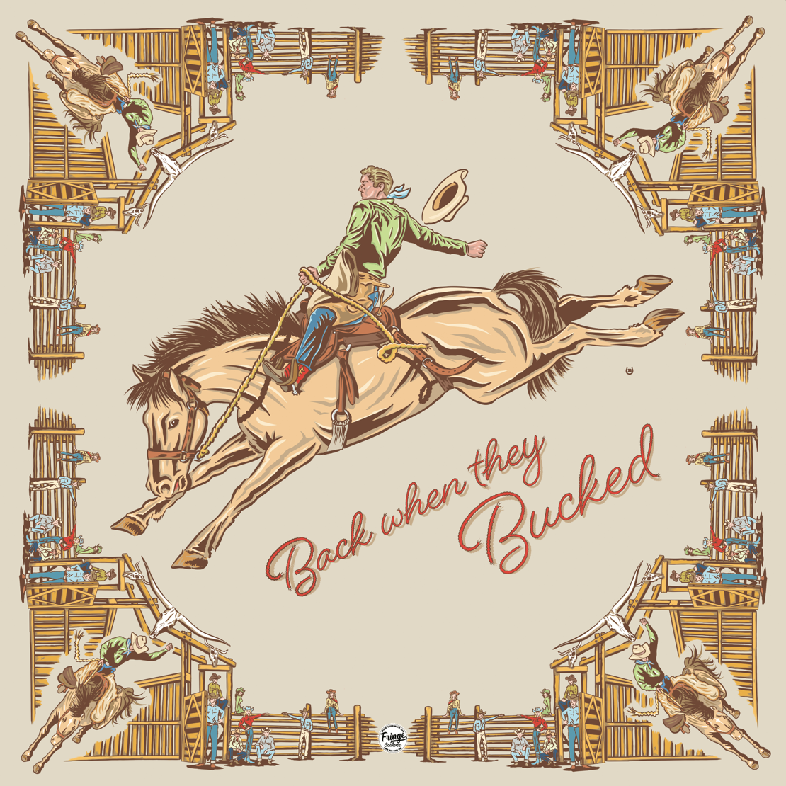 Back When They Bucked is a tribute to the rodeo’s golden era—think 1940s–50s bronc riders, bucking chutes, and mid-century swagger. With its hand-drawn details and classic composition, this scarf captures the spirit of a time when the arena was raw, rowdy, and full of glory. A must-have for collectors who appreciate tradition with bold style.