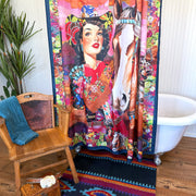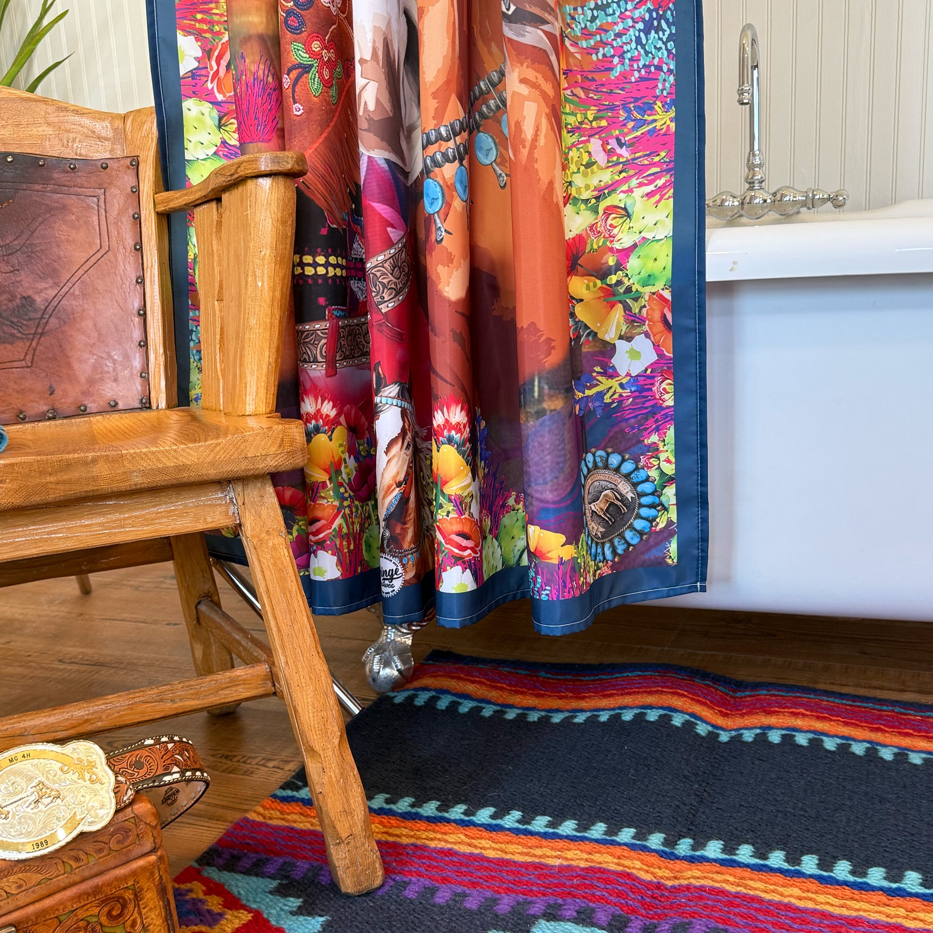 Designed by Amy Moorhouse for Fringe Scarves, Queen of the Rodeo is a vibrant tribute to Western glamour. Featuring a striking cowgirl and her loyal horse, this bold design blends vintage rodeo charm with colorful desert florals and intricate details.