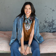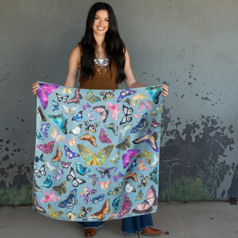 The Butterflies comes in our Long-Tall and is also available our cotton/silk bandana! A request from some of our customers, this fun multi-colored scarf with chambray background can really dress up a suit jacket or make a statement on denim.