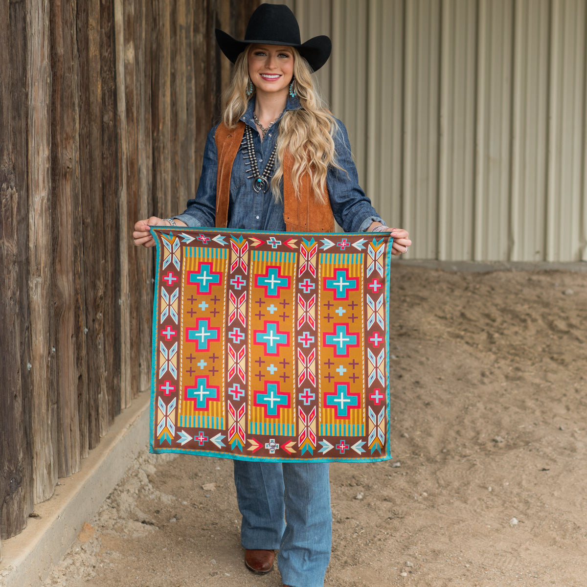 Earthwork is a bold nod to ancient geometry and grounded design. With striking symmetry and rich, earthen tones, this scarf brings structure and movement to your look. Crafted in our signature satin silk with a hand-rolled hem—tie one on and wear the story.