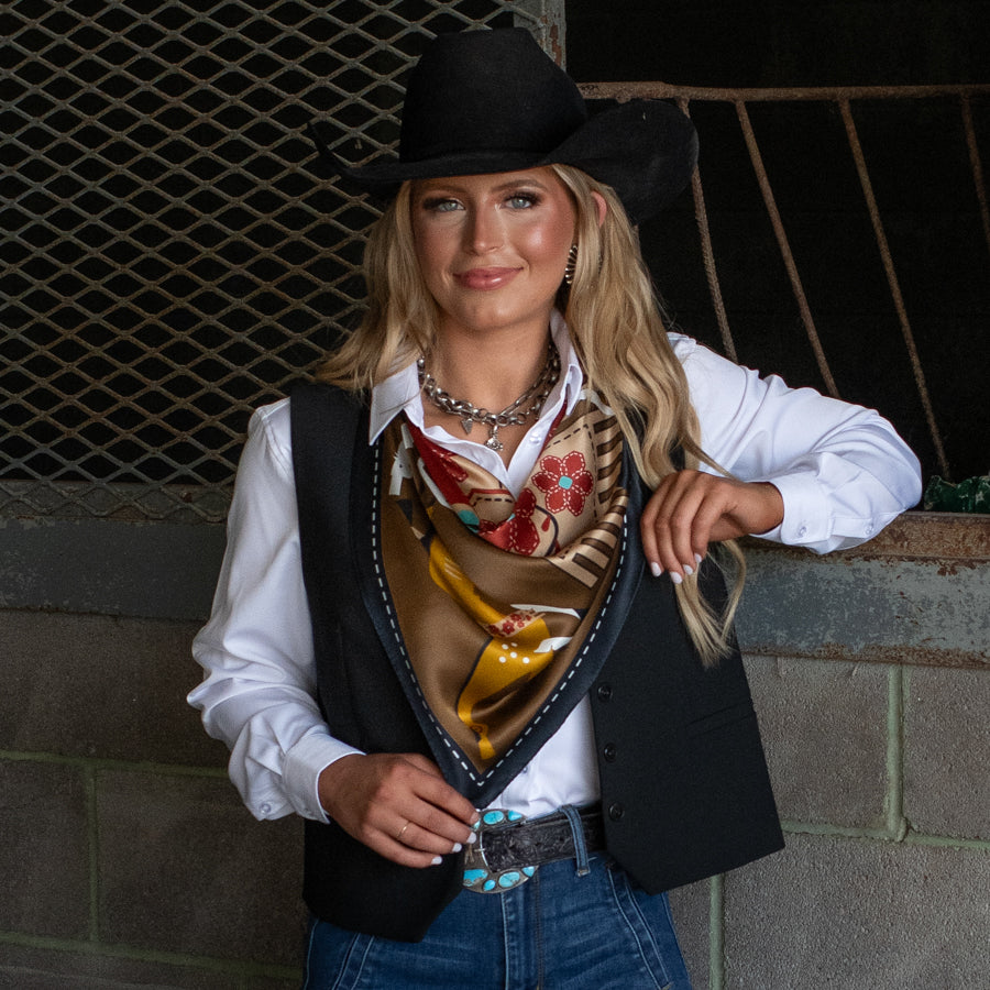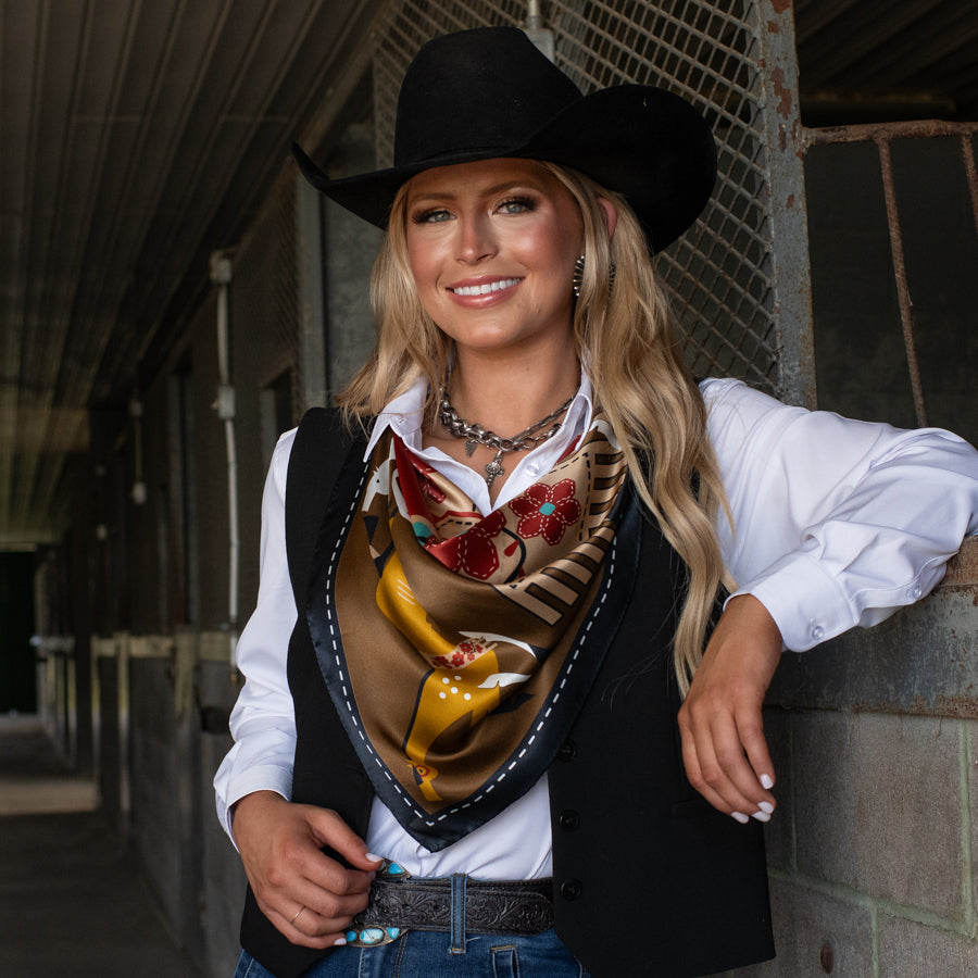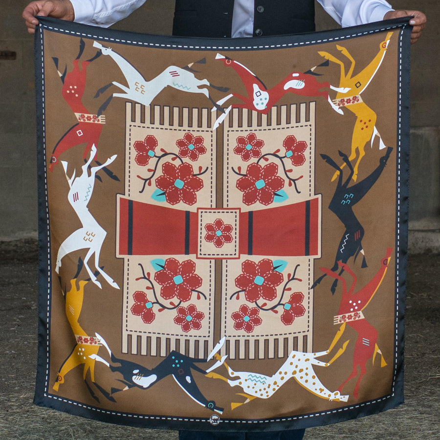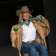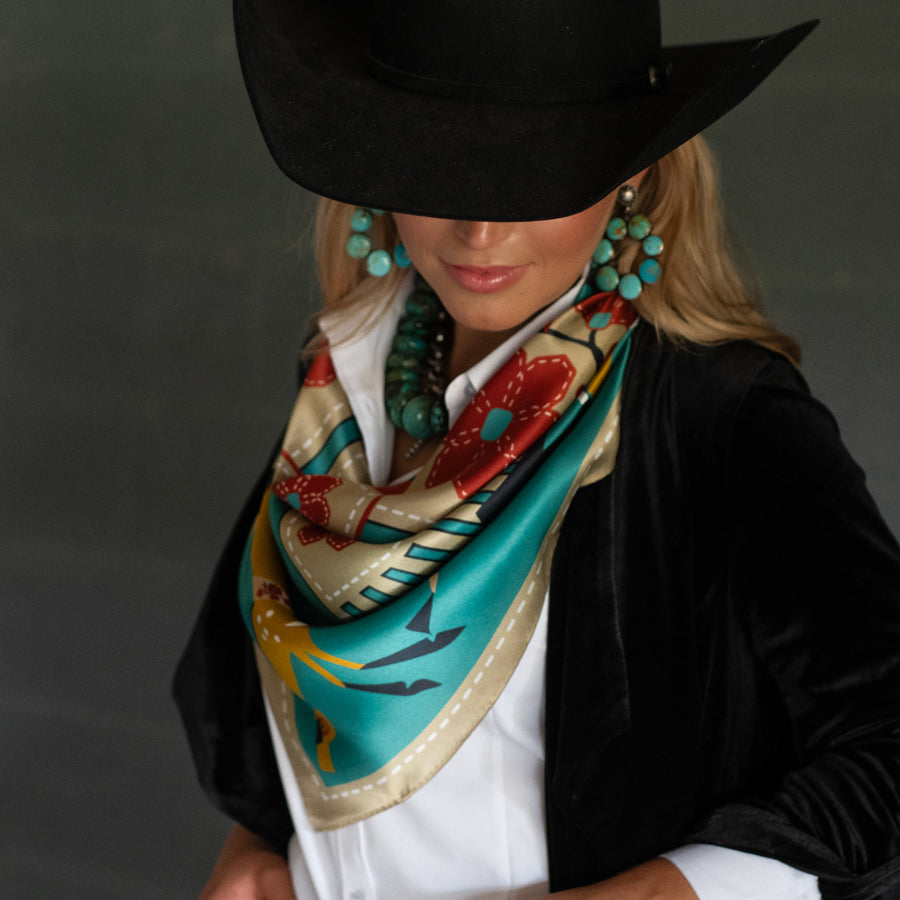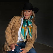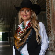 The Journey is a special scarf with the beautiful feel of the plains. Gorgeous colors that bring a touch of class to any outfit. Great with all shades of leather, black, white or throw on with a tshirt and jeans for a more casual look.