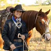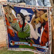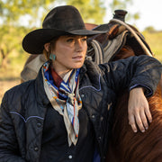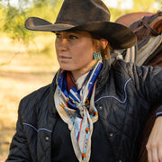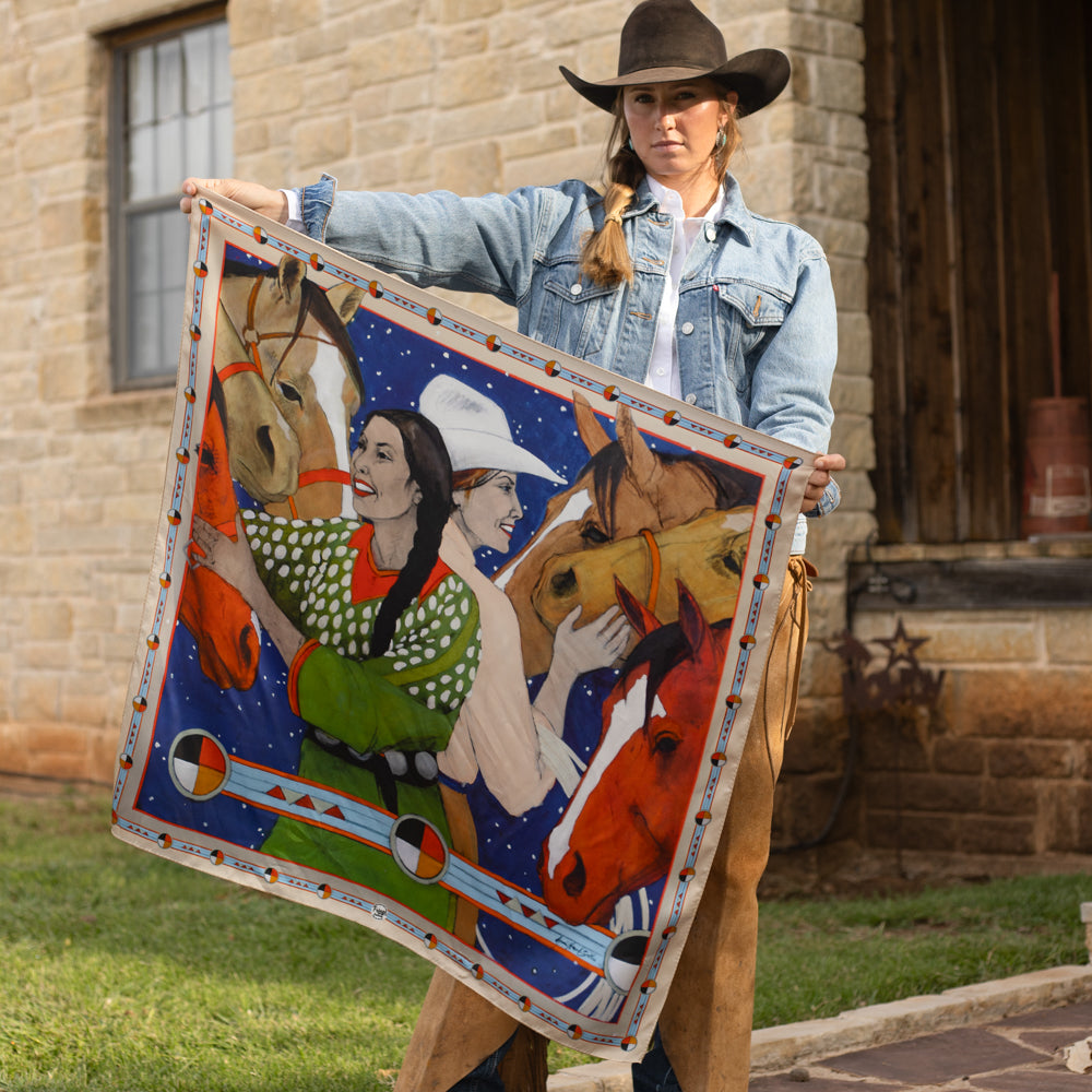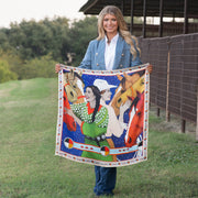 The Moonlight Rendezvous by popular artist Donna Howell-Sickles. This bright and beautiful scarf is full of all the colors we love! It wears beautifully and continues the color story to the edge, with a turquoise border that showcases primary pops of color. If you love Donna's art, this will be a favorite!