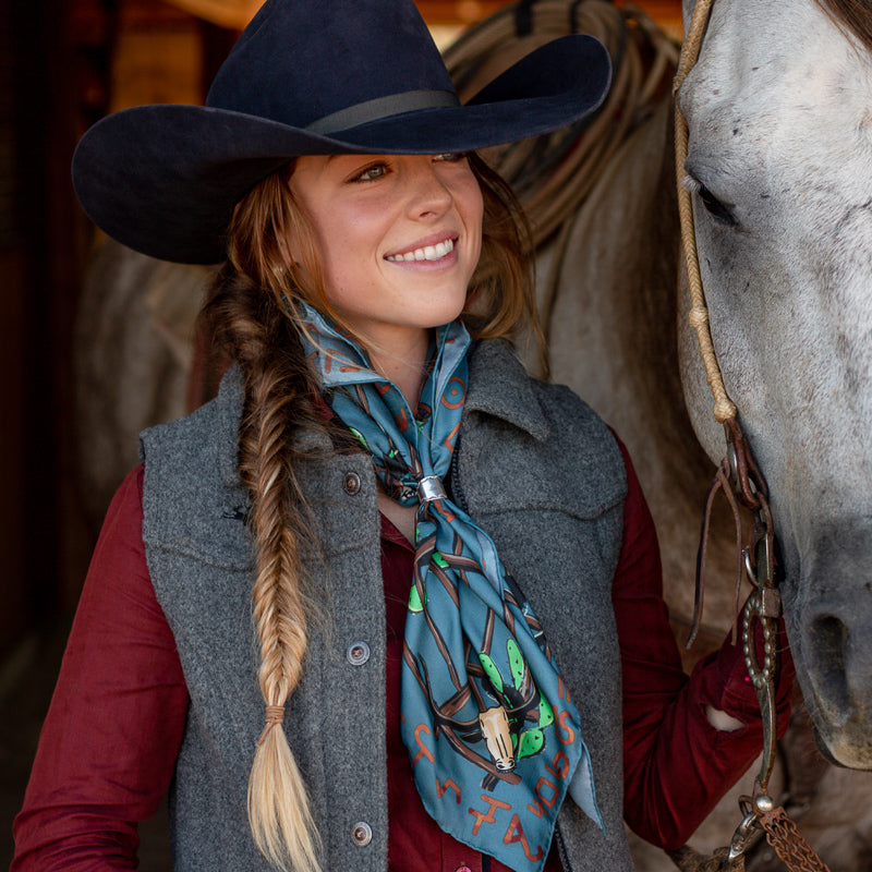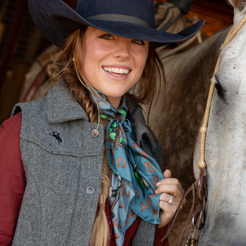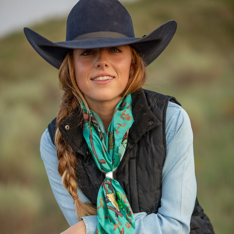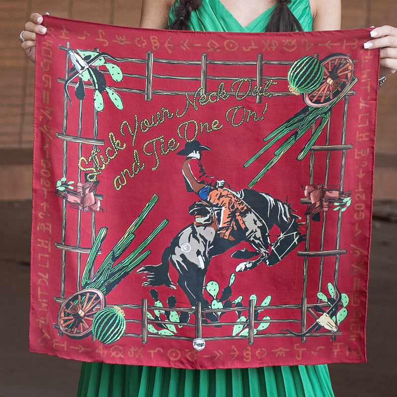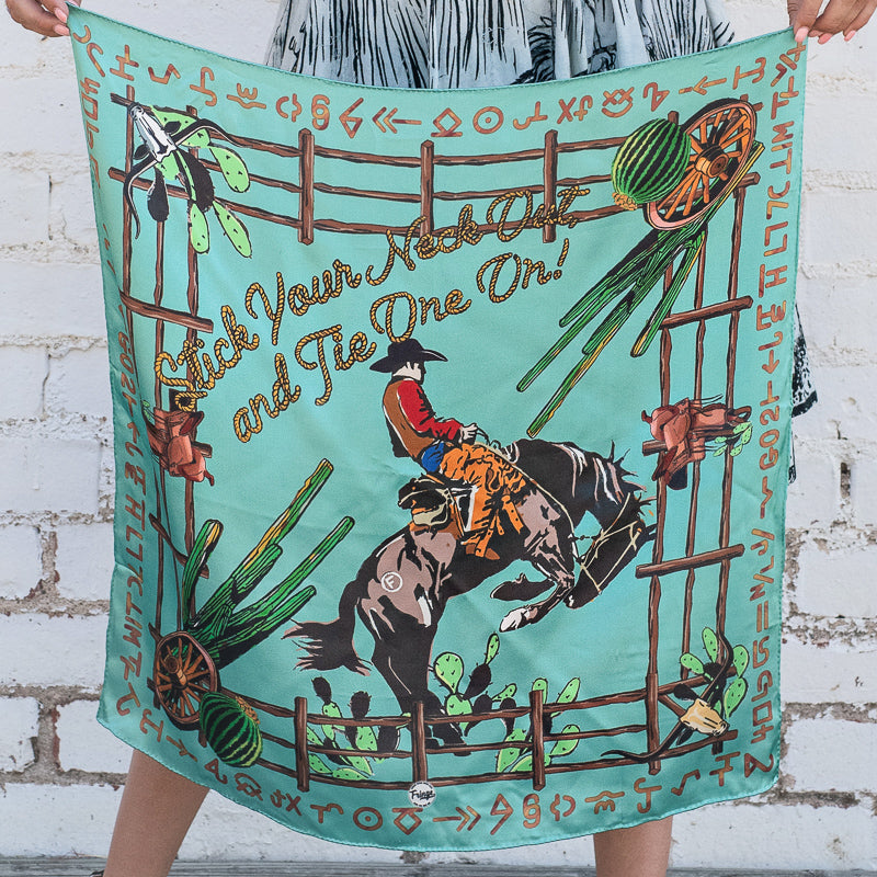 We had been wanting to release a Stick Your Neck Out And Tie One On wild rag for some time. I went to my friend Ron Bonge for a little help. He drew these great characters and we put them together to create one of my favorite little retro inspired scarves! Growing up in Northwest South Dakota, I wanted to use our neighbor's brands to adorn the edges of this design.