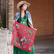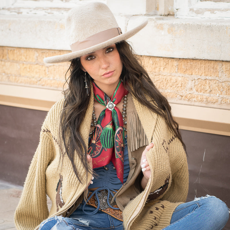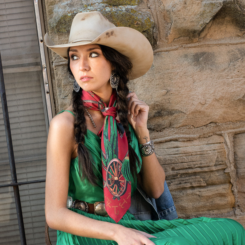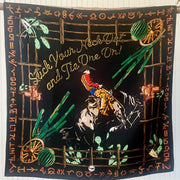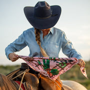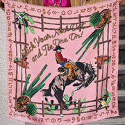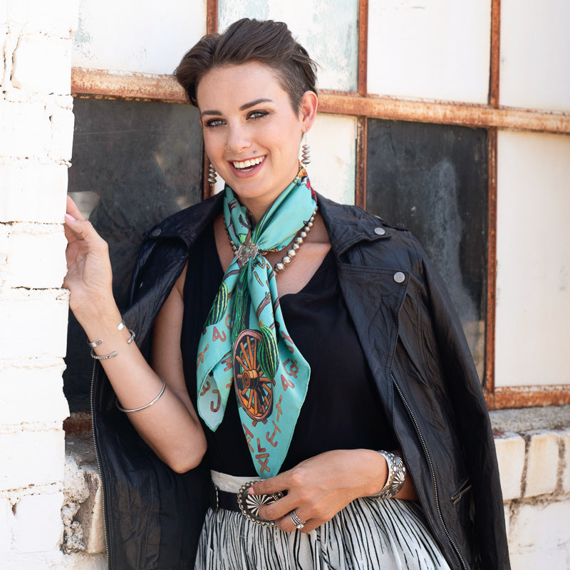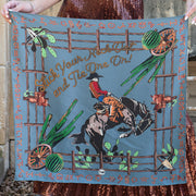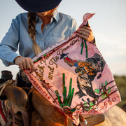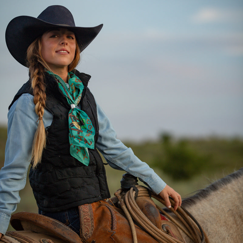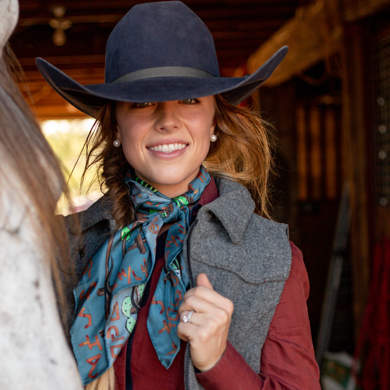 We had been wanting to release a Stick Your Neck Out And Tie One On wild rag for some time. I went to my friend Ron Bonge for a little help. He drew these great characters and we put them together to create one of my favorite little retro inspired scarves! Growing up in Northwest South Dakota, I wanted to use our neighbor's brands to adorn the edges of this design.